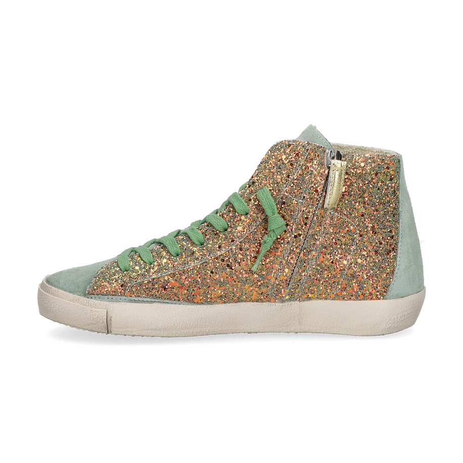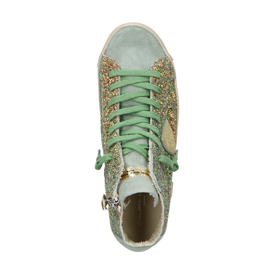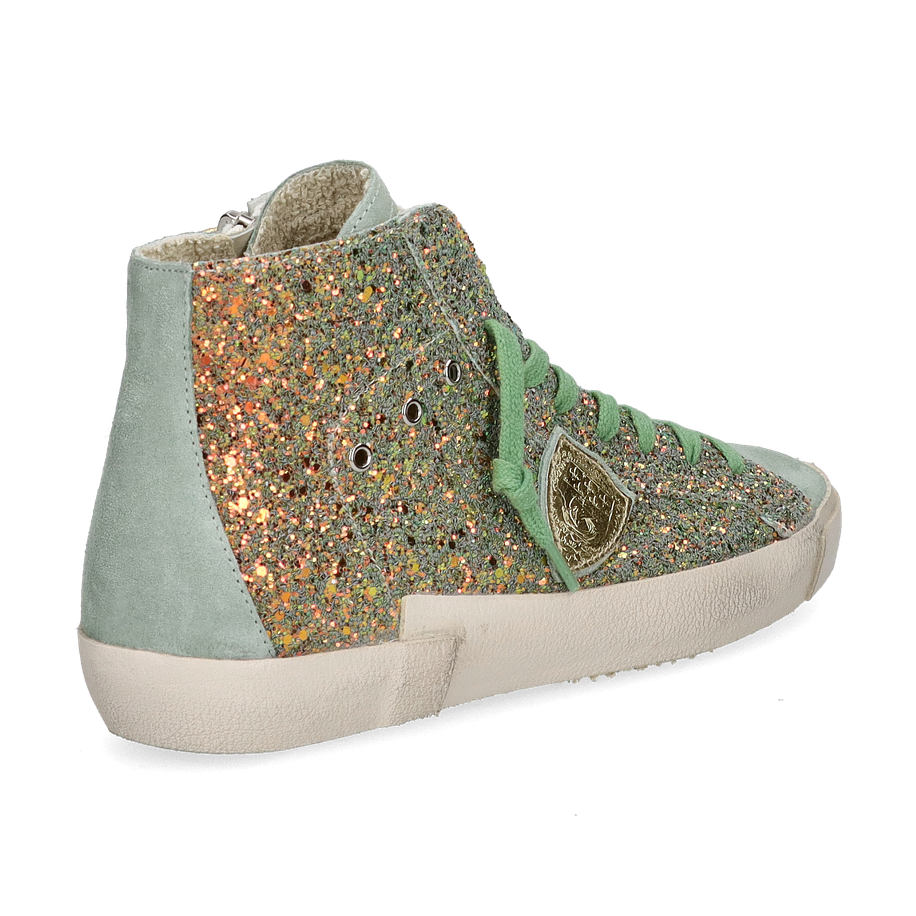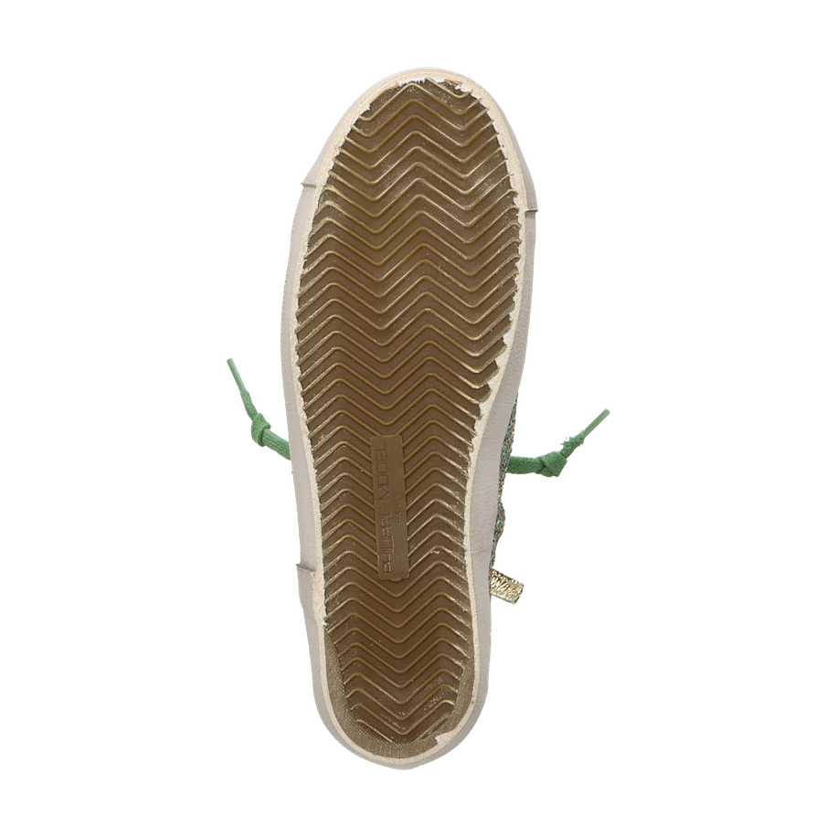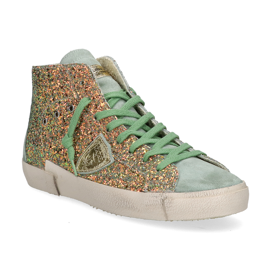 Preis inkl. MwSt.Der PRSX HIGH Sneaker von Philippe Model für Damen präsentiert sich in einem auffälligen Design, das durch seine grüne Farbgebung und die glitzernden Details besticht. Der hohe Schaft und die grünen Schnürsenkel verleihen diesem Schuh einen modernen und zugleich verspielten Look. Die Kombination aus Leder und sonstigem Material im Obermaterial sorgt für eine ansprechende Optik, während das textile und lederne Innenfutter Komfort und Atmungsaktivität bietet.