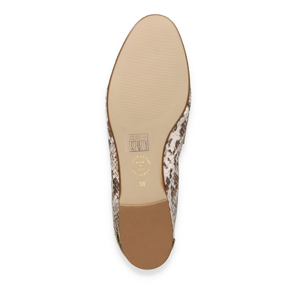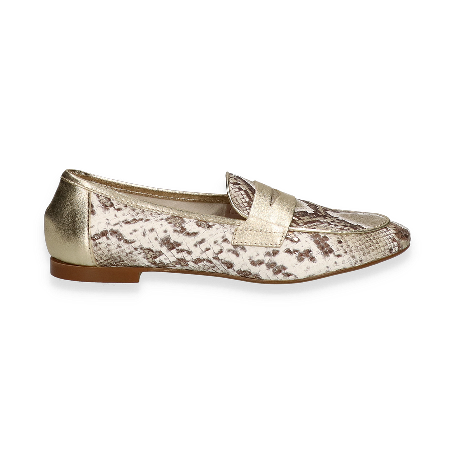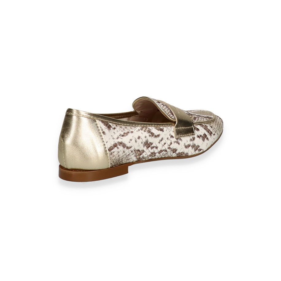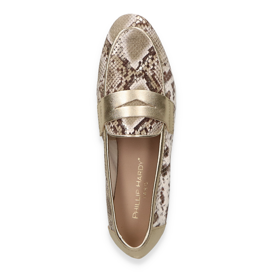 Preis inkl. MwSt.Die Phillip Hardy ADELE Slipper für Damen präsentieren sich in einem eleganten Design, das durch die Kombination von beige und goldfarbenem Leder in Reptilienoptik besticht. Diese stilvollen Schuhe verleihen jedem Outfit eine luxuriöse Note und sind ideal für modebewusste Frauen, die Wert auf Qualität und Ästhetik legen. Der flache Absatz sorgt für Komfort, während das raffinierte Muster einen Hauch von Exklusivität bietet.