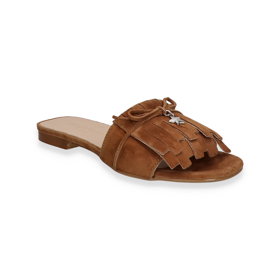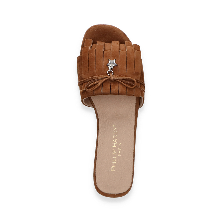 Preis inkl. MwSt.Die Phillip Hardy Pantoletten für Damen präsentieren sich in einem eleganten Mittelbraun, das sich nahtlos in jede Garderobe einfügt. Die raffinierte Fransenverzierung und der dekorative Sternanhänger verleihen diesen Schuhen einen Hauch von Individualität und Stil. Der flache Absatz von 1,5 cm sorgt für angenehmen Tragekomfort, während das offene Design ideal für warme Tage ist. Die hochwertige Verarbeitung und das ansprechende Design machen diese Pantoletten zu einem unverzichtbaren Begleiter für stilbewusste Frauen.