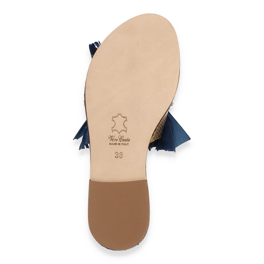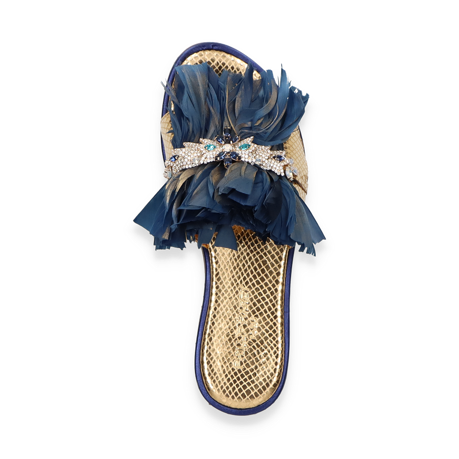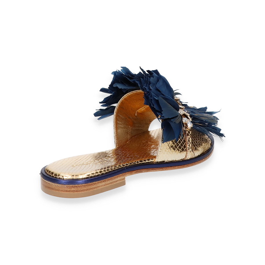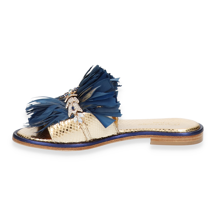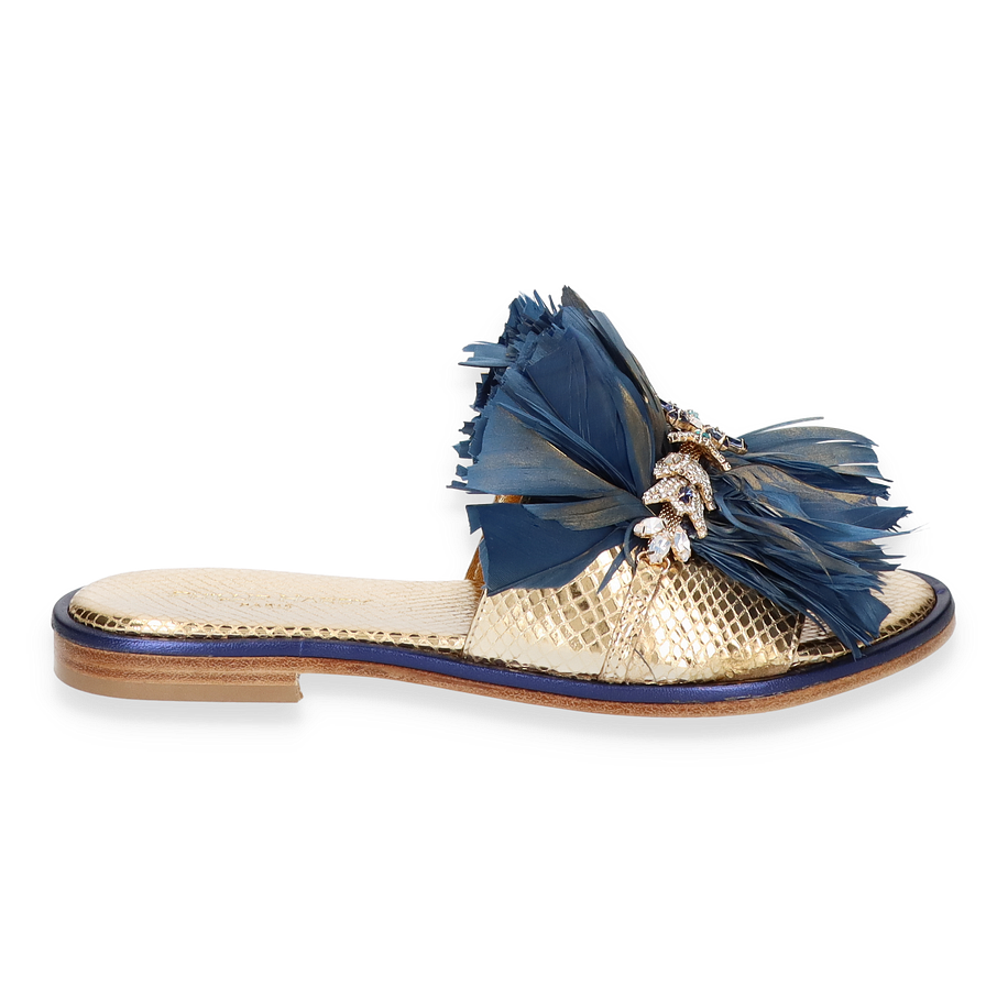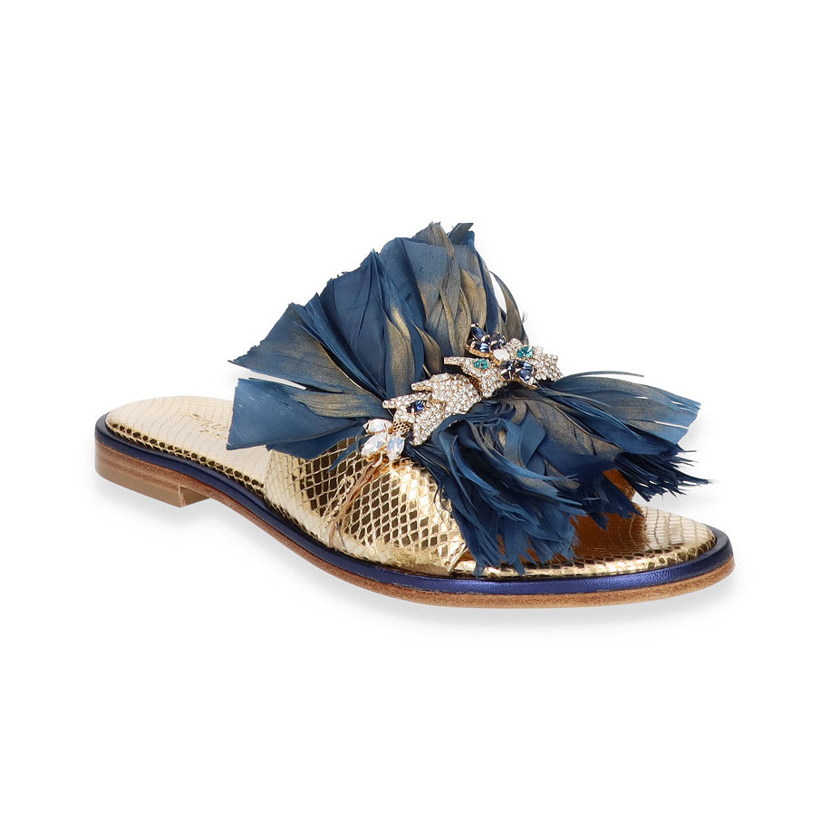 Entdecken Sie die exquisiten Pantoletten von Philip Hardy, die mit ihrem luxuriösen Design beeindrucken. Diese Schuhe für Damen präsentieren sich in einem eleganten Goldton und sind mit auffälligen blauen Federn verziert, die einen Hauch von Glamour verleihen. Die funkelnden Details auf dem Obermaterial setzen stilvolle Akzente und machen diese Pantoletten zu einem echten Blickfang. Die Kombination aus Leder, Textil und sonstigen Materialien sorgt für eine einzigartige Optik, die sowohl modern als auch zeitlos ist.