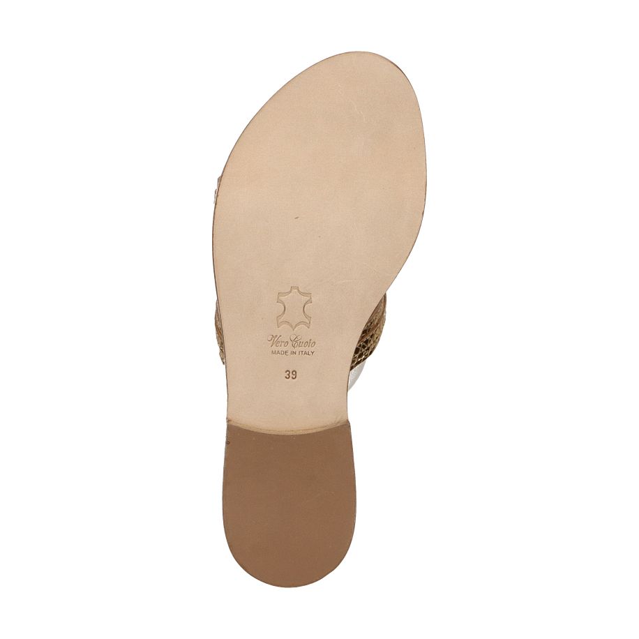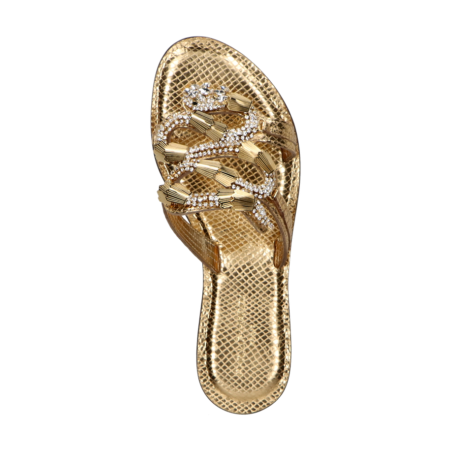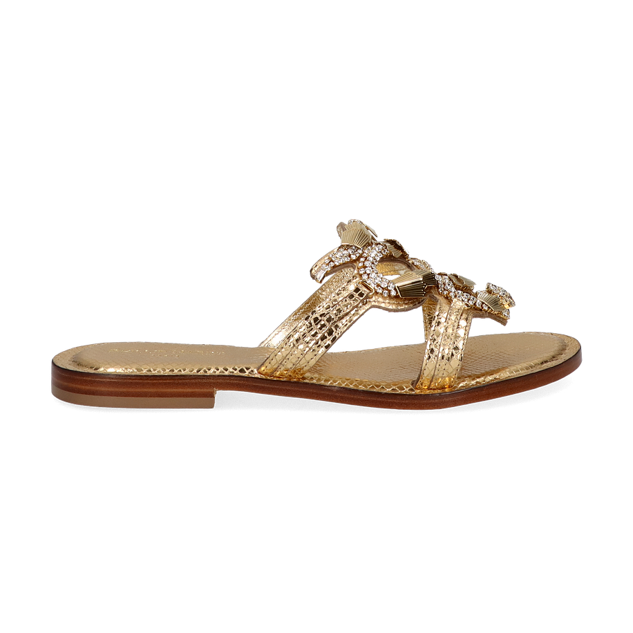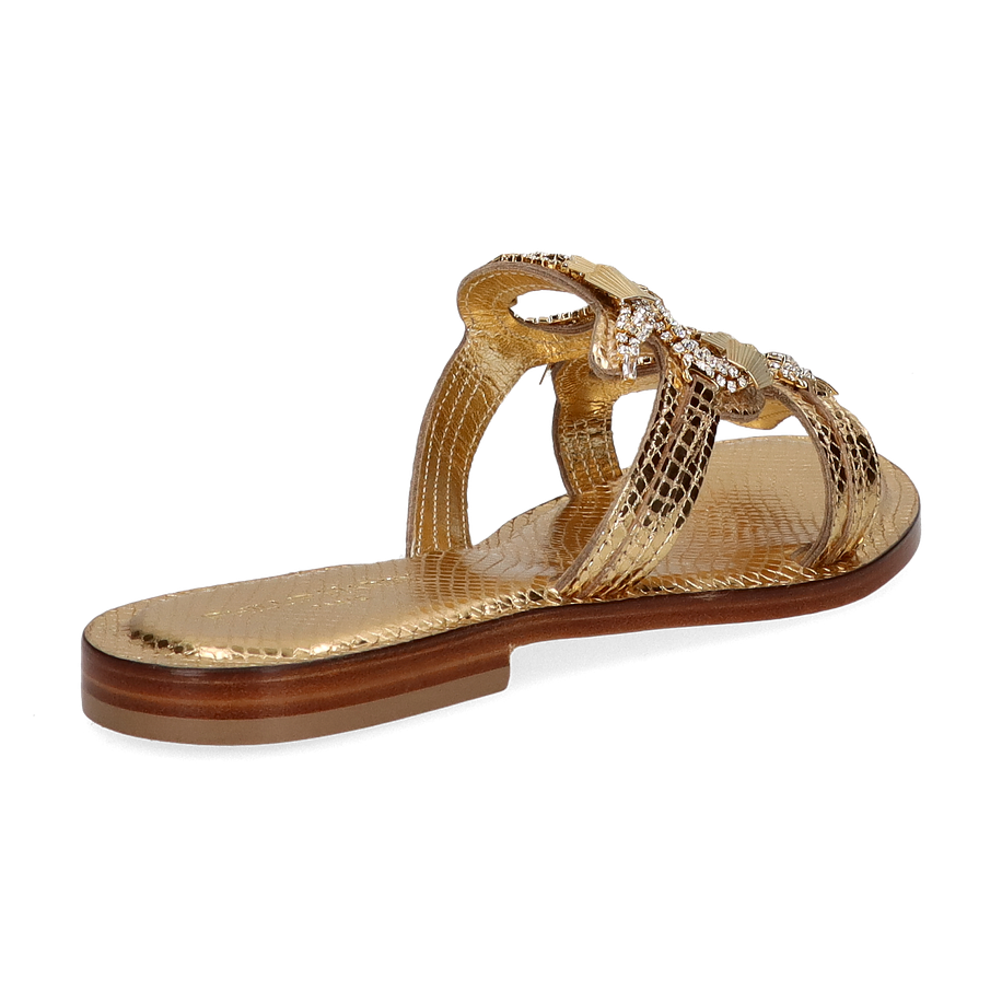 Preis inkl. MwSt.Die Phillip Hardy Pantoletten für Damen präsentieren sich in einem luxuriösen Goldton, der jedem Outfit einen Hauch von Eleganz verleiht. Das Design besticht durch seine kunstvoll gestalteten Riemen, die mit funkelnden Details verziert sind und so für einen glamourösen Auftritt sorgen. Der flache Absatz von 2 cm bietet optimalen Tragekomfort, während die hochwertige Verarbeitung die Exklusivität dieser Pantoletten unterstreicht.
