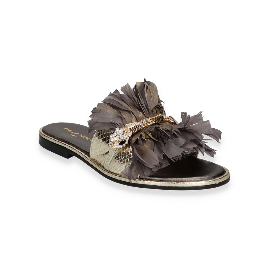 Preis inkl. MwSt.Die Phillip Hardy Pantoletten für Damen präsentieren sich in einem auffälligen Design, das Eleganz und Extravaganz vereint. Der silberne und bunte Farbton des Obermaterials aus Leder und sonstigem Material zieht alle Blicke auf sich. Die dekorativen Details und die verspielten Fransen verleihen den Schuhen einen einzigartigen Charakter, der sowohl für besondere Anlässe als auch für stilvolle Alltagslooks geeignet ist.