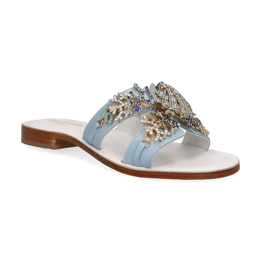 Preis inkl. MwSt.Die Phillip Hardy Pantoletten für Damen präsentieren sich in einem eleganten Blau und sind ein echter Blickfang. Das Design besticht durch aufwendige Verzierungen, die kunstvoll in das Obermaterial aus Leder integriert sind. Die flache Sohle mit einer Absatzhöhe von 2 cm sorgt für einen stilvollen Auftritt, während das weiche Lederfutter und die Ledersohle höchsten Tragekomfort garantieren. Diese Pantoletten sind die perfekte Wahl für modebewusste Frauen, die Wert auf Qualität und Stil legen.