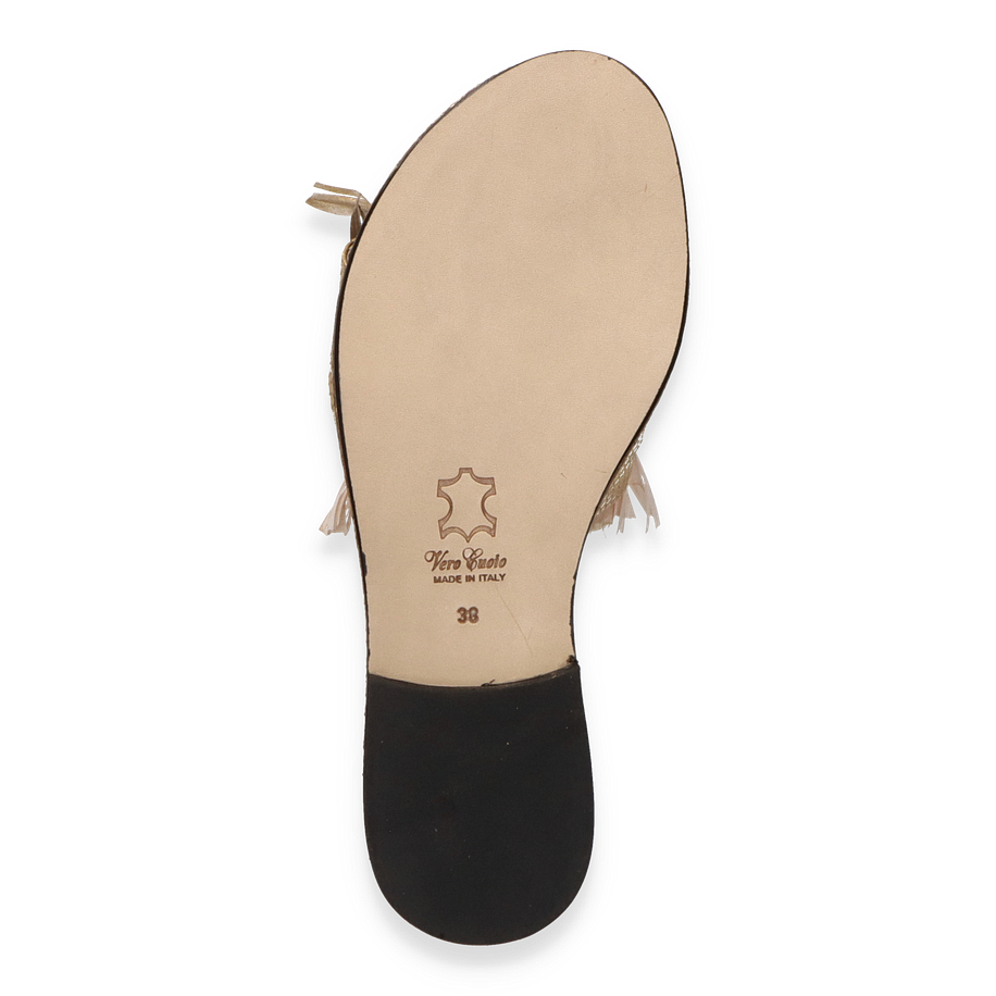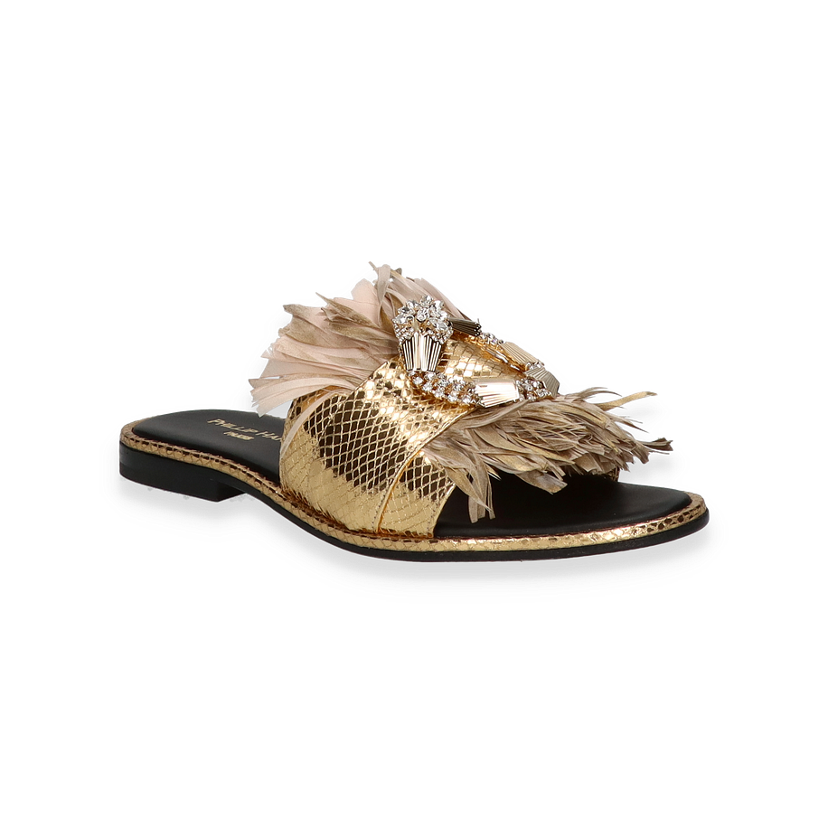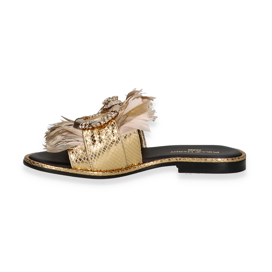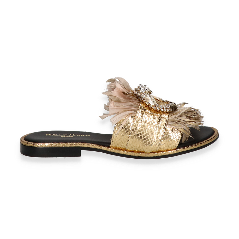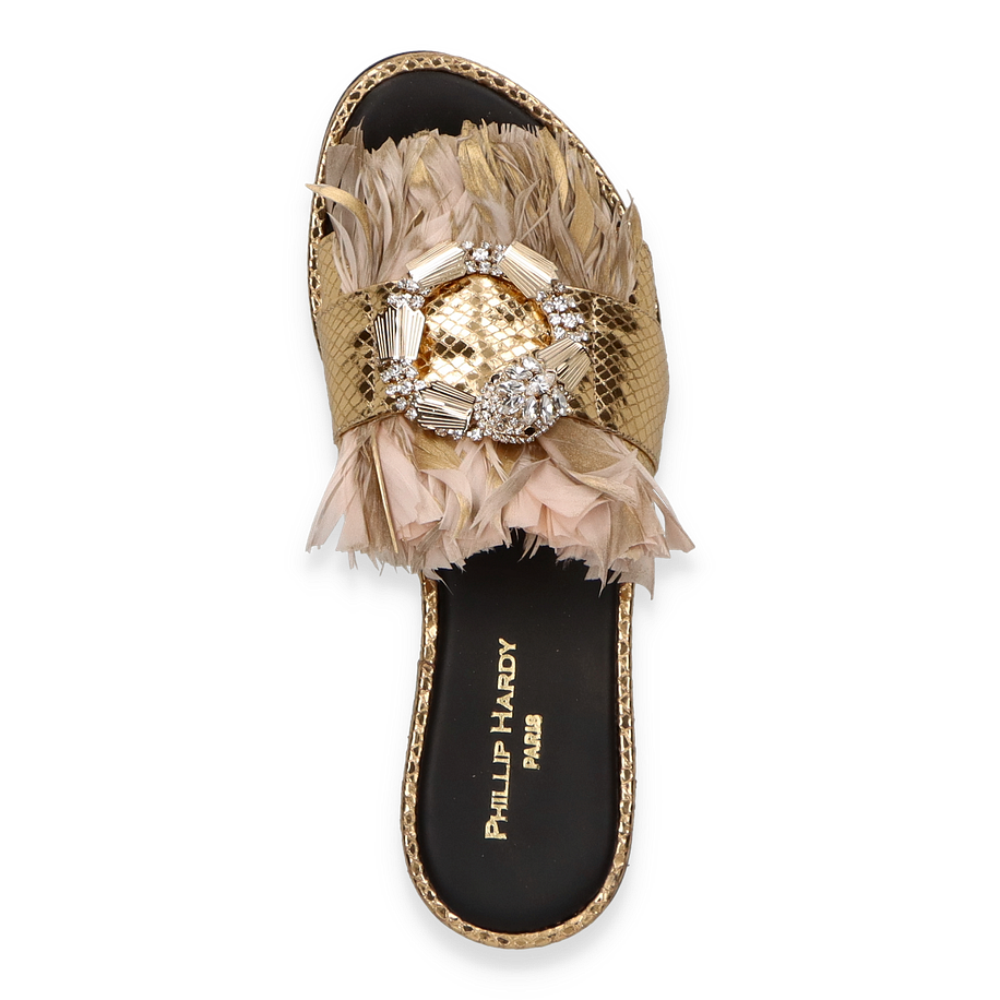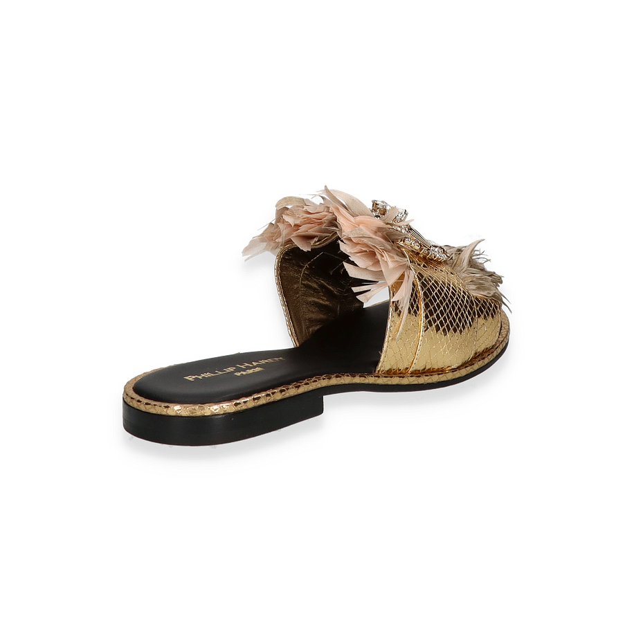 Entdecken Sie die exquisite Phillip Hardy Pantolette für Damen in einem luxuriösen Goldton. Diese stilvolle Pantolette besticht durch ihr auffälliges Design mit kunstvollen Federn und funkelnden Schmuckdetails, die jedem Outfit einen Hauch von Glamour verleihen. Die flache Sohle sorgt für einen eleganten Auftritt, während das goldene Obermaterial aus hochwertigem Leder für einen glänzenden Look sorgt. Perfekt für besondere Anlässe oder um Ihrem Alltagslook einen Hauch von Eleganz zu verleihen.