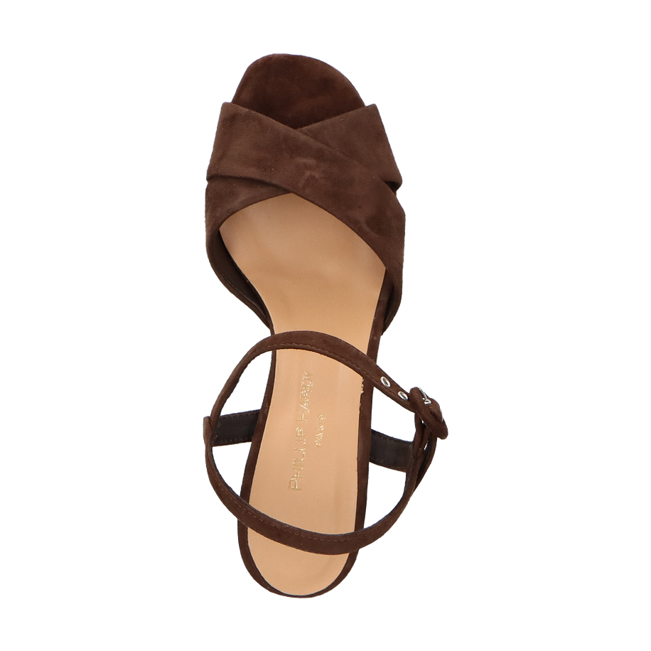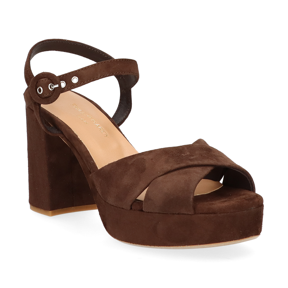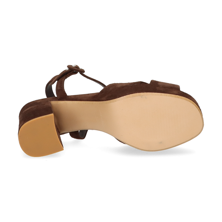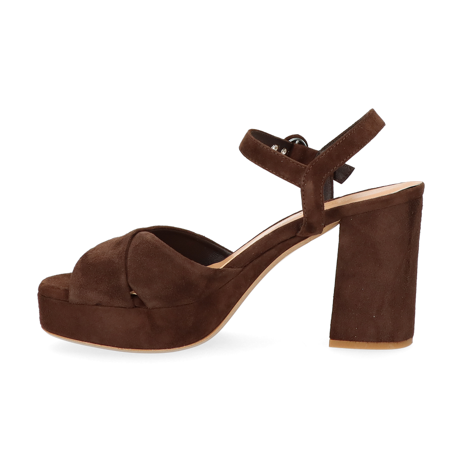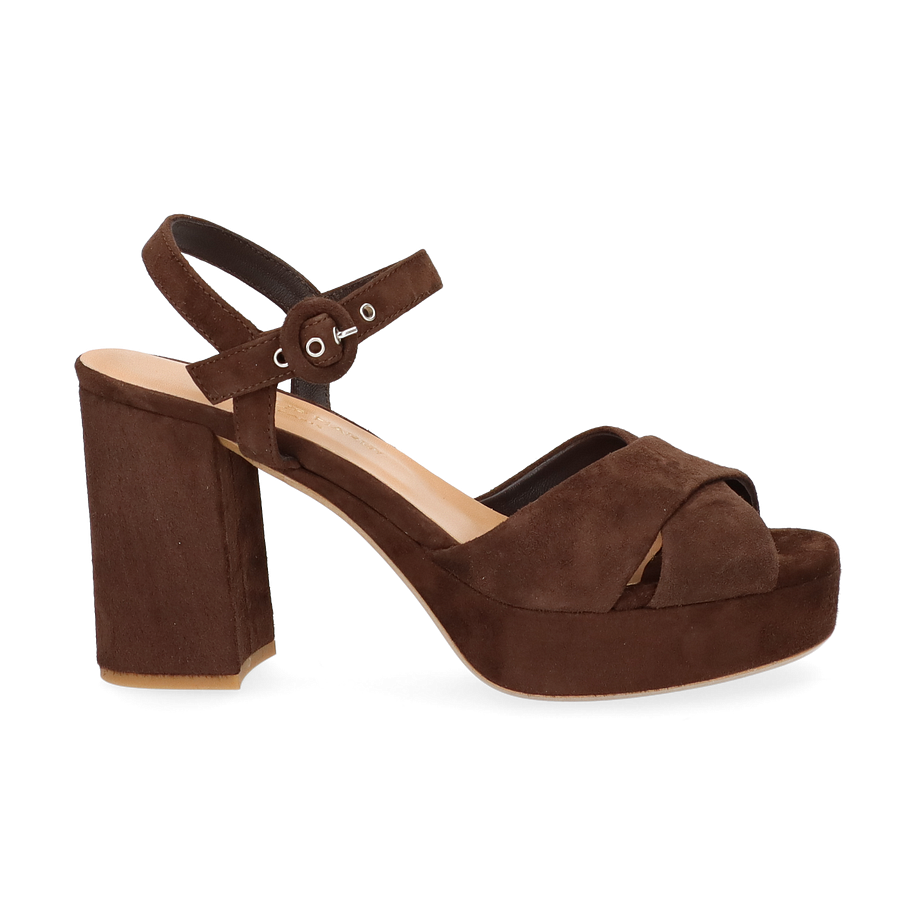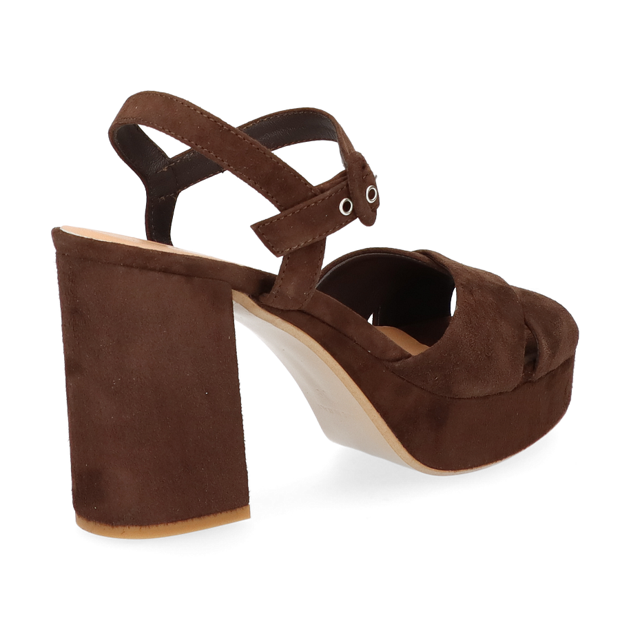 Preis inkl. MwSt.Diese eleganten Plateau-Sandalen für Damen präsentieren sich in einem tiefen Schokoladenbraun, das jedem Outfit eine raffinierte Note verleiht. Der breite Blockabsatz und die überkreuzten Riemen aus weichem Wildleder sorgen für einen stilvollen und zugleich komfortablen Auftritt. Der verstellbare Knöchelriemen mit Metallschnalle bietet sicheren Halt und unterstreicht das modische Design. Die Innensohle aus Leder gewährleistet ein angenehmes Tragegefühl, während die robuste Laufsohle für Stabilität sorgt.