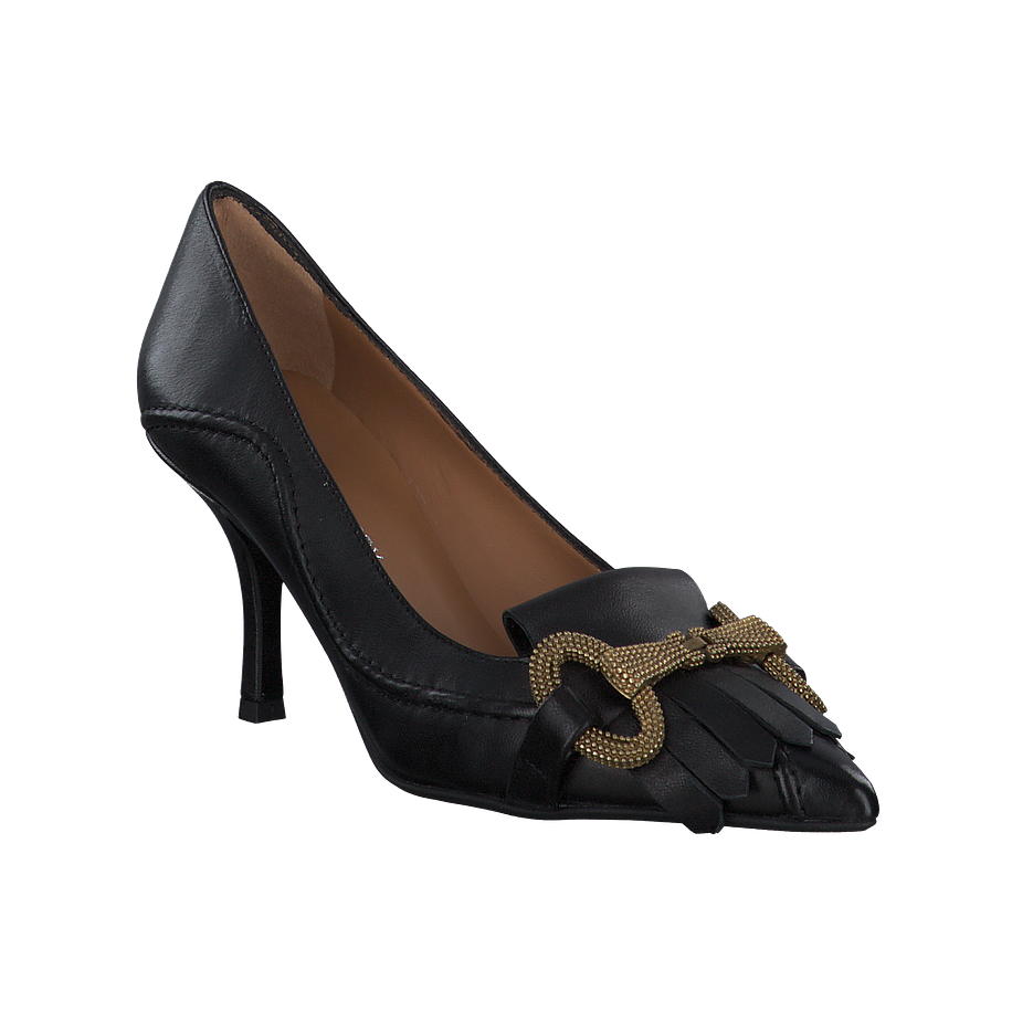 Elegant und aufregend zugleich kommen diese modischen Phillip Hardy Pumps für Damen daher und sorgen mit ihrem einzigartigen Design für einen tollen Hingucker bei jedem Anlass. Die aus schwarzem Leder gefertigten Damenschuhe verfügen über schmale mittelhohe Absätze, welche gepaart mit der nach vorne hin spitz zulaufenden Form der Pumps einen schmeichelhaften und überaus femininen Look versprechen. Verspielte Fransen und golden schimmernde Broschen zieren die Vorderseiten der schwarzen Phillip Hardy Pumps und bieten damit einen stylishen Eyecatcher in jedem Outfit, egal ob in der Freizeit, im Office oder auf der nächsten Party!
