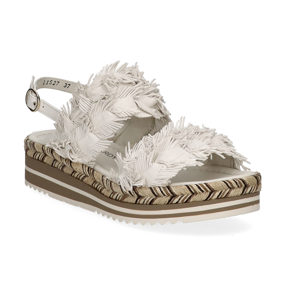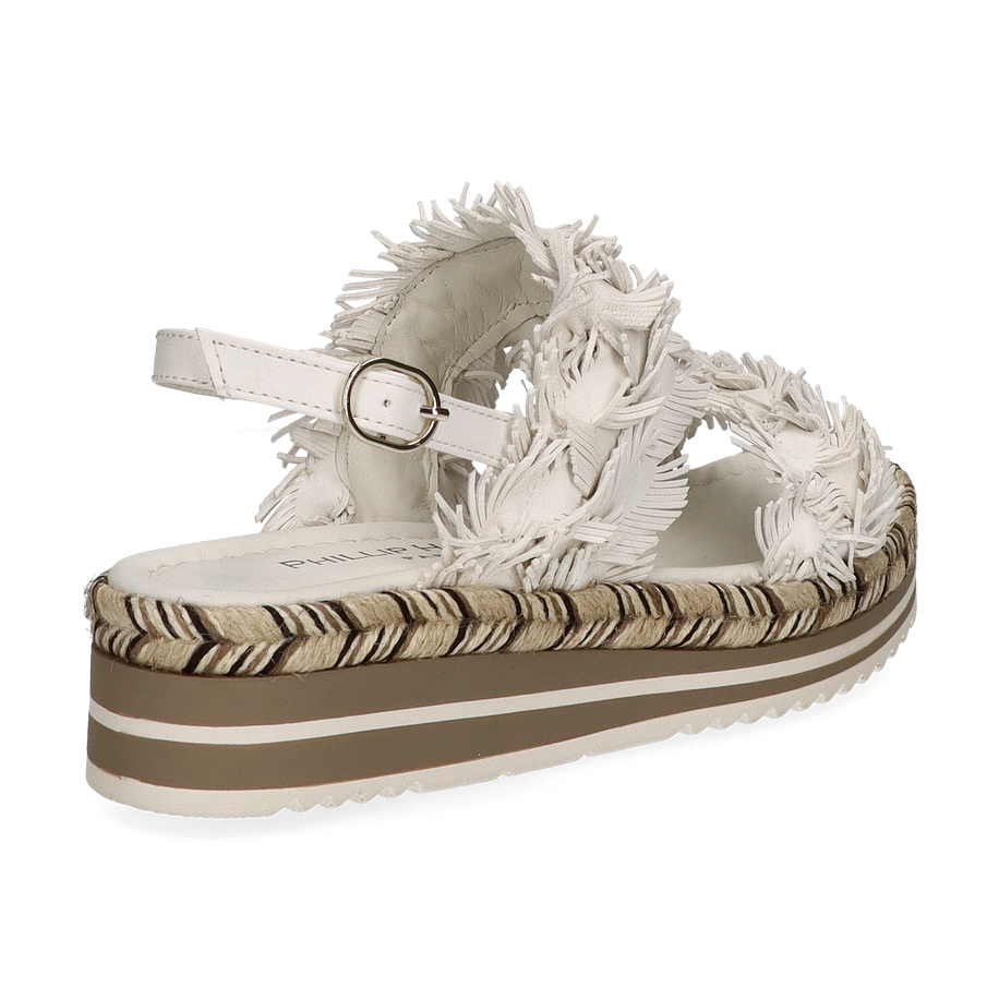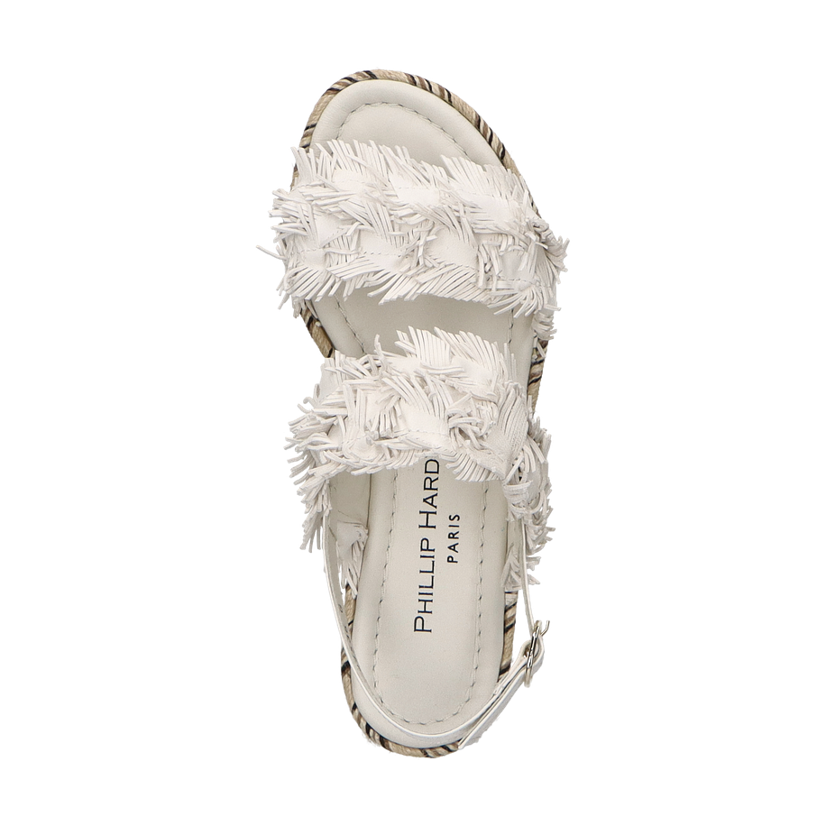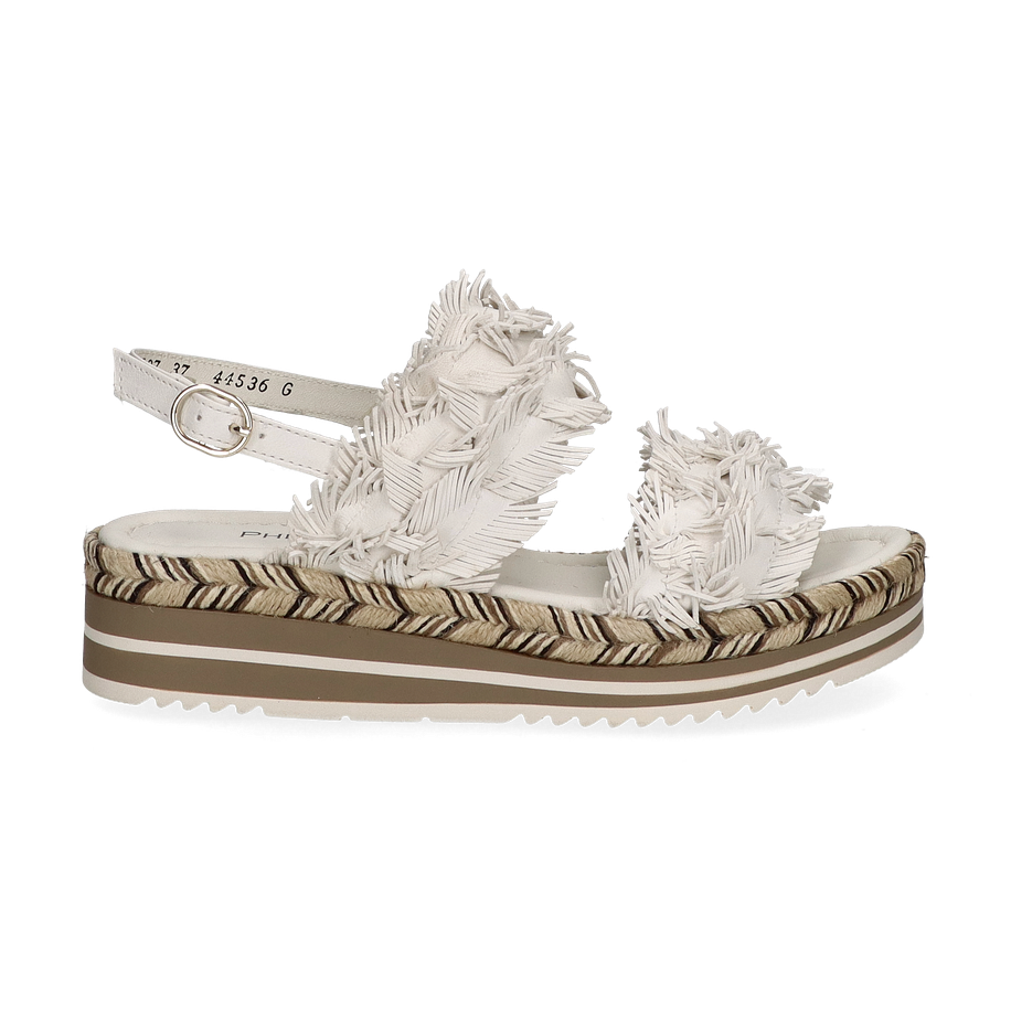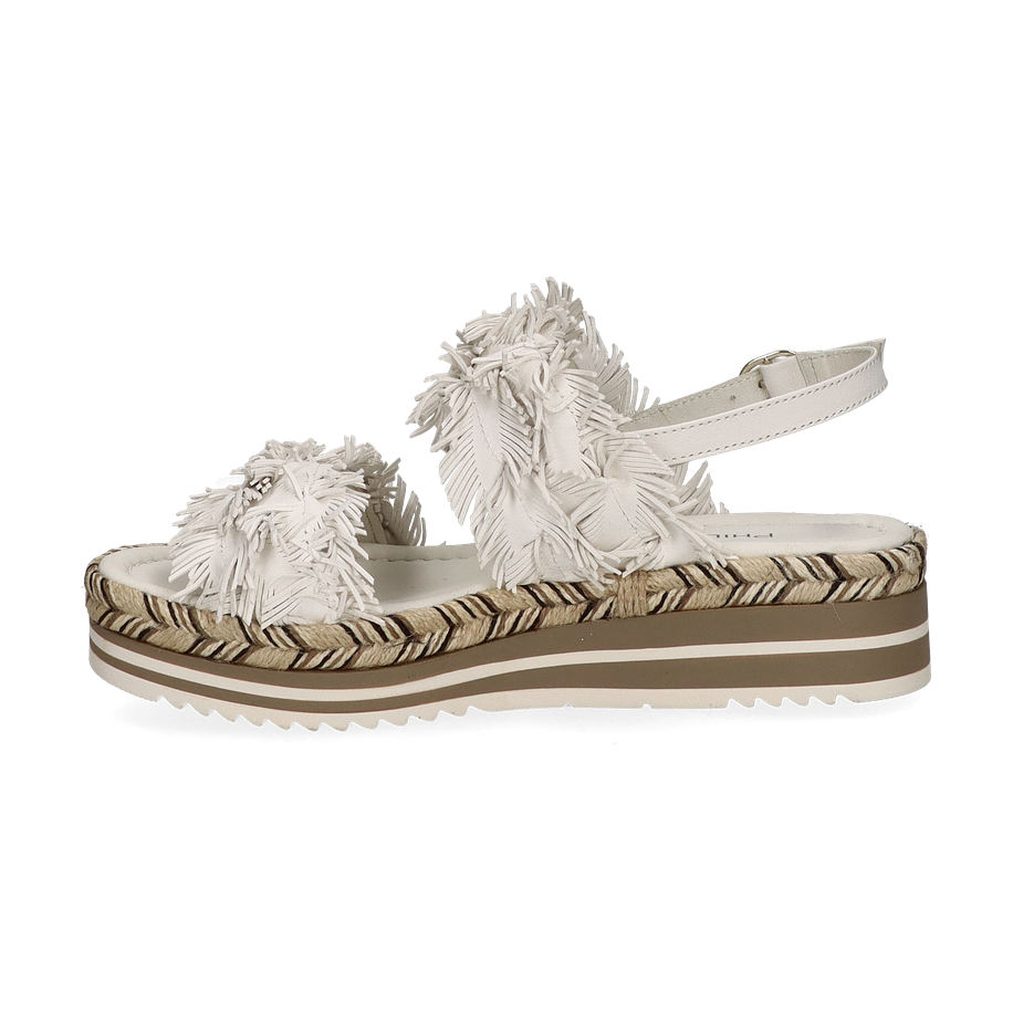 Preis inkl. MwSt.Die Phillip Hardy Sandalen für Damen präsentieren sich in einem eleganten Weiß, das durch kunstvolle Fransen-Details auf dem Obermaterial aus Leder hervorgehoben wird. Diese stilvollen Sandalen vereinen Komfort und modisches Design, ideal für sommerliche Anlässe. Der dezente Plateauabsatz von 2 cm und die 4 cm hohe Sohle verleihen zusätzlichen Halt und eine moderne Silhouette. Die Kombination aus natürlichen und neutralen Tönen im Sohlenbereich rundet das Gesamtbild harmonisch ab.