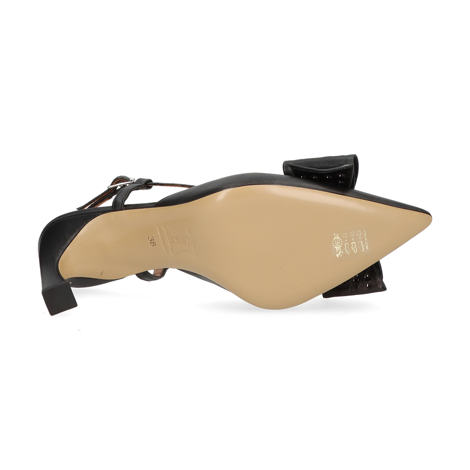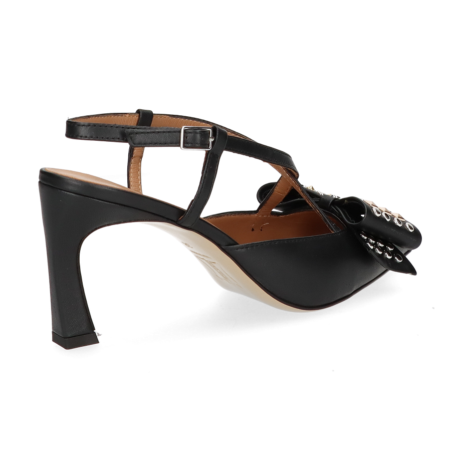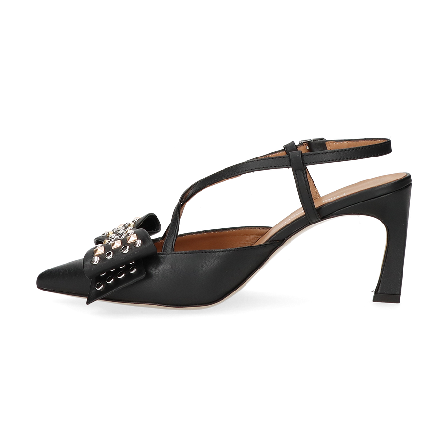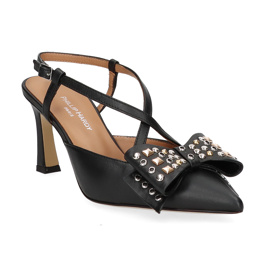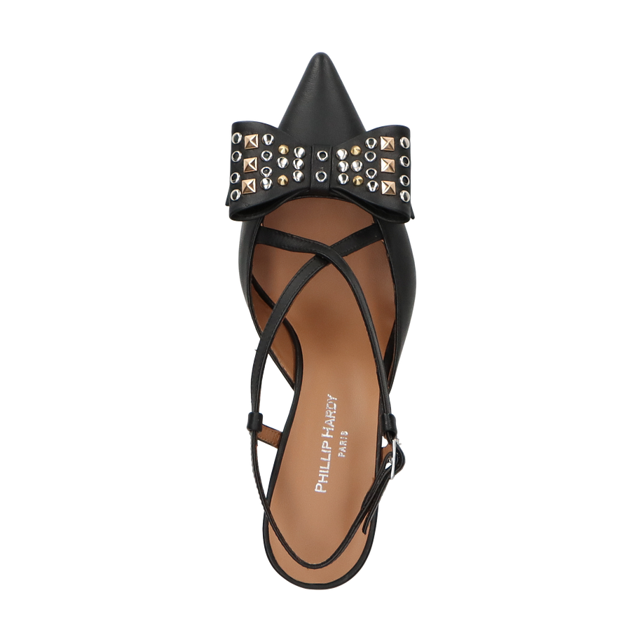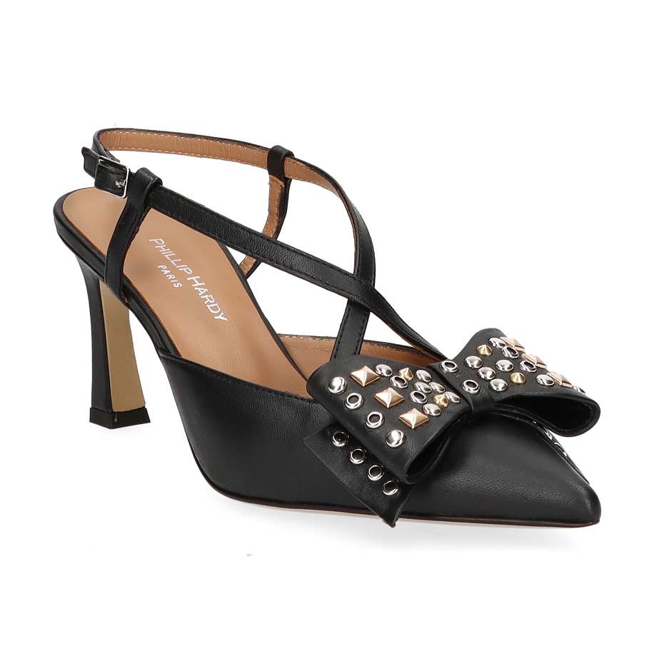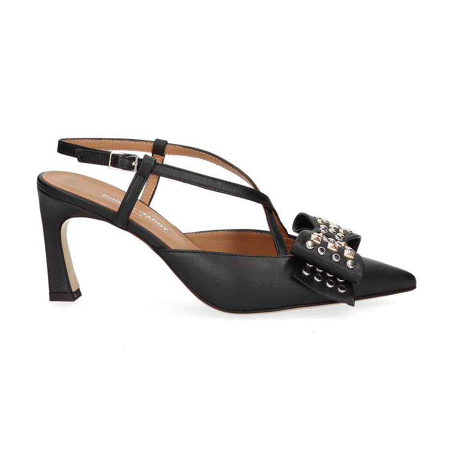 Preis inkl. MwSt.Die Phillip Hardy Slingpumps für Damen präsentieren sich in elegantem Schwarz und sind ein wahrer Blickfang. Der raffinierte Schnitt mit den filigranen Riemchen und der auffälligen Schleife, verziert mit Nieten, verleiht diesem Schuh eine besondere Note. Der spitze Zehenbereich und der 7,5 cm hohe Absatz sorgen für eine feminine Silhouette, die sowohl im Büro als auch bei besonderen Anlässen überzeugt.