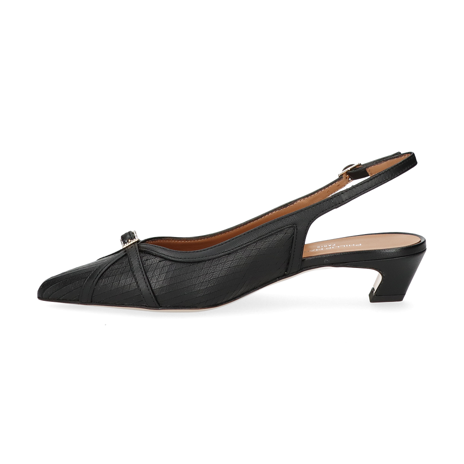 Preis inkl. MwSt.Die eleganten Slingpumps von Phillip Hardy in klassischem Schwarz verkörpern zeitlose Eleganz und Raffinesse. Das schlanke Design mit einem dezenten Riemen und einer zarten Schnalle verleiht diesen Schuhen eine feminine Note, die ideal für Damen ist. Der spitze Zehenbereich und der 8 cm hohe Absatz sorgen für eine anmutige Silhouette, während der offene Fersenbereich mit verstellbarem Riemen optimalen Halt und Komfort bietet.