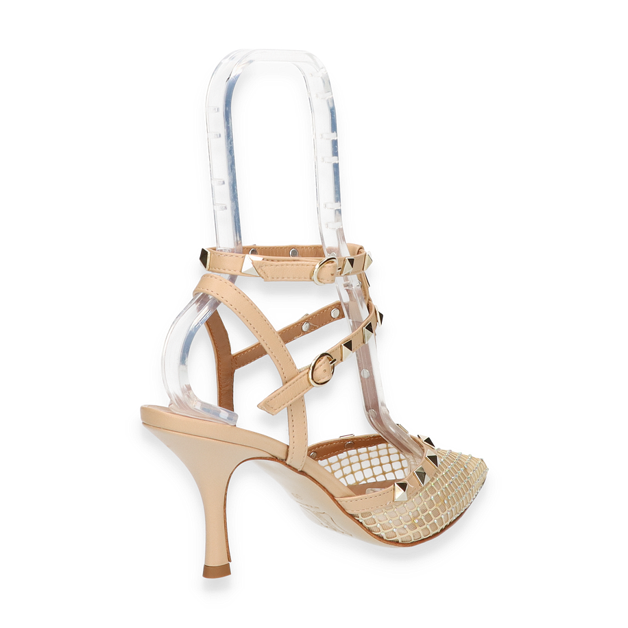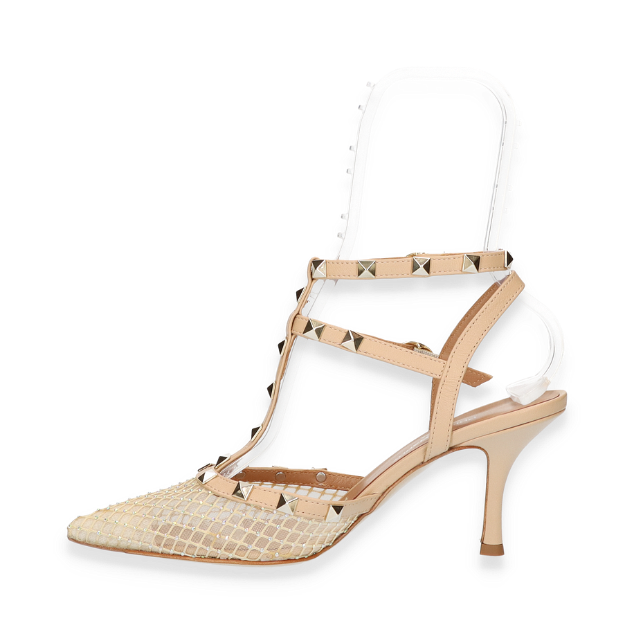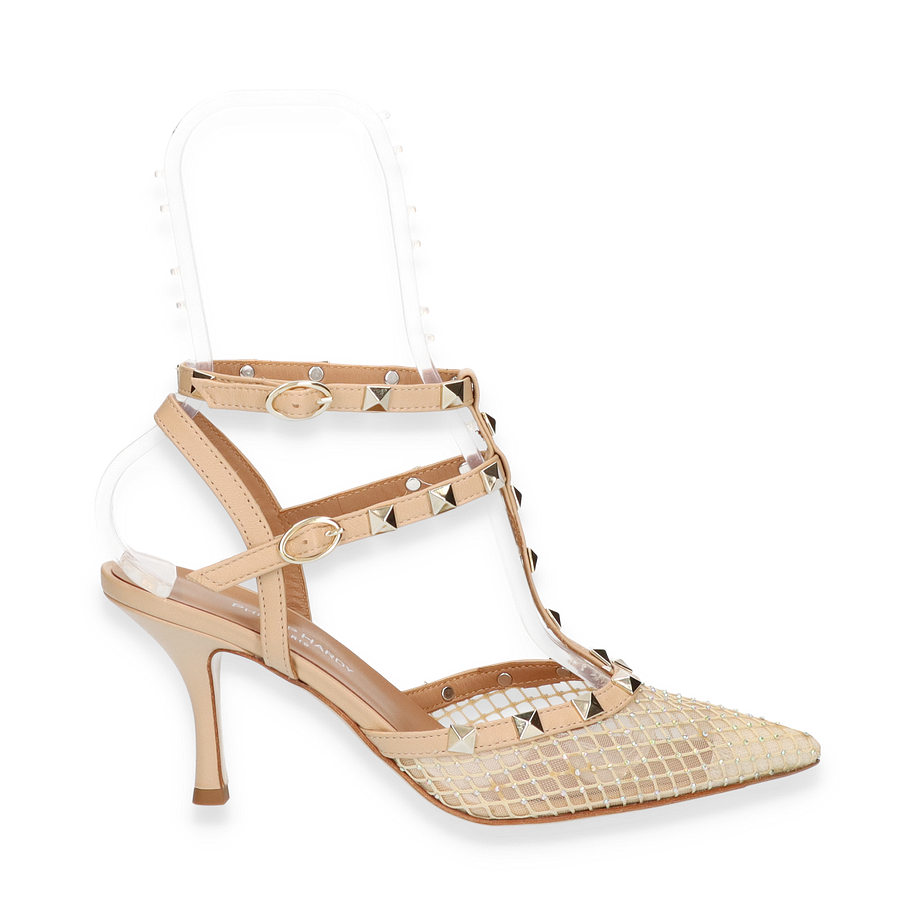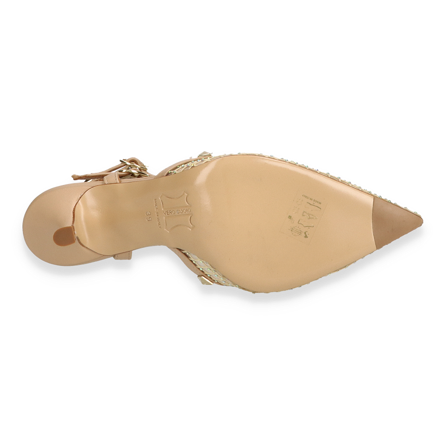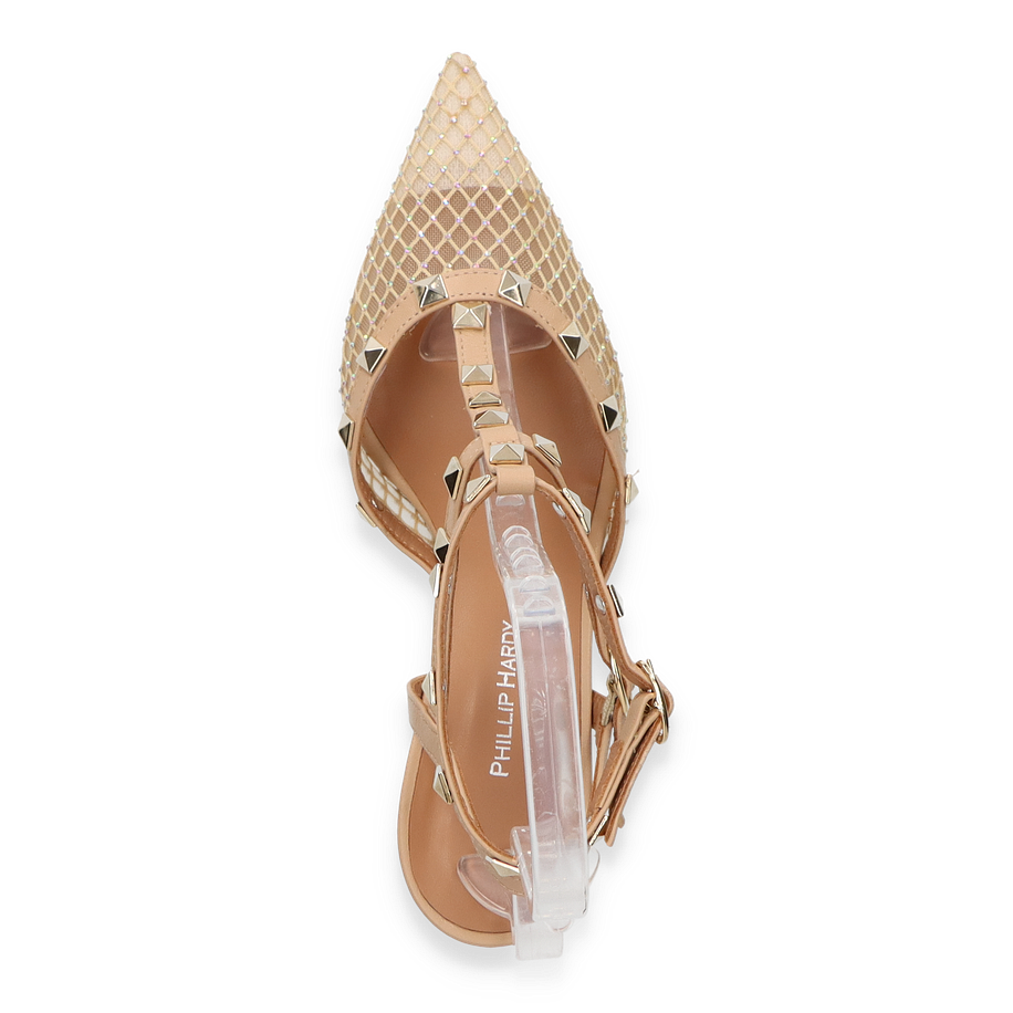 Die Phillip Hardy Slingpumps für Damen präsentieren sich in einem eleganten Beige, das durch ein raffiniertes Design mit Nieten und einem filigranen Riemenwerk besticht. Der spitze Schnitt und die kunstvolle Textilstruktur verleihen diesen Schuhen eine luxuriöse Ausstrahlung, die sowohl für formelle Anlässe als auch für stilvolle Abendveranstaltungen geeignet ist. Der 8 cm hohe Absatz sorgt für eine anmutige Silhouette und unterstreicht die feminine Eleganz dieser Pumps.