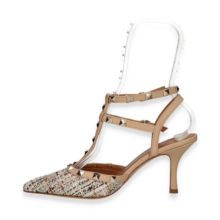 Preis inkl. MwSt.Die Phillip Hardy Slingpumps für Damen präsentieren sich in einem eleganten Design, das durch seine raffinierte Kombination aus Leder und Textil besticht. Der Schuh zeigt sich in einem ansprechenden Beige-Ton mit einer strukturierten Oberfläche, die durch subtile Glitzersteine akzentuiert wird. Die spitze Form und die filigranen Riemen mit Nieten verleihen dem Schuh eine moderne und zugleich zeitlose Ästhetik. Der schmale Absatz sorgt für eine feminine Silhouette und bietet einen stilvollen Auftritt bei jeder Gelegenheit.