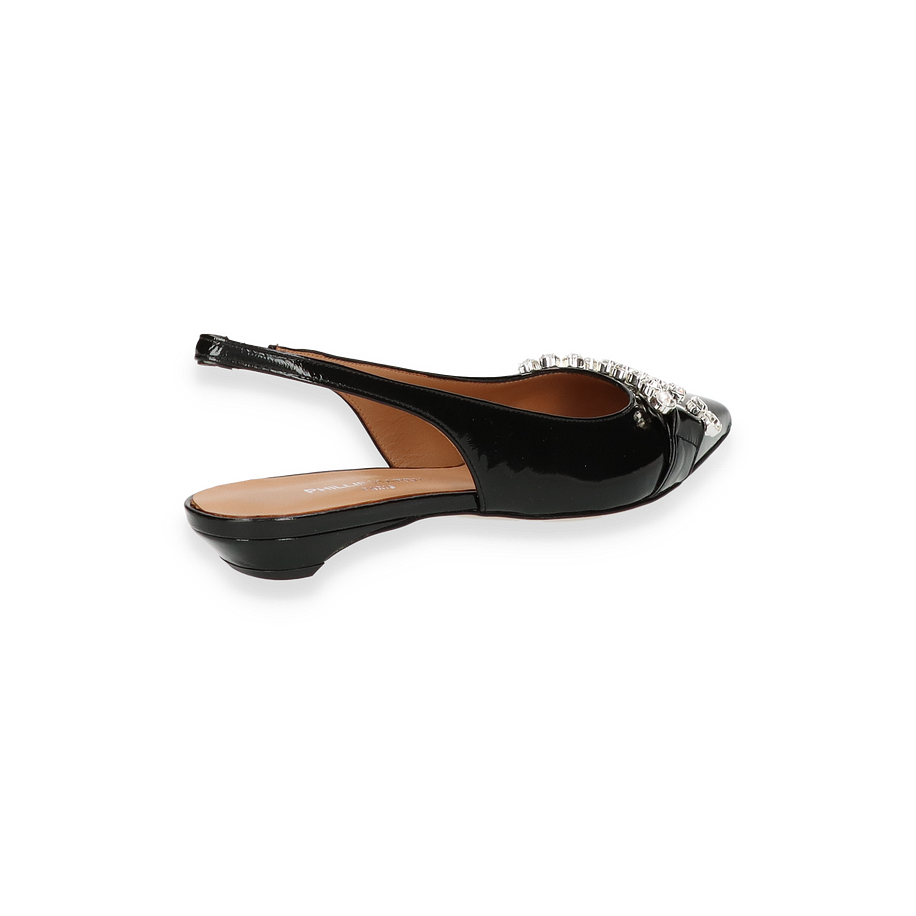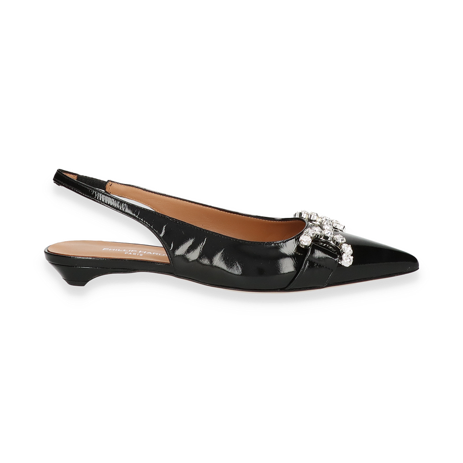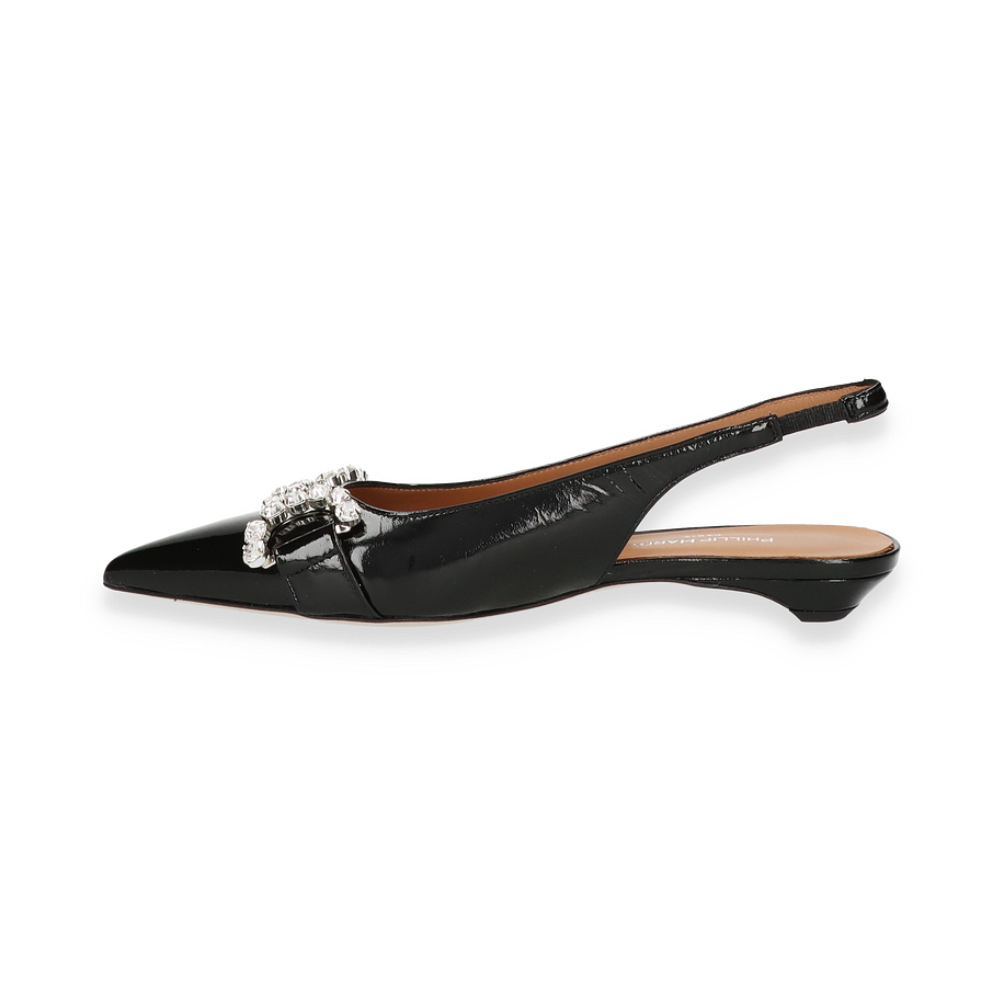Preis inkl. MwSt.Entdecken Sie die exquisiten Slingpumps von Phillip Hardy in elegantem Schwarz, die für Damen entworfen wurden. Diese Schuhe zeichnen sich durch ihr glänzendes Lederobermaterial aus, das mit funkelnden Schmucksteinen verziert ist und jedem Outfit einen Hauch von Glamour verleiht. Der raffinierte Schnitt und der zarte Slingback-Riemen sorgen für eine perfekte Passform und unterstreichen die feminine Silhouette. Mit einem Absatz von 2 cm bieten diese Slingpumps sowohl Stil als auch Komfort für den ganzen Tag.