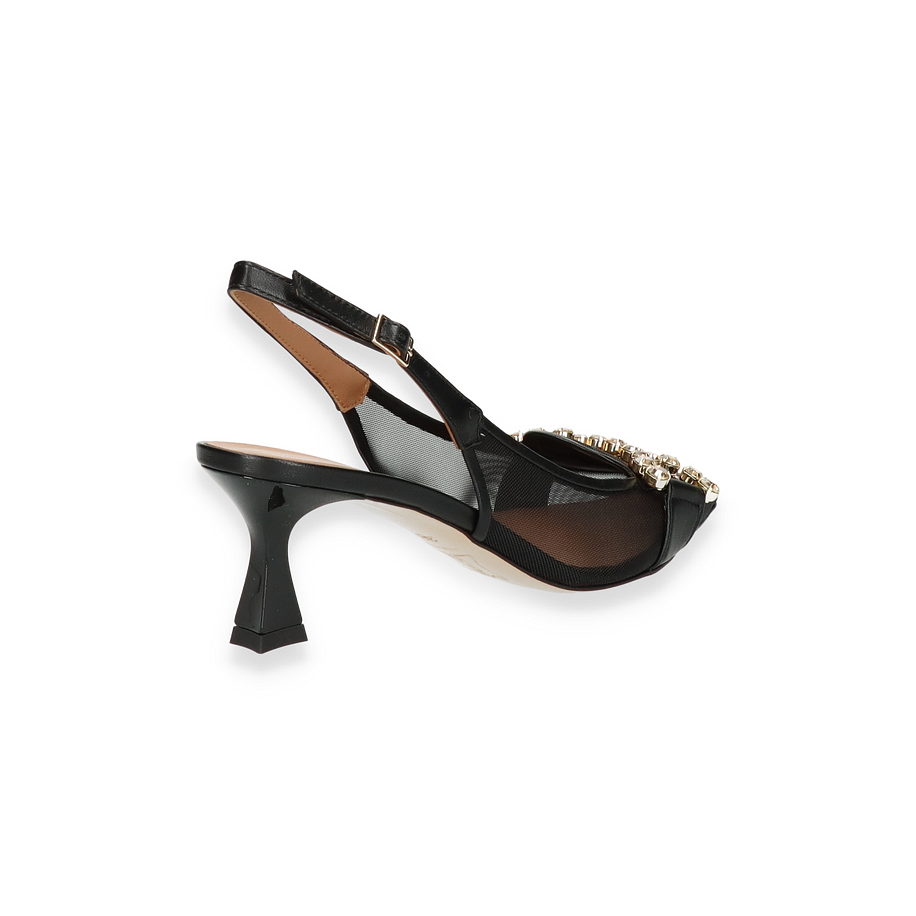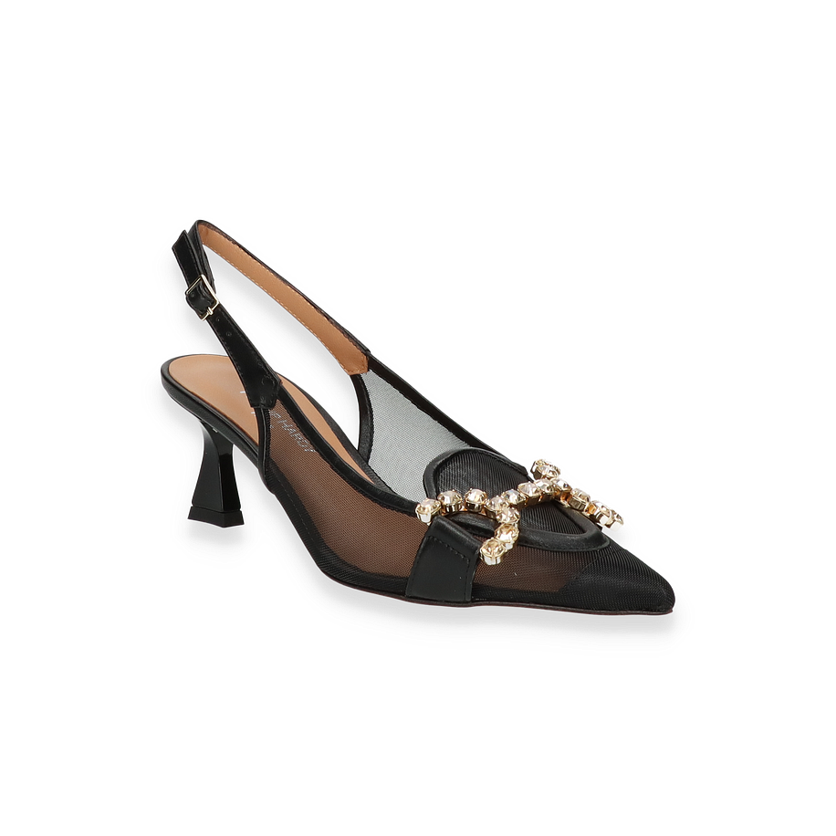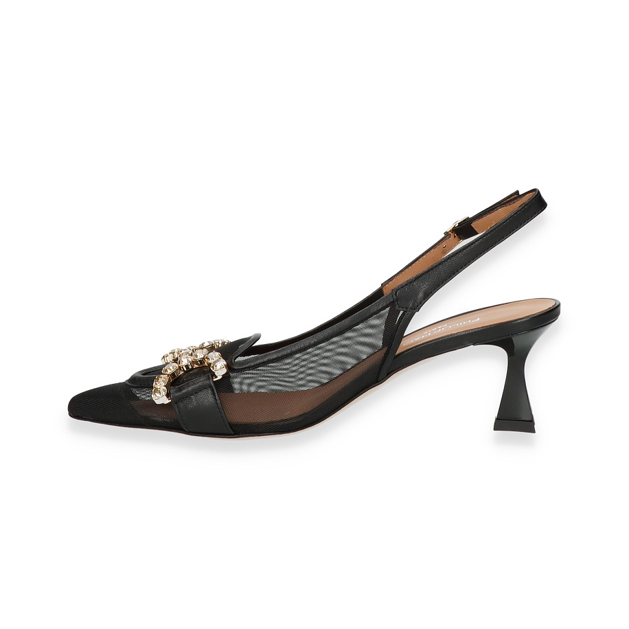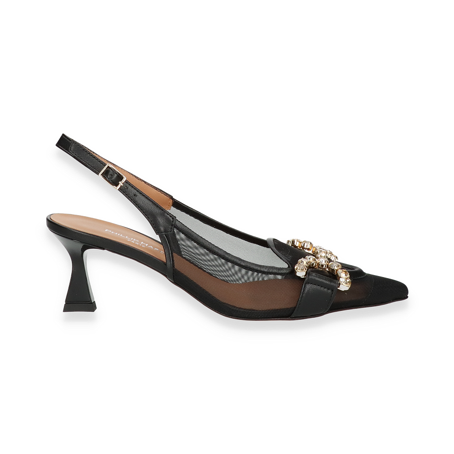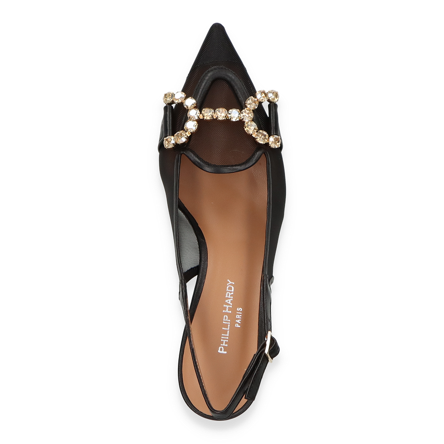 Die Phillip Hardy Slingpumps in elegantem Schwarz vereinen zeitlose Eleganz mit modernem Design. Der raffinierte Mesh-Einsatz verleiht dem Schuh eine luftige Leichtigkeit, während der funkelnde Schmucksteinbesatz auf der Vorderseite einen luxuriösen Akzent setzt. Der spitz zulaufende Zehenbereich und der schmale Fersenriemen mit verstellbarer Schnalle sorgen für eine feminine Silhouette und optimalen Halt. Mit einer Absatzhöhe von 6 cm bieten diese Slingpumps für Damen eine perfekte Balance zwischen Stil und Komfort, ideal für besondere Anlässe oder elegante Abendveranstaltungen.