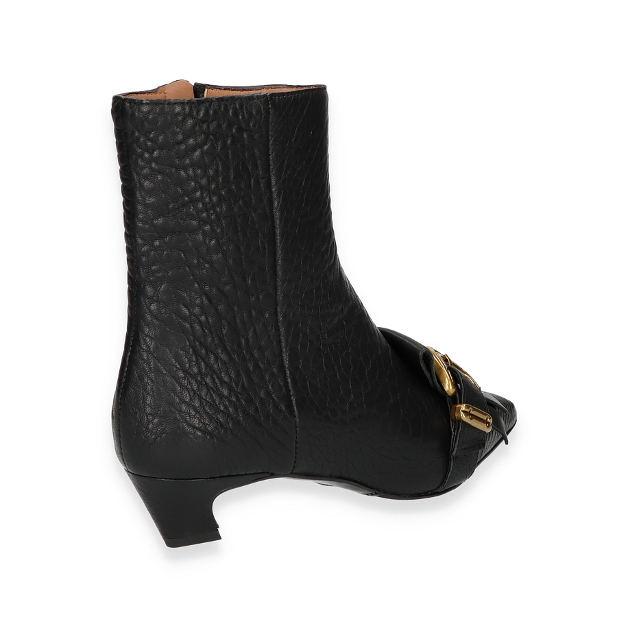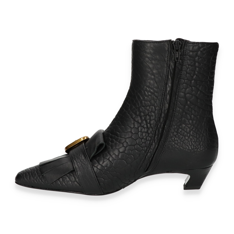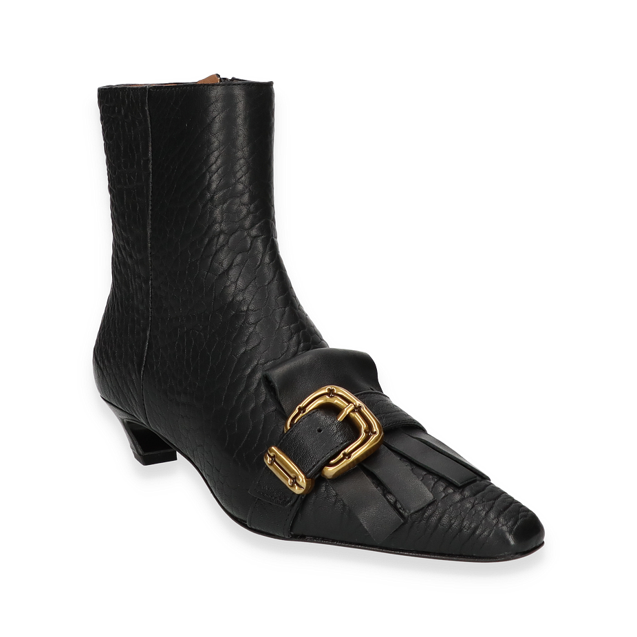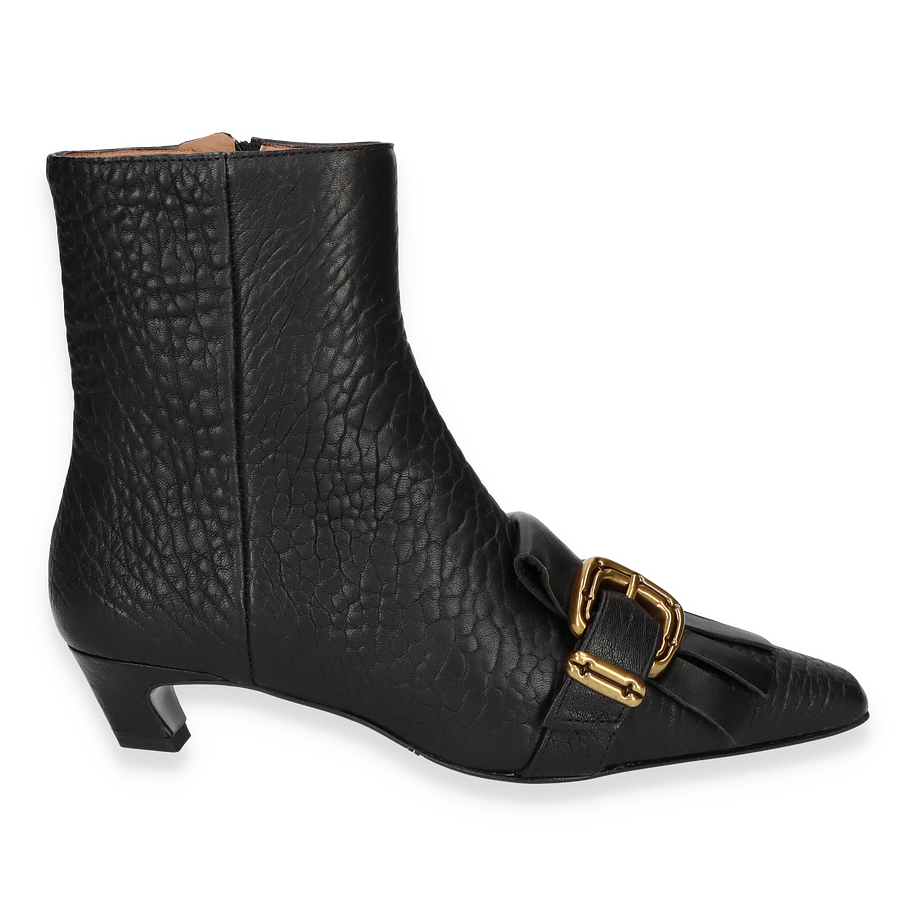 Preis inkl. MwSt.Entdecken Sie die exquisiten Klassischen Stiefeletten von Phillip Hardy, die durch ihr elegantes Design und die hochwertige Verarbeitung bestechen. Diese Stiefeletten für Damen präsentieren sich in einem edlen Schwarz, das durch die strukturierte Lederoberfläche und die markante goldene Schnalle akzentuiert wird. Der 4 cm hohe Absatz verleiht Ihnen eine dezente Erhöhung, während die 16 cm hohe Schafthöhe und die 22 cm Schaftweite für eine perfekte Passform sorgen.