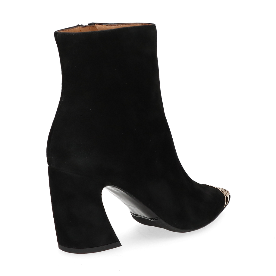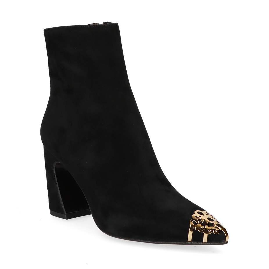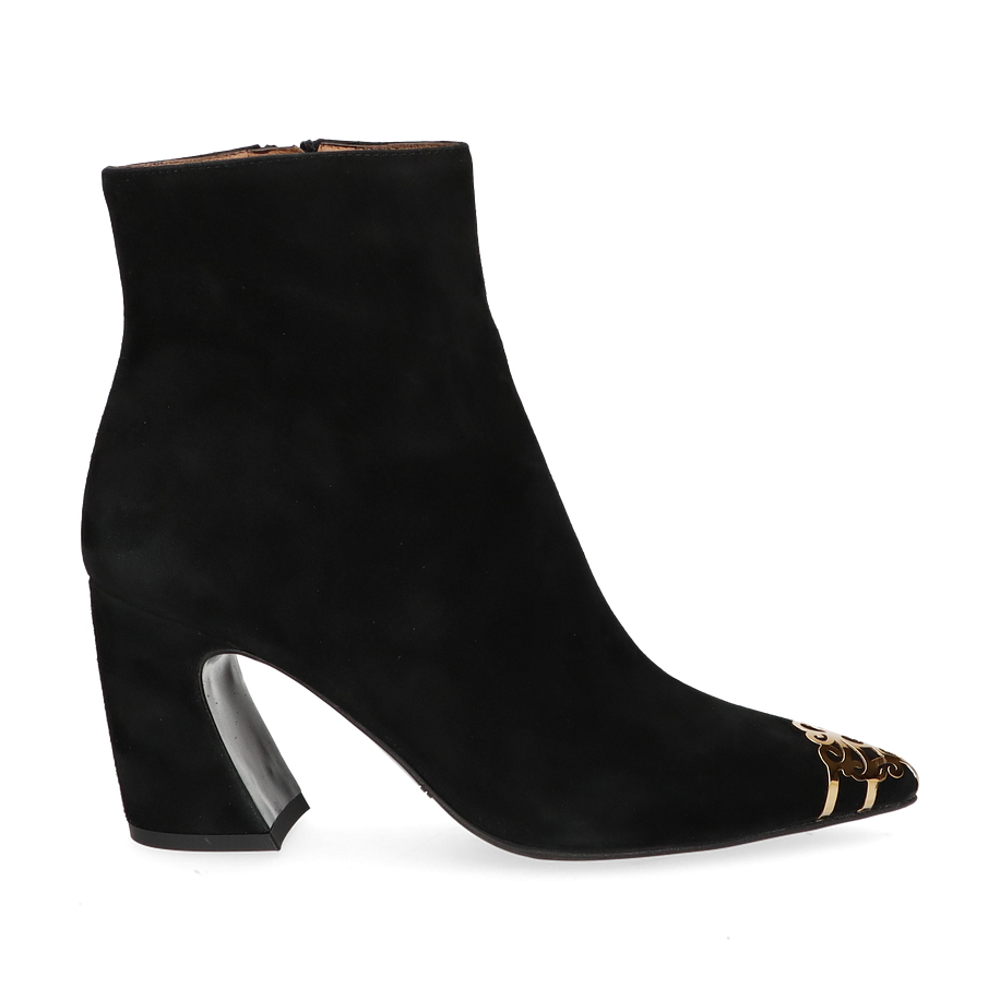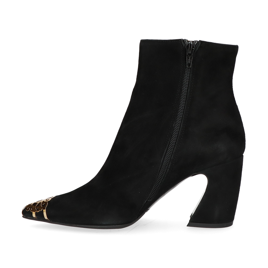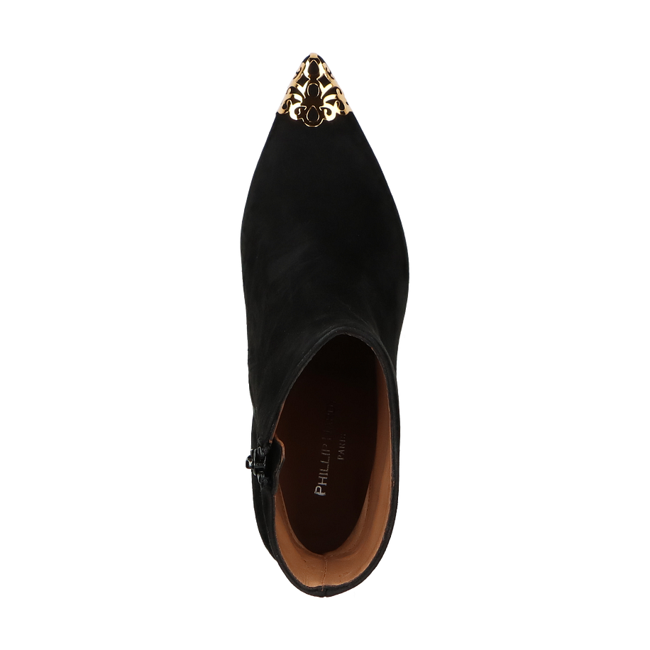 Preis inkl. MwSt.Die Phillip Hardy Klassische Stiefeletten in elegantem Schwarz verkörpern zeitlose Eleganz und Raffinesse für Damen. Das Design besticht durch eine stilvolle Kombination aus glattem Leder und einem auffälligen goldenen Detail an der Spitze, das einen Hauch von Luxus verleiht. Der 7 cm hohe Absatz sorgt für eine anmutige Silhouette und bietet gleichzeitig optimalen Tragekomfort. Diese Stiefeletten sind die perfekte Ergänzung für jedes anspruchsvolle Outfit und verleihen jedem Look eine besondere Note.