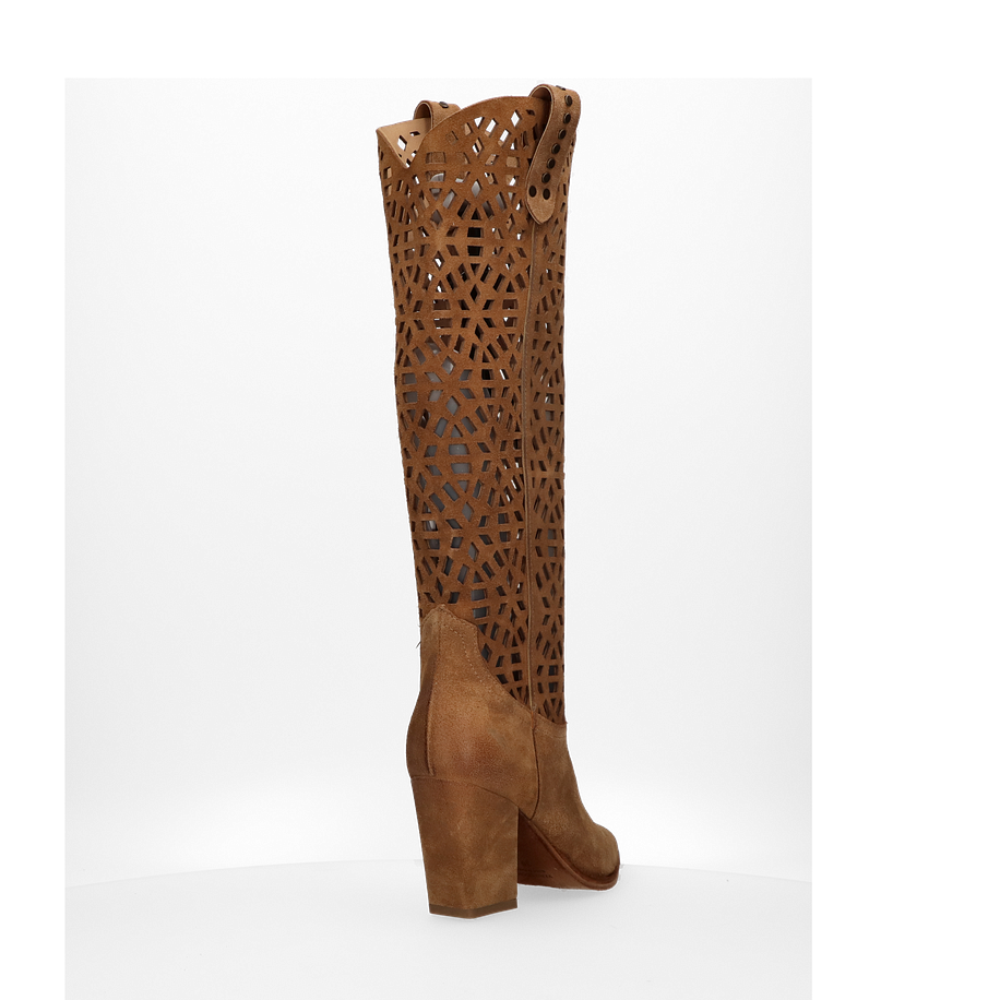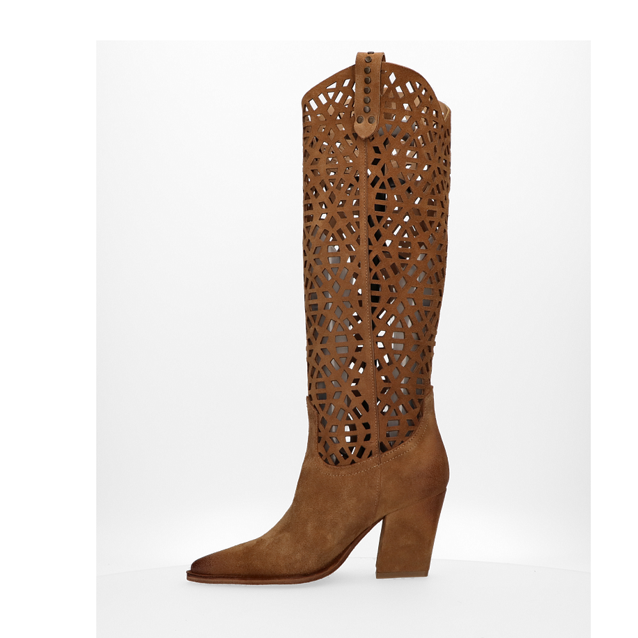 Preis inkl. MwSt.Die Phillip Hardy Western Boots für Damen präsentieren sich in einem eleganten Braunton und vereinen traditionelles Design mit modernem Flair. Der auffällige Schaft mit einer Höhe von 40 cm besticht durch ein kunstvolles, durchbrochenes Muster, das dem klassischen Westernstil eine zeitgemäße Note verleiht. Der 9 cm hohe Absatz sorgt für eine ansprechende Silhouette und unterstreicht die feminine Eleganz dieser Stiefel.