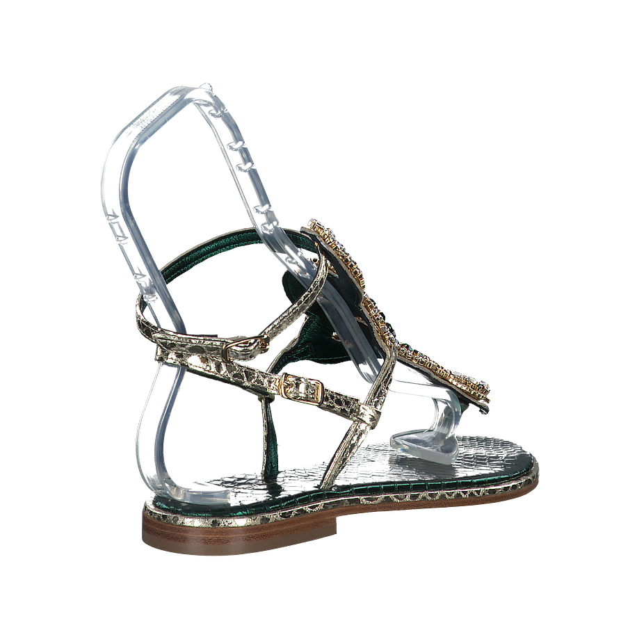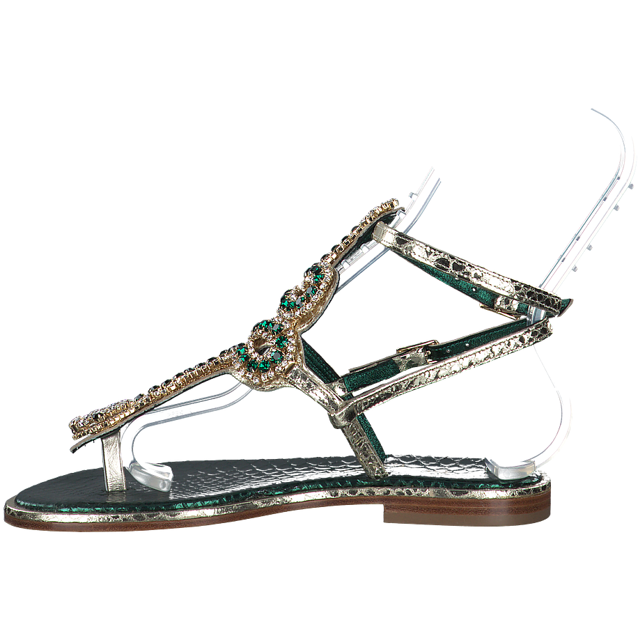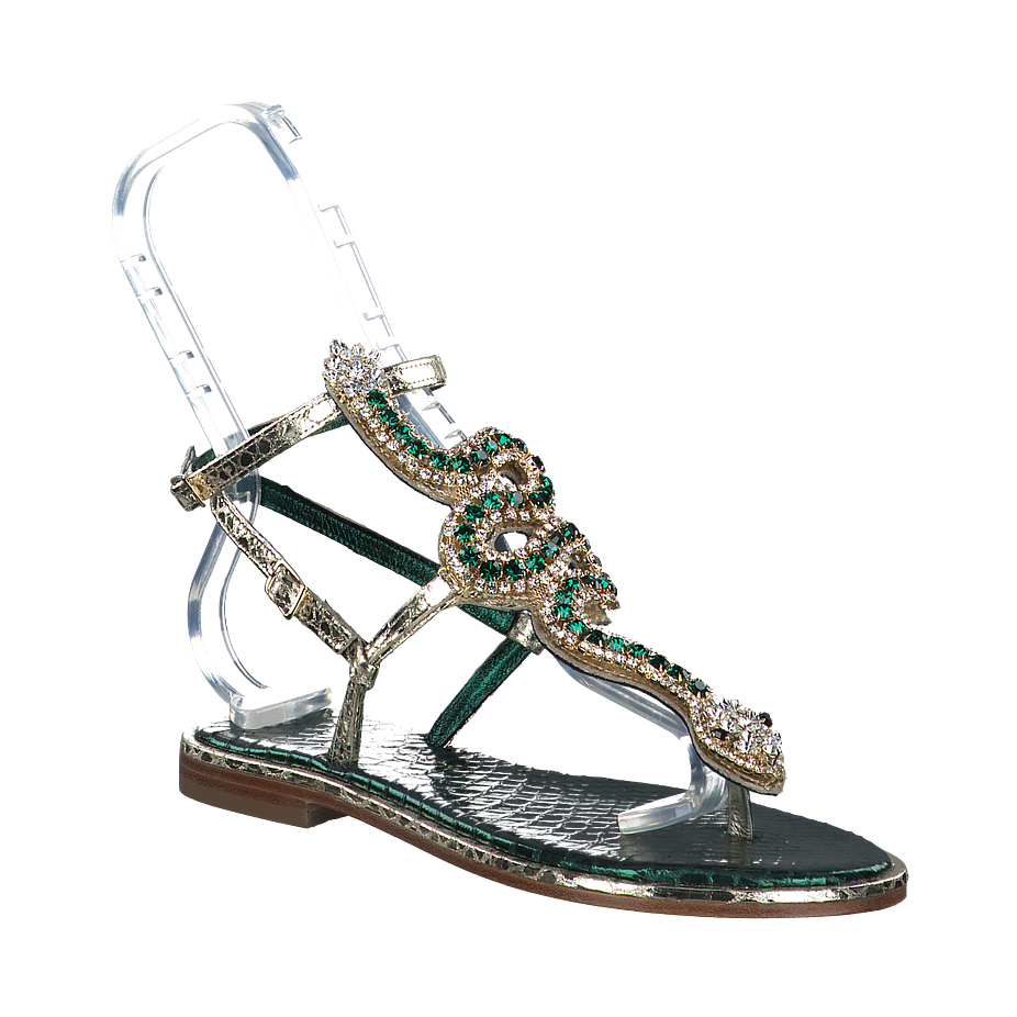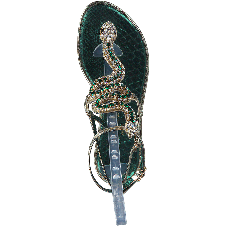 Entdecken Sie den exquisiten Zehentrenner für Damen, der Eleganz und Stil in einem einzigartigen Design vereint. Diese Sandale besticht durch ihre kunstvolle Verzierung mit funkelnden grünen und klaren Steinen, die in einer eleganten Schlangenform angeordnet sind. Der metallische Glanz des Riemens harmoniert perfekt mit dem tiefgrünen Fußbett, das an luxuriöse Texturen erinnert. Die filigranen Riemen bieten nicht nur Halt, sondern unterstreichen auch die feminine Silhouette dieses außergewöhnlichen Schuhs.
