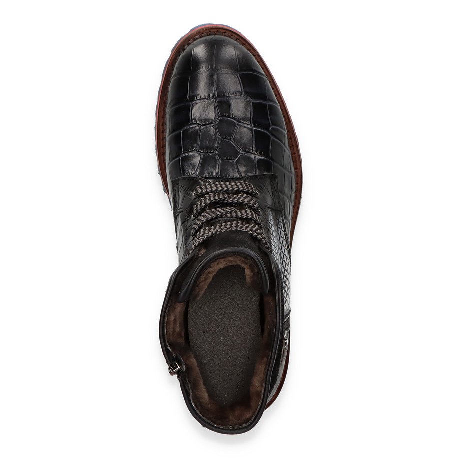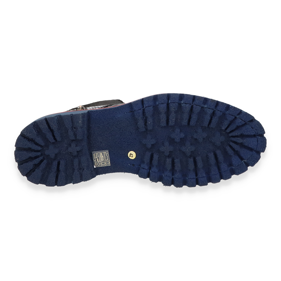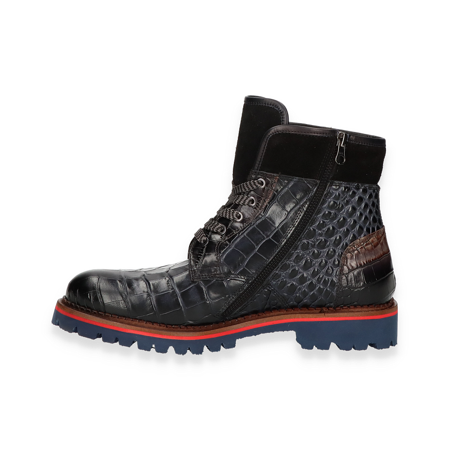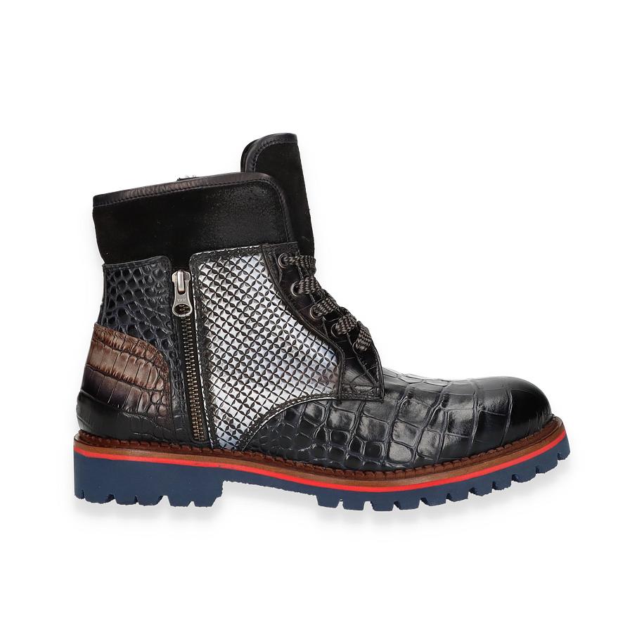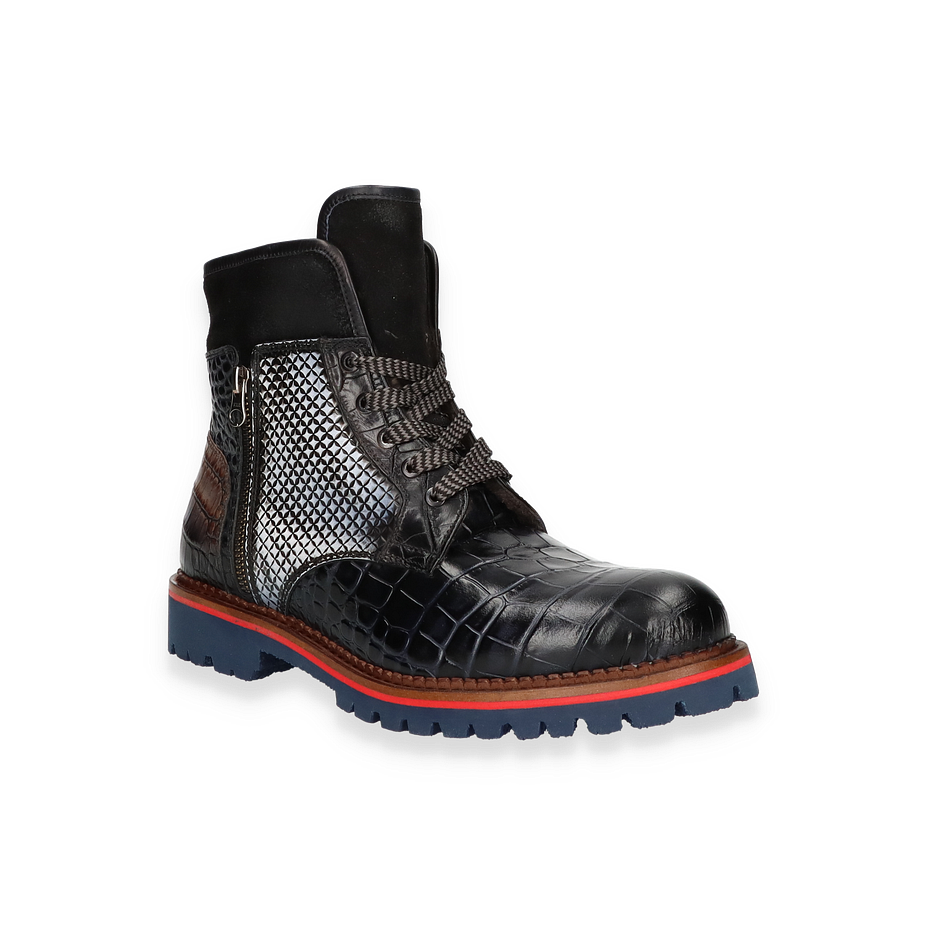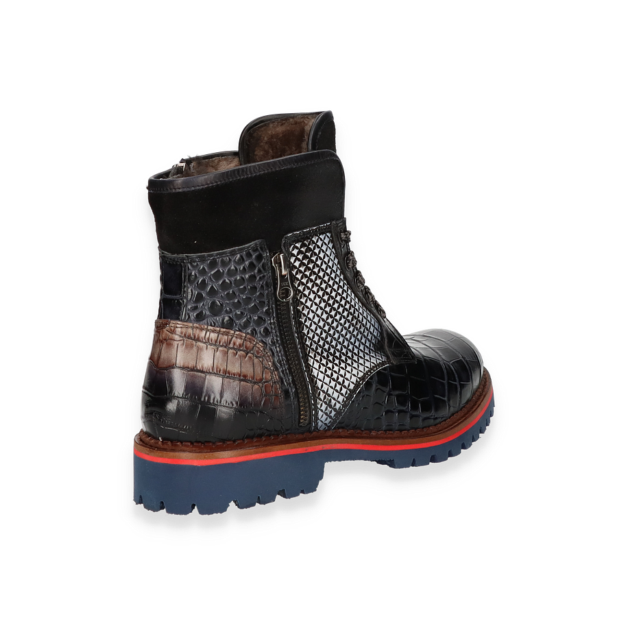Entdecken Sie den exquisiten Winterstiefel für Herren von Phillip Hardy, der durch seine auffällige Optik und hochwertige Verarbeitung besticht. Das bunte Design kombiniert verschiedene Tierleder-Optiken, die dem Schuh einen einzigartigen und luxuriösen Look verleihen. Die robuste Gummisohle in Blau mit rotem Akzent bietet nicht nur Stil, sondern auch hervorragende Traktion auf winterlichen Wegen. Die seitlichen Reißverschlüsse und die Schnürung sorgen für einen sicheren und bequemen Sitz. Dieser Winterstiefel überzeugt durch seine erstklassigen Materialien und Verarbeitung. Das Obermaterial besteht aus Leder, während das Innenmaterial und die Innensohle aus Lammfell gefertigt sind, was für optimalen Komfort und Wärme sorgt. Mit einer Absatzhöhe von 3,5 cm bietet der Schuh eine angenehme Erhöhung, ohne dabei an Stabilität einzubüßen. Perfekt für stilbewusste Herren, die auch in der kalten Jahreszeit nicht auf Eleganz verzichten möchten.
