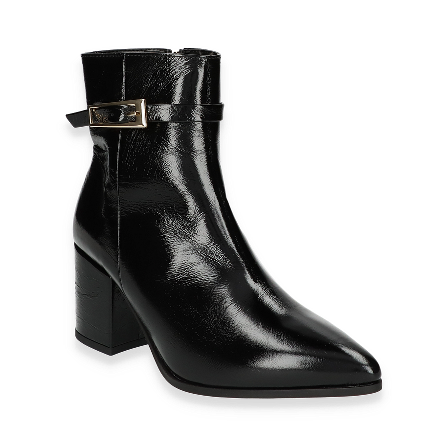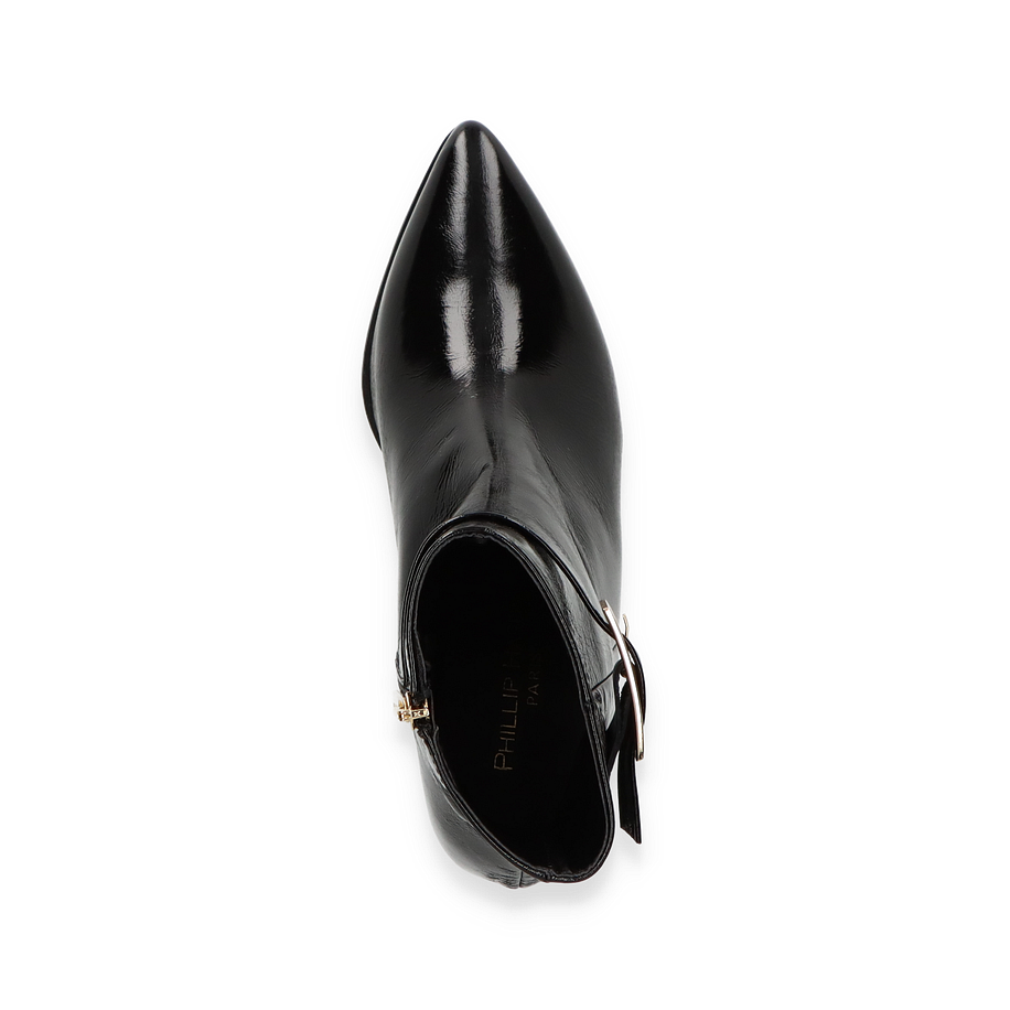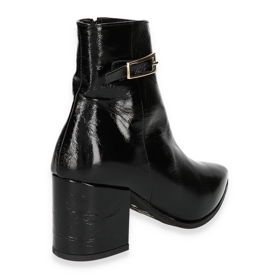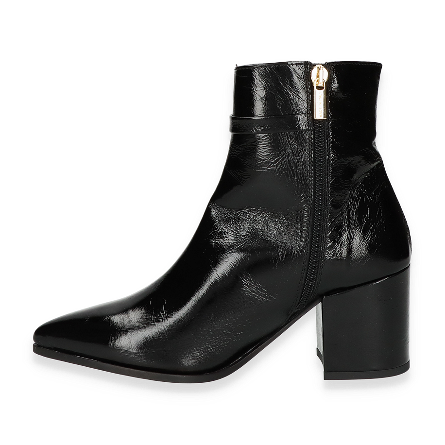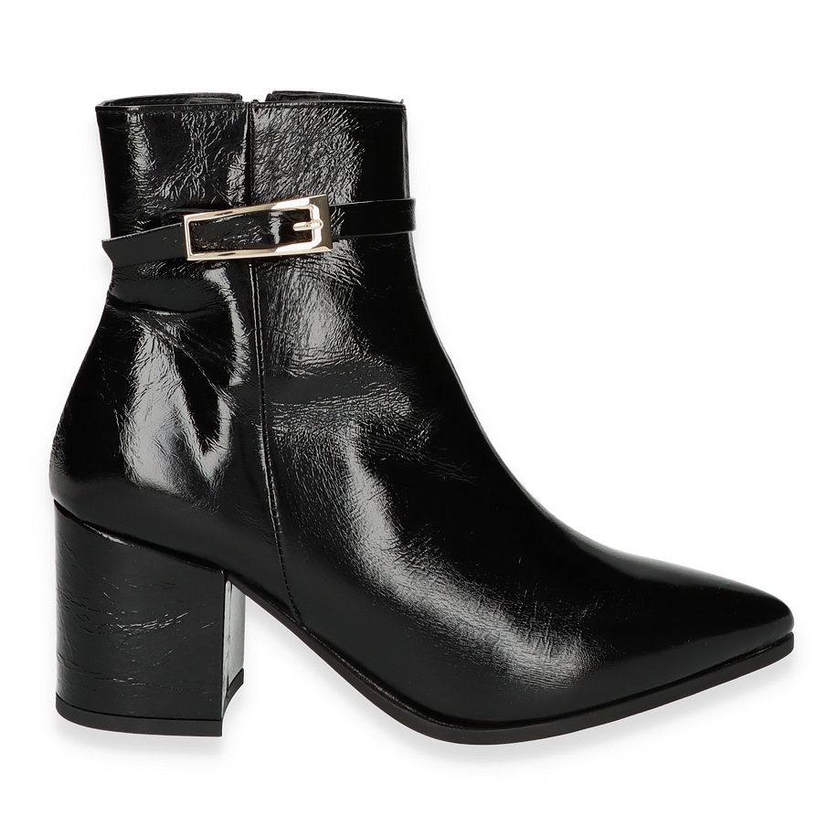 Preis inkl. MwSt.Die Phillip Hardy KARA Stiefeletten für Damen präsentieren sich in einem eleganten Schwarz und verkörpern zeitlose Eleganz und Raffinesse. Der glänzende Lederobermaterial verleiht den Schuhen einen luxuriösen Touch, während der markante Blockabsatz von 7 cm Höhe für eine selbstbewusste Ausstrahlung sorgt. Der subtile Riemen mit goldener Schnalle ergänzt das Design perfekt und verleiht den Stiefeletten eine moderne Note. Mit einer Schafthöhe von 13 cm und einer Schaftweite von 20 cm bieten diese Stiefeletten eine schmeichelhafte Silhouette, die sowohl zu formellen als auch zu legeren Outfits passt.