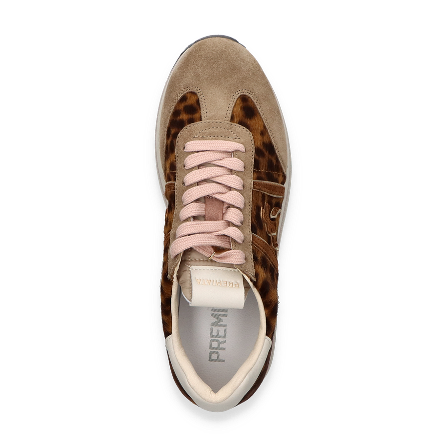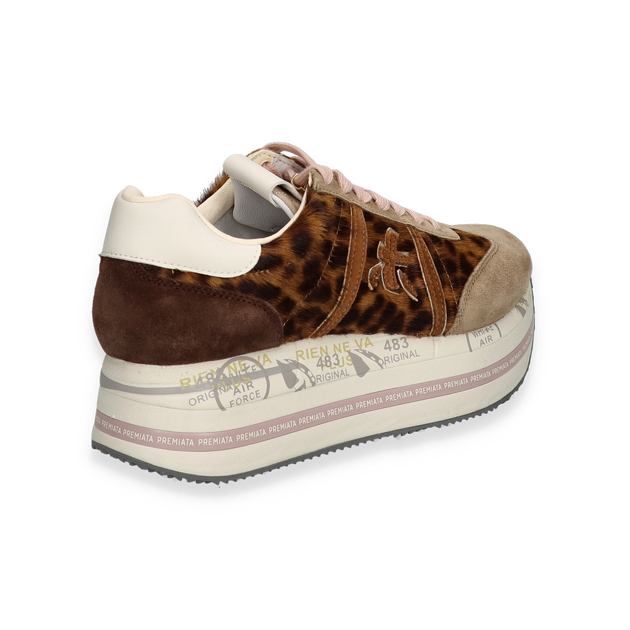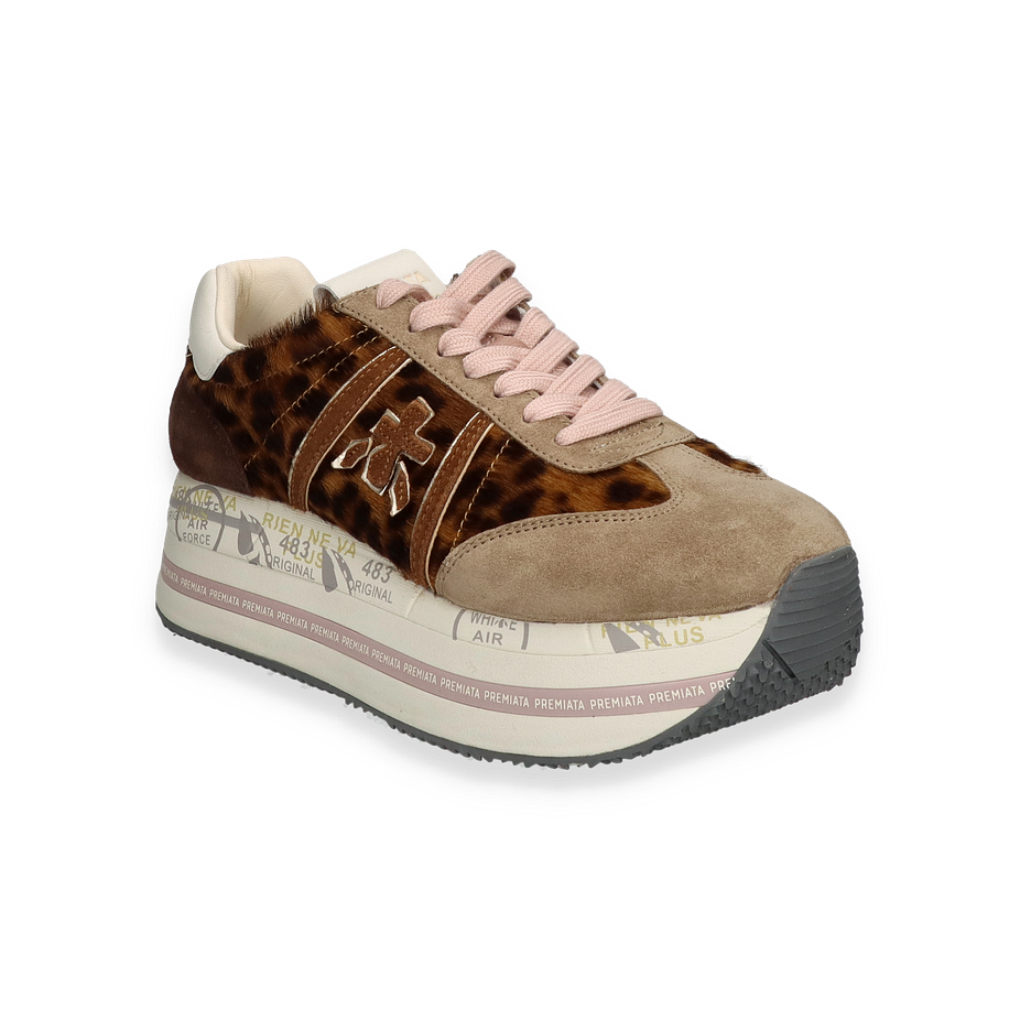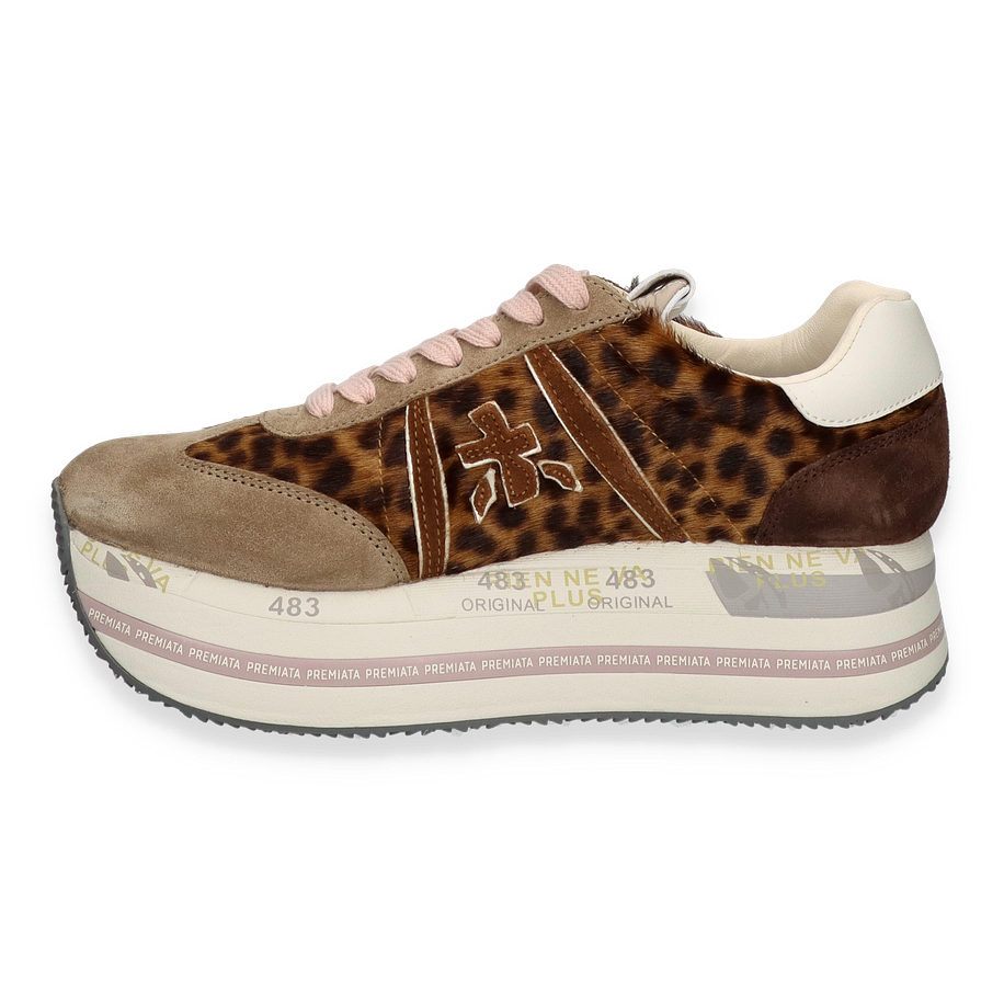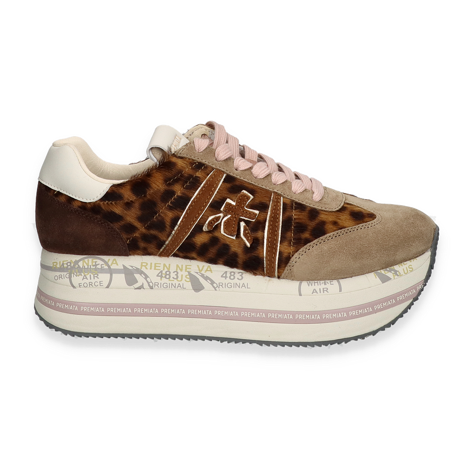 Preis inkl. MwSt.Der Sneaker BETH von Premiata für Damen besticht durch sein einzigartiges Design in Braun/Bunt. Die Kombination aus Leder, Textil und sonstigem Material verleiht dem Schuh eine stilvolle und zugleich robuste Optik. Der auffällige Leopardenmuster-Einsatz und die subtilen Farbtöne harmonieren perfekt miteinander und machen diesen Sneaker zu einem echten Hingucker. Die sorgfältige Verarbeitung und die hochwertigen Materialien sorgen für einen luxuriösen Look, der sowohl im Alltag als auch zu besonderen Anlässen überzeugt.