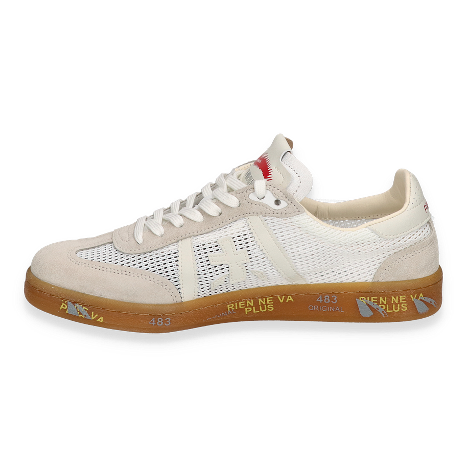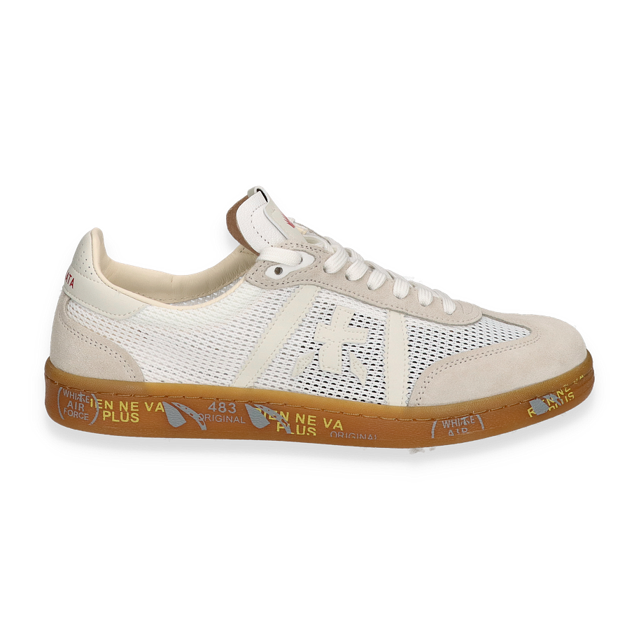 Der Sneaker BONNIE von Premiata präsentiert sich in einem eleganten Weiß/Beige, das durch seine dezente Farbgebung und das raffinierte Design besticht. Die Kombination aus Leder, Textil und sonstigem Material im Obermaterial verleiht dem Schuh eine moderne Ästhetik, während die subtile Markenprägung und die kontrastierende Sohle mit grafischen Details dem Look eine besondere Note verleihen. Die sorgfältig gestaltete Silhouette und die hochwertige Verarbeitung machen diesen Sneaker zu einem stilvollen Begleiter für Herren.