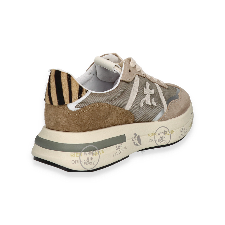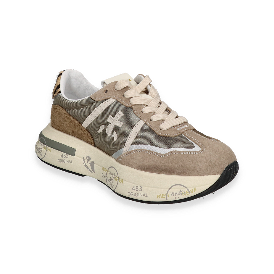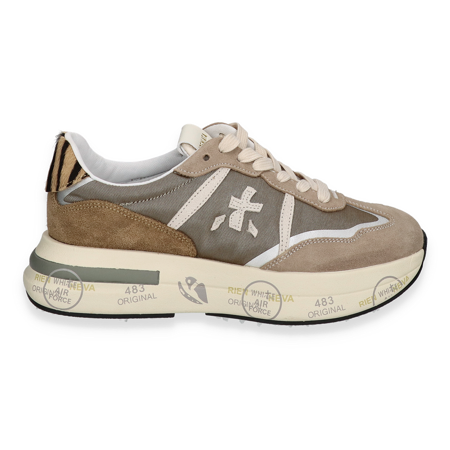Preis inkl. MwSt.Der Premiata Sneaker CASSIE für Damen präsentiert sich in einem eleganten Beige-Ton, der sich mühelos in jede Garderobe integrieren lässt. Die Kombination aus Leder, Textil und sonstigem Material verleiht dem Schuh nicht nur eine ansprechende Optik, sondern auch eine besondere Vielseitigkeit. Der dezente Absatz von 3,5 cm sorgt für eine feminine Silhouette, während die markanten Details und das charakteristische Logo-Design dem Sneaker einen modernen Touch verleihen.