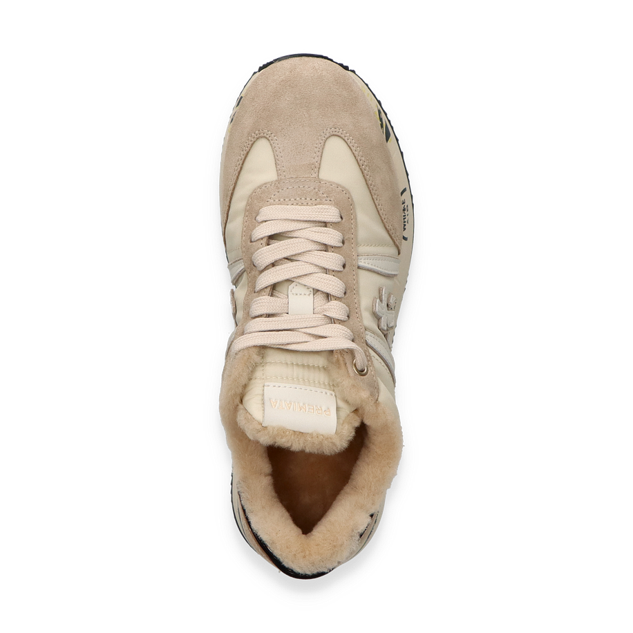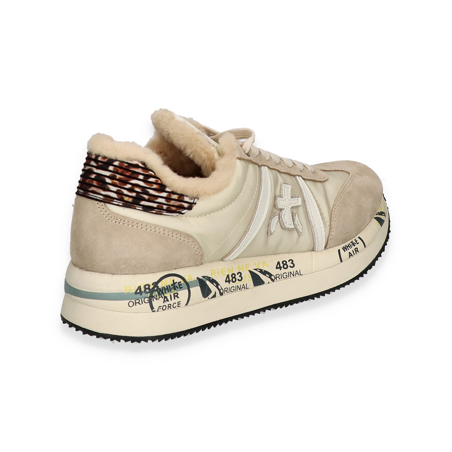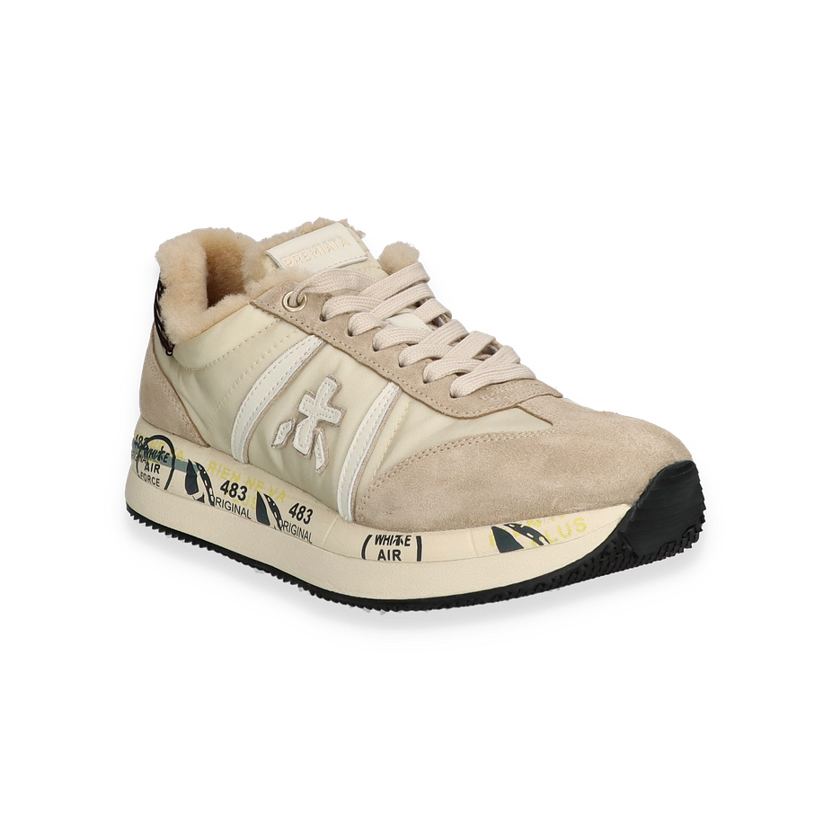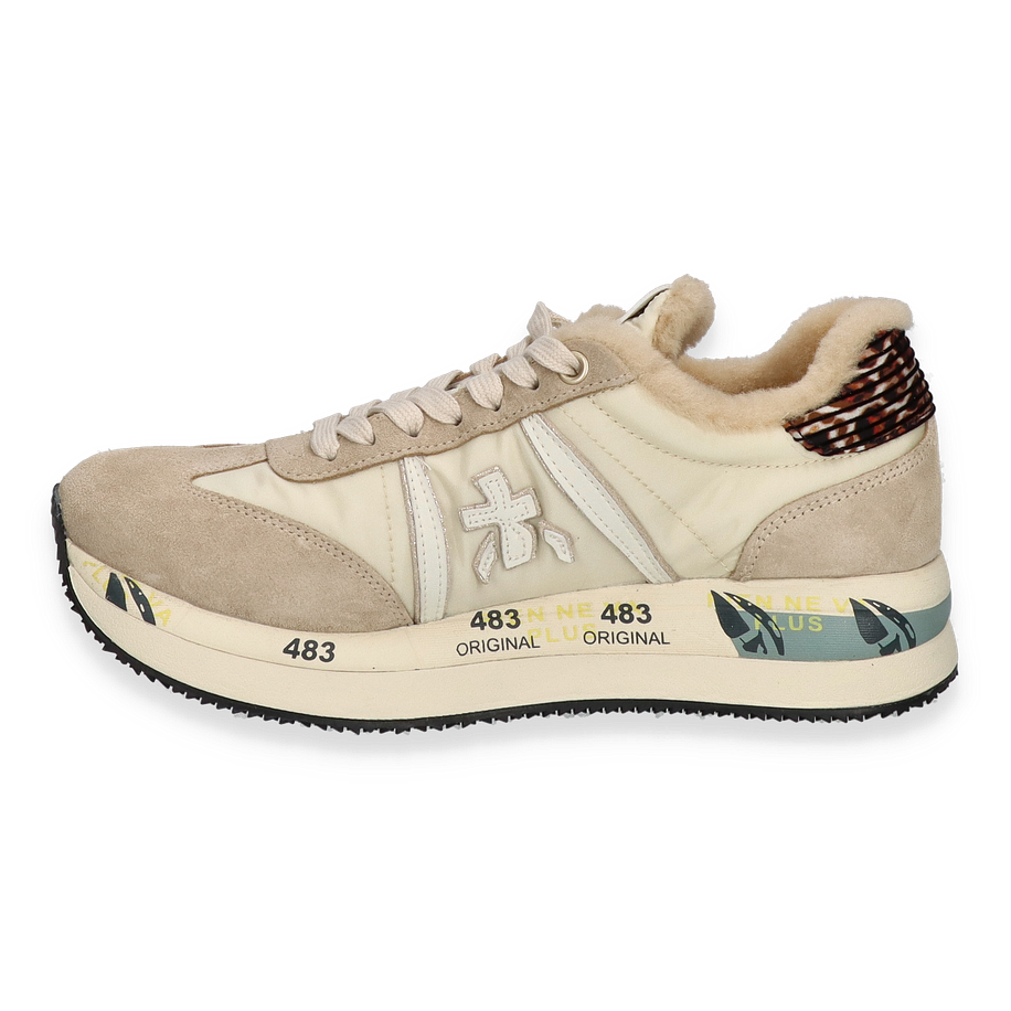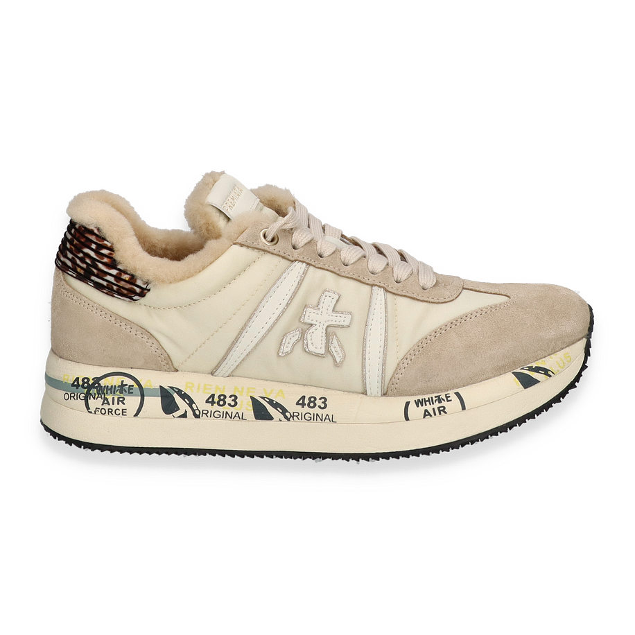 Der Premiata Sneaker CONNY für Damen präsentiert sich in einem eleganten Beige-Ton, der sowohl zeitlos als auch vielseitig kombinierbar ist. Das Design besticht durch die harmonische Kombination aus Leder, Textil und sonstigem Material, die dem Schuh eine luxuriöse und zugleich sportliche Note verleiht. Die markanten Details und das warme Futter sorgen für zusätzlichen Komfort und Stil, während die dezente Markenprägung einen Hauch von Exklusivität vermittelt.