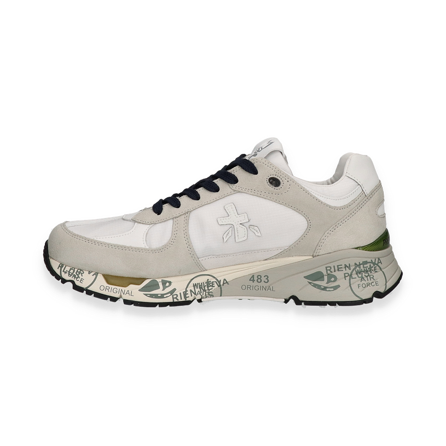 Der Premiata MASE Sneaker für Herren präsentiert sich in einem stilvollen Design, das Eleganz und Sportlichkeit vereint. Die Kombination aus weißem und grauem Leder sowie Textil verleiht dem Schuh einen modernen und vielseitigen Look. Die markanten Details und die hochwertige Verarbeitung machen diesen Sneaker zu einem echten Hingucker. Die kontrastierenden Schnürsenkel und die auffällige Sohle mit grafischen Elementen unterstreichen den individuellen Charakter dieses Modells.