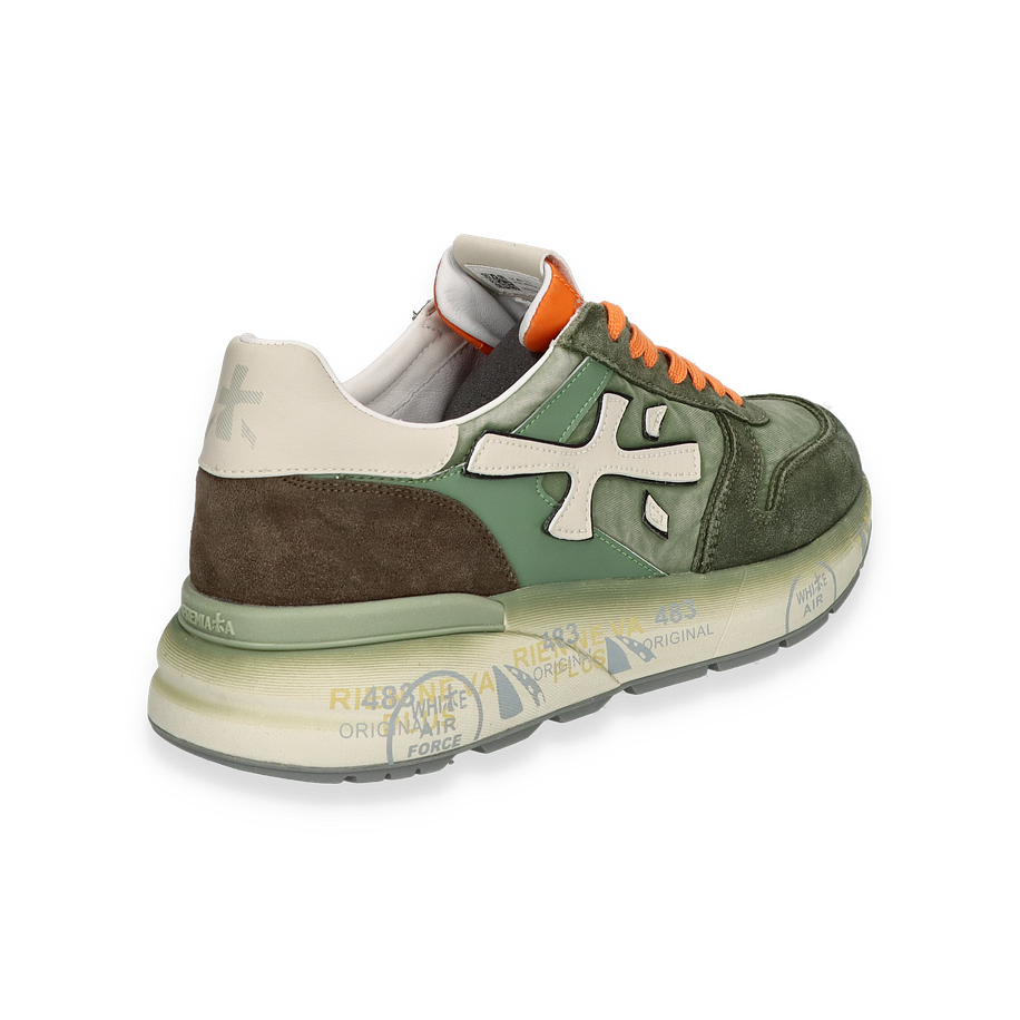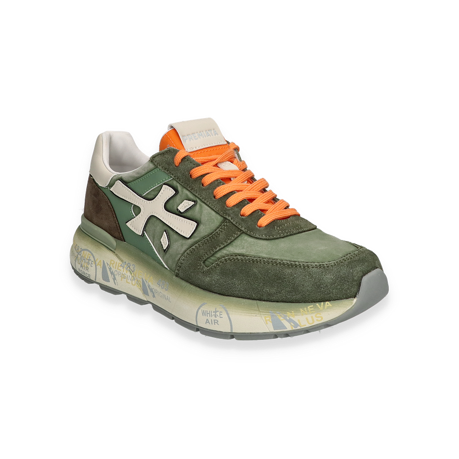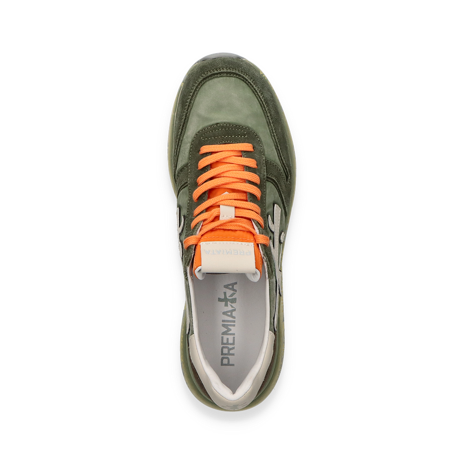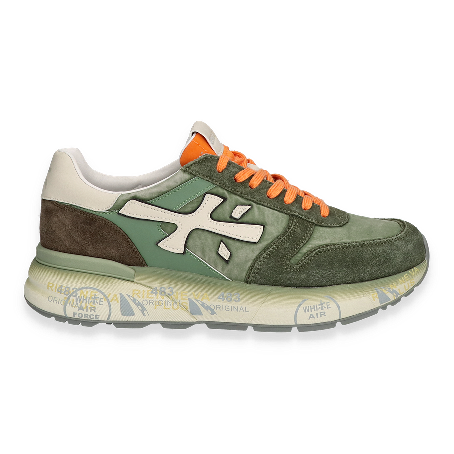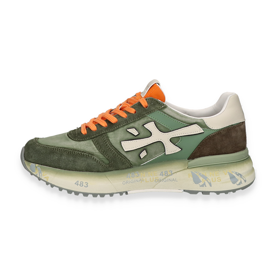 Der Premiata Sneaker MICK in Grün verkörpert stilvolle Eleganz und sportliche Funktionalität. Die harmonische Kombination aus Leder, Textil und sonstigen Materialien verleiht diesem Schuh einen einzigartigen Look. Die auffälligen orangefarbenen Schnürsenkel setzen einen lebendigen Akzent, während das subtile Markenlogo und die kontrastierenden Details das Design abrunden. Die grüne Farbgebung sorgt für eine frische und moderne Optik, die sich vielseitig kombinieren lässt.