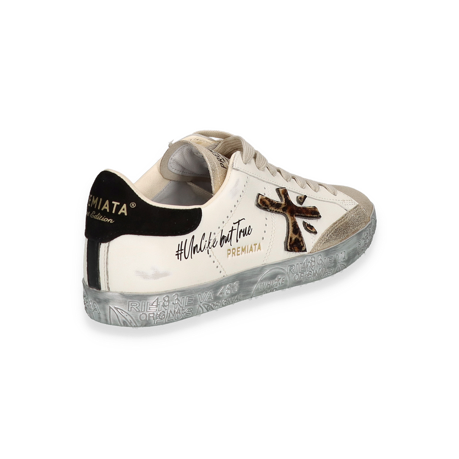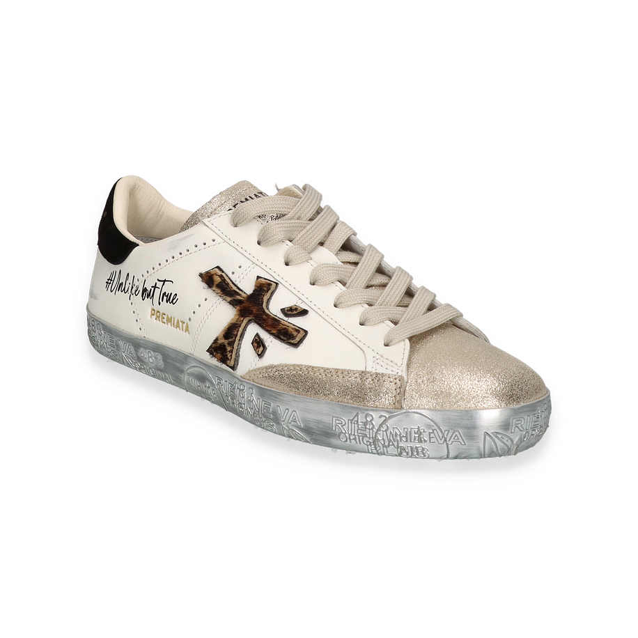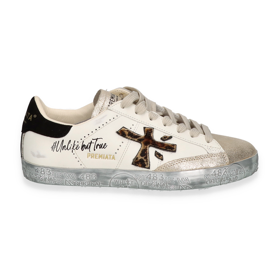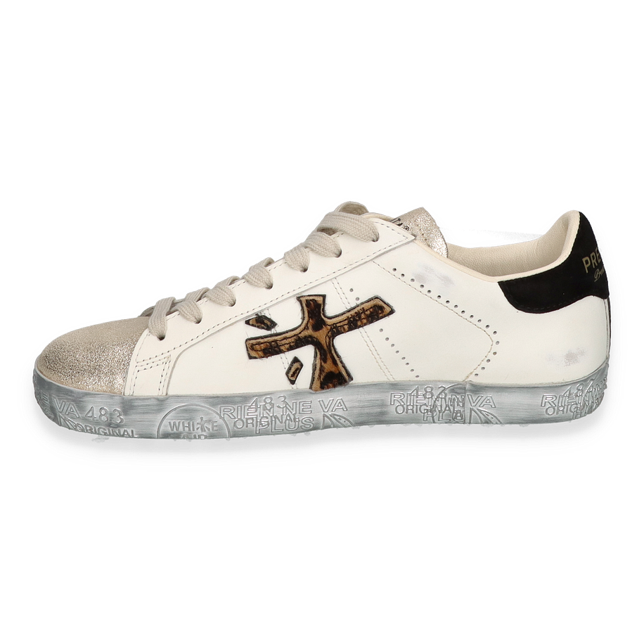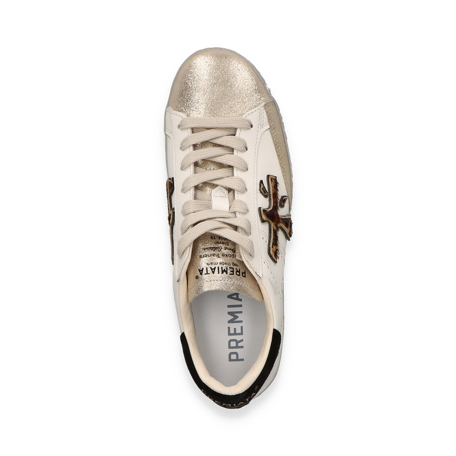 Der Premiata Sneaker STEVEND für Damen präsentiert sich in einem eleganten Weiß mit auffälligen Details. Das Design kombiniert Leder und Textil im Obermaterial, während die goldenen Akzente und das markante Logo einen Hauch von Luxus verleihen. Die stilvolle Kombination aus modernen und klassischen Elementen macht diesen Schuh zu einem echten Blickfang, ideal für modebewusste Frauen, die Wert auf Qualität und Stil legen.