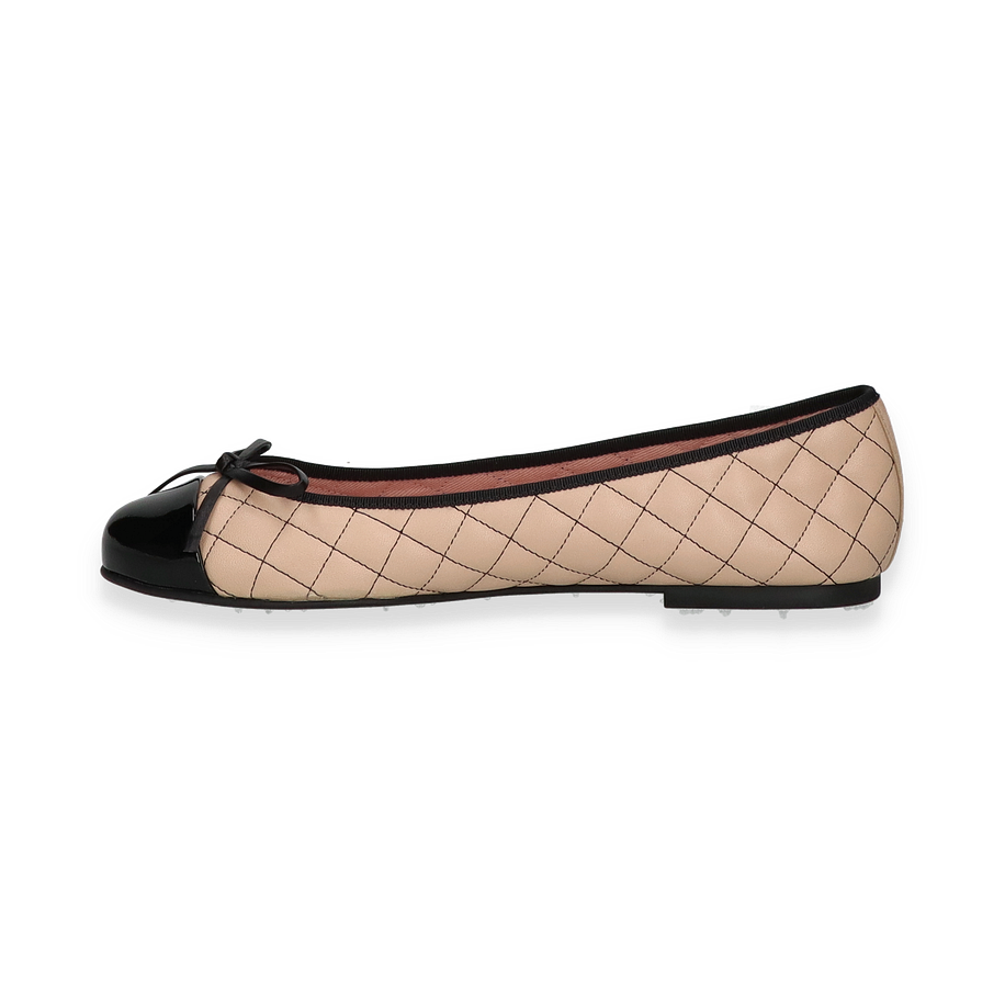 Die Pretty Ballerinas ROSARIO für Damen präsentieren sich in einem eleganten Design, das durch die Kombination von beige und schwarz besticht. Der Schuh zeigt ein stilvolles, gestepptes Muster auf dem Obermaterial aus hochwertigem Leder, das durch eine glänzende schwarze Kappe und eine zierliche Schleife akzentuiert wird. Diese Ballerinas verkörpern zeitlose Eleganz und sind die perfekte Wahl für anspruchsvolle Anlässe oder den täglichen Chic.