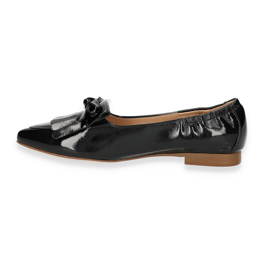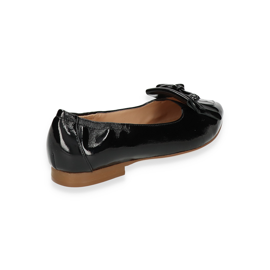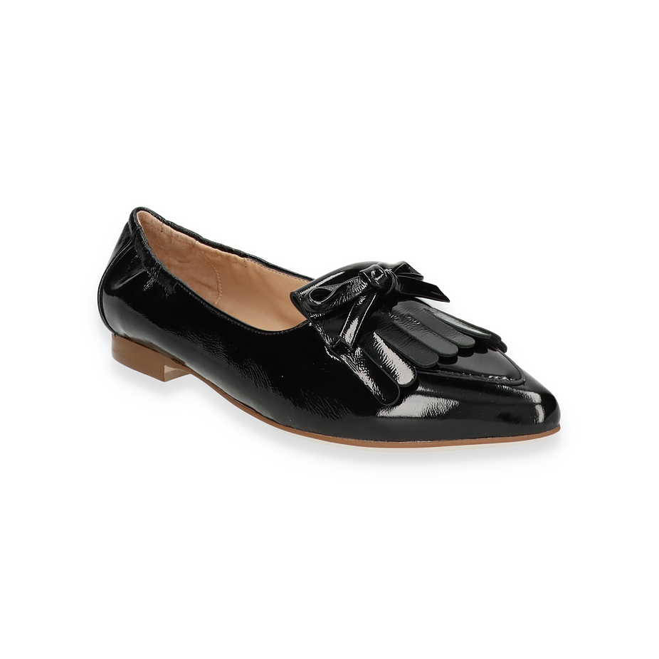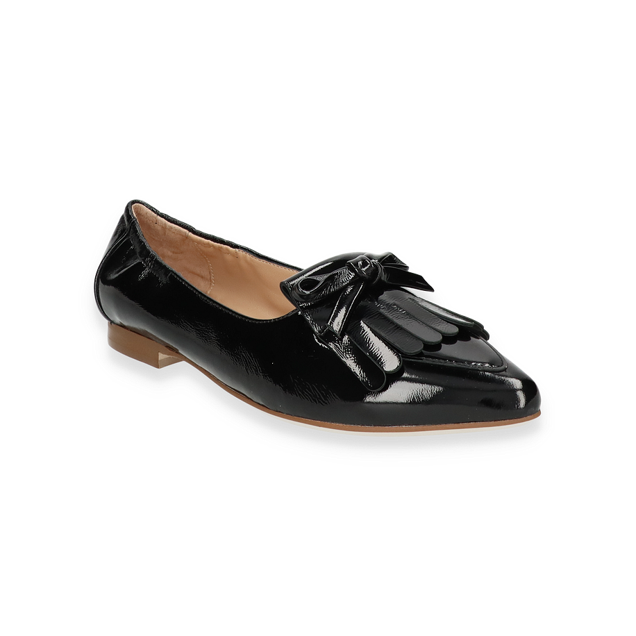 Preis inkl. MwSt.Der Ralph Harrison Slipper JEANINE für Damen präsentiert sich in einem eleganten Schwarz, das zeitlose Raffinesse ausstrahlt. Die glänzende Lederoberfläche verleiht dem Schuh einen luxuriösen Touch, während die dekorative Schleife und die stilvollen Fransen auf der Vorderseite für ein modisches Statement sorgen. Der dezente Absatz von 1 cm bietet Komfort und Eleganz zugleich, ideal für den täglichen Gebrauch oder besondere Anlässe.