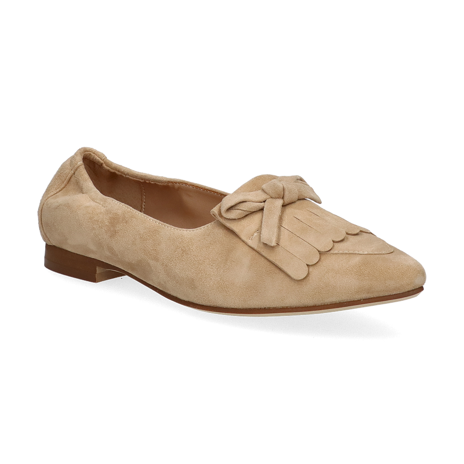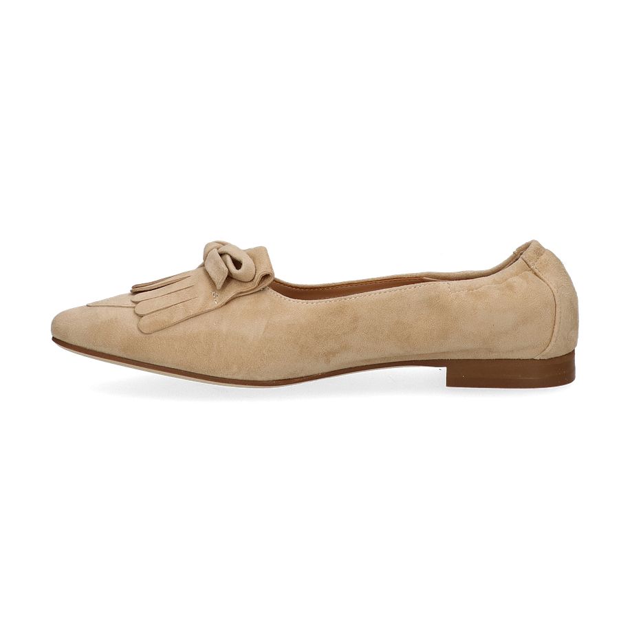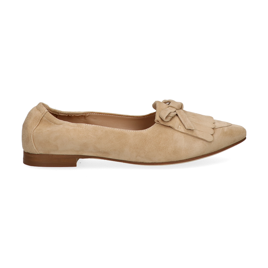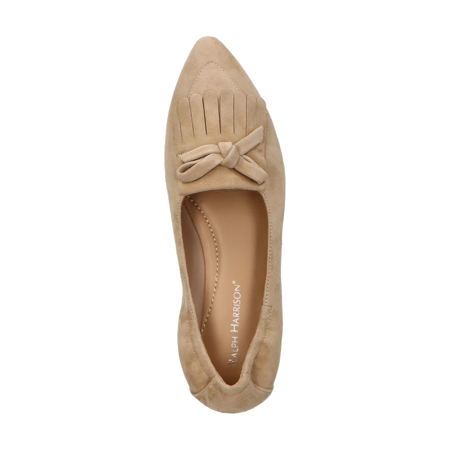 Der Ralph Harrison Slipper "JEANINE" für Damen präsentiert sich in einem eleganten Beige, das sich harmonisch in jede Garderobe einfügt. Der Schuh besticht durch sein stilvolles Design mit einer dekorativen Schleife und Fransen auf der Vorderseite, die ihm eine besondere Note verleihen. Die flache Absatzhöhe von 1 cm sorgt für einen angenehmen Tragekomfort, während die spitz zulaufende Form dem Slipper eine moderne Silhouette verleiht.