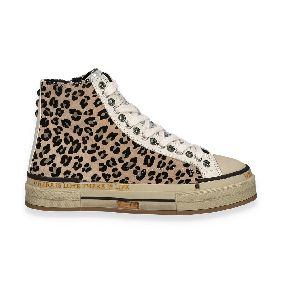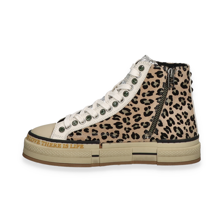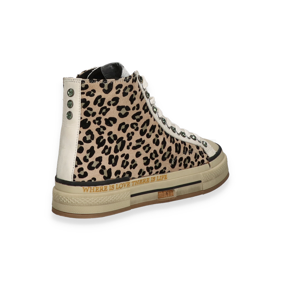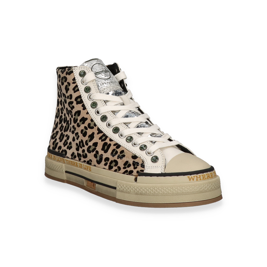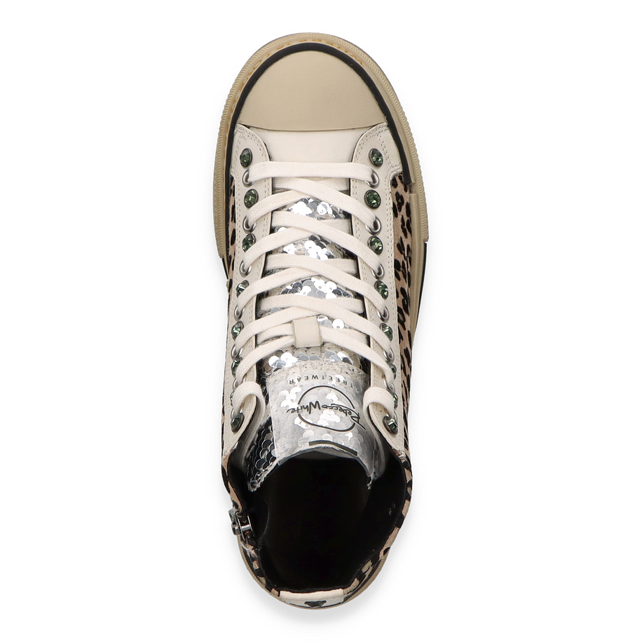 Preis inkl. MwSt.Entdecken Sie den stilvollen High-Top Sneaker von Rebecca White, der mit einem auffälligen Leopardenmuster in Beige und Bunt begeistert. Diese modischen Sneaker für Damen kombinieren trendige Akzente mit einem Hauch von Extravaganz. Die sorgfältig gestalteten Details, wie die glänzenden Pailletten und die markanten Schnürsenkelösen, verleihen dem Schuh einen einzigartigen Charakter. Der Schriftzug an der Sohle setzt ein zusätzliches modisches Statement und macht diesen Sneaker zu einem echten Hingucker.