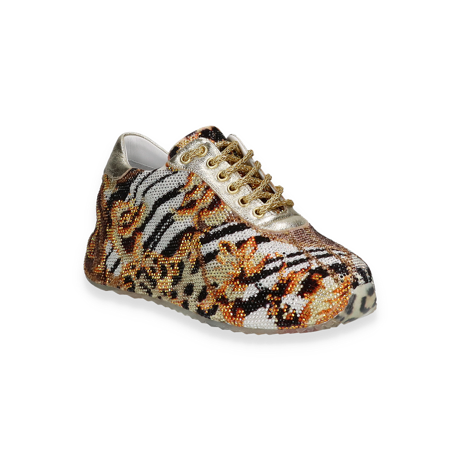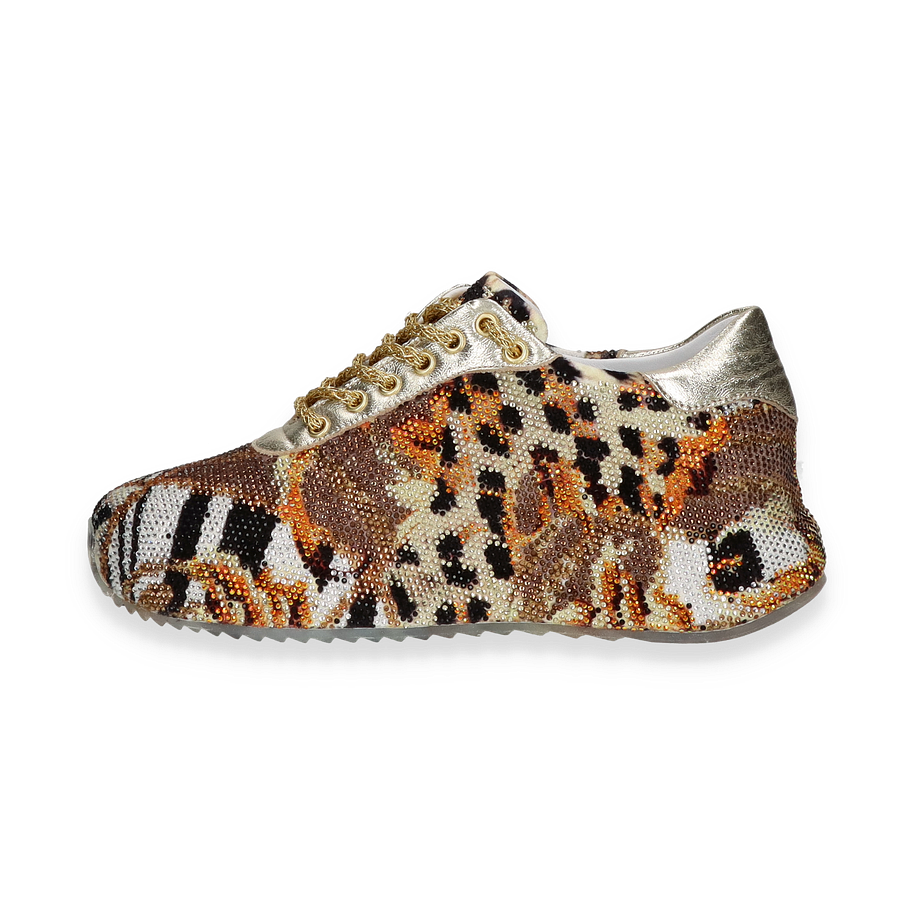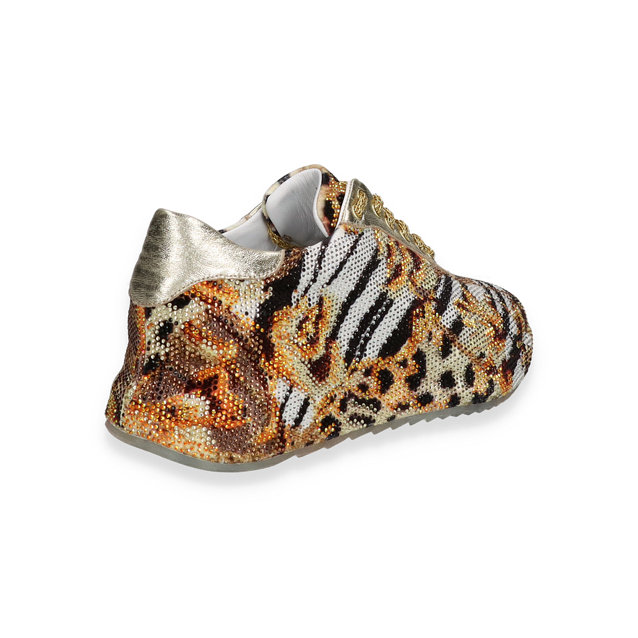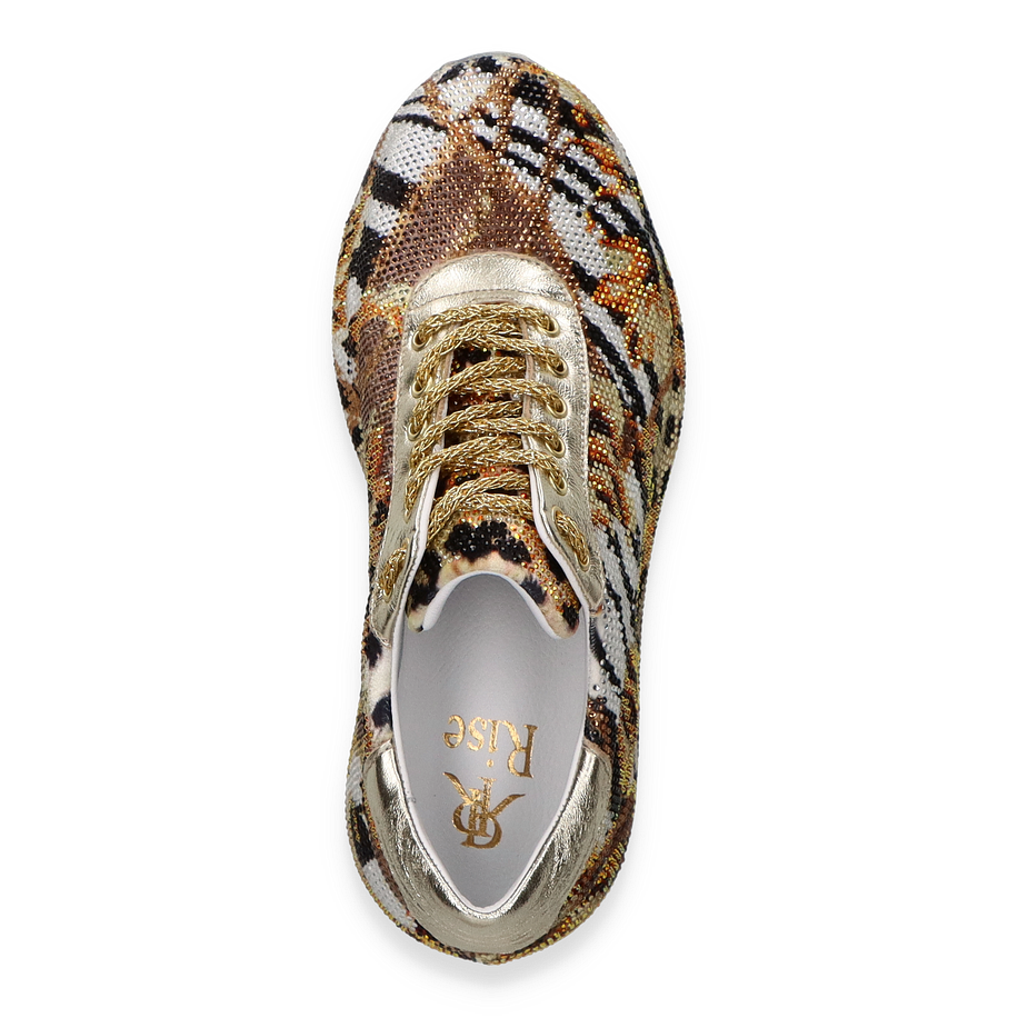 Die Schnürschuhe von Rise präsentieren sich in einem auffälligen gold-bunten Design, das durch ein lebendiges Tierfellmuster besticht. Diese für Damen entworfenen Schuhe kombinieren Eleganz mit einem Hauch von Extravaganz und sind ein echter Hingucker für modische Anlässe. Die goldenen Schnürsenkel und die glänzenden Akzente verleihen dem Schuh einen luxuriösen Touch, während die strukturierte Oberfläche für ein einzigartiges Erscheinungsbild sorgt.