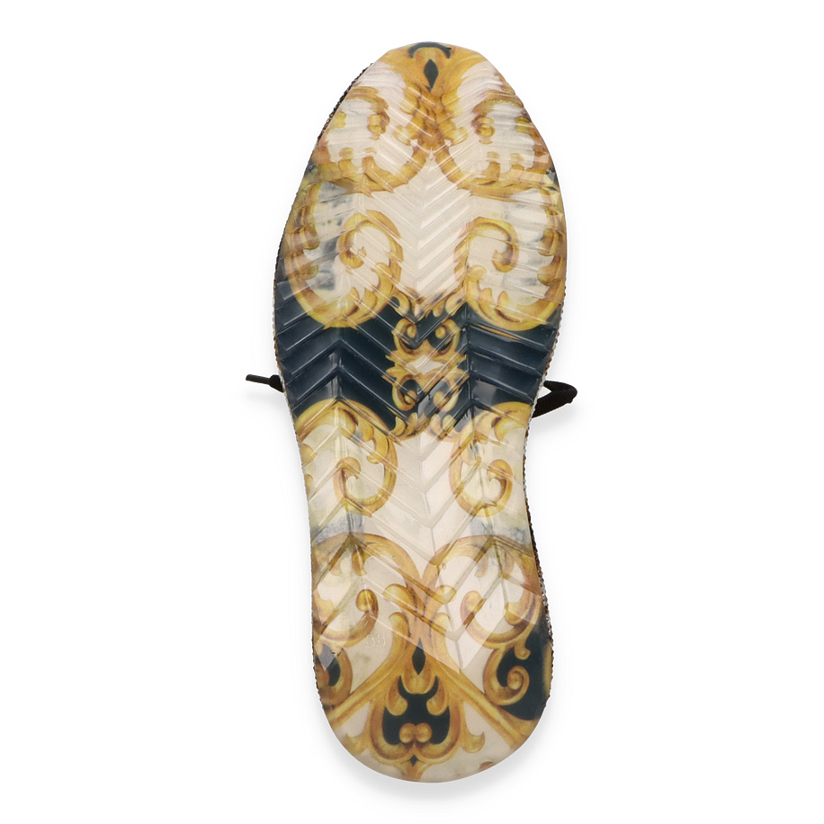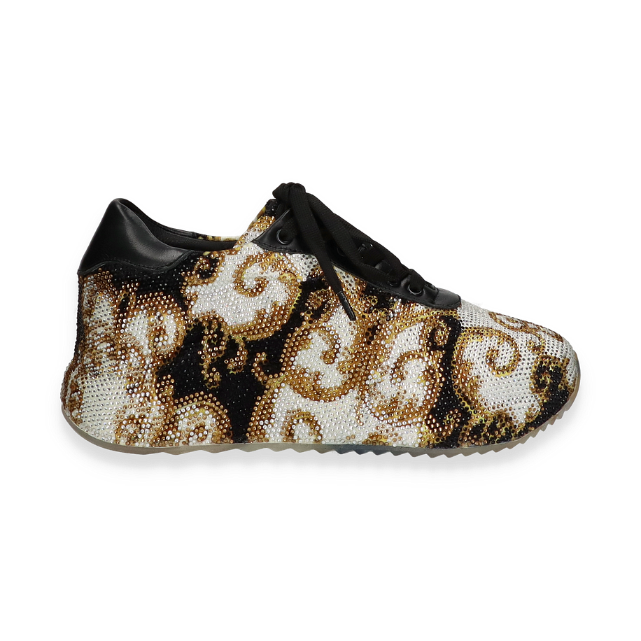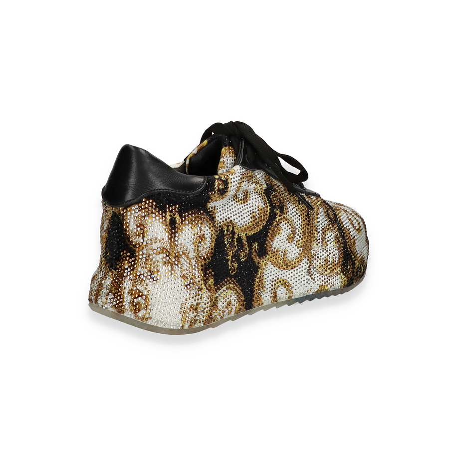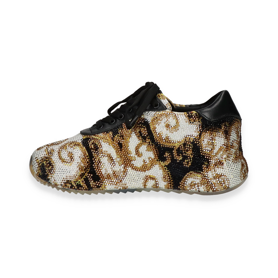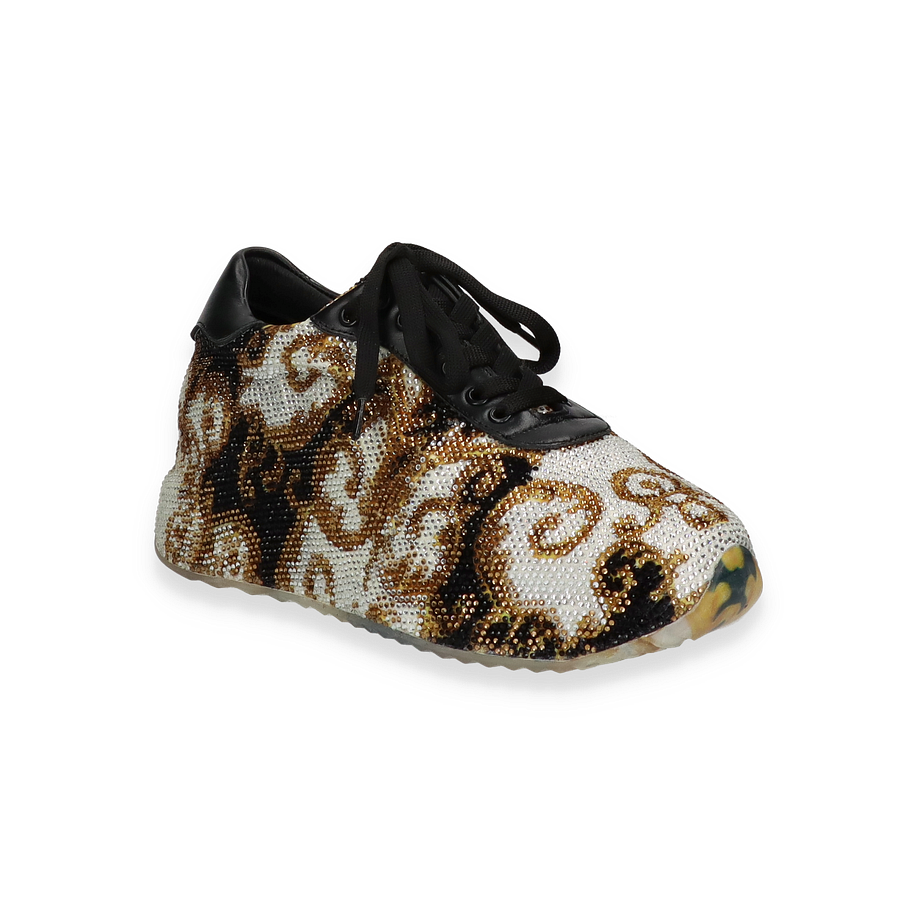 Entdecken Sie den Sneaker "Rise" für Damen, ein echtes Schmuckstück für Ihre Füße. Dieser Schuh besticht durch seine gold/silberne Farbgebung, komplett verziert mit bunten Strasssteinen, die ein ausgefallenes Muster ergeben. Der 4,5 cm hohe Absatz verleiht Ihnen eine elegante Haltung, während die goldene Schnürsenkel einen Hauch von Luxus hinzufügen. Hergestellt aus hochwertigem Leder und sonstigem Material, bietet der Schuh eine komfortable Passform. Das Innenfutter und die Innensohle aus Leder sorgen für ein angenehmes Tragegefühl, während die Gummisohle für Rutschfestigkeit sorgt. Mit dem "Rise" Sneaker setzen Sie ein modisches Statement.