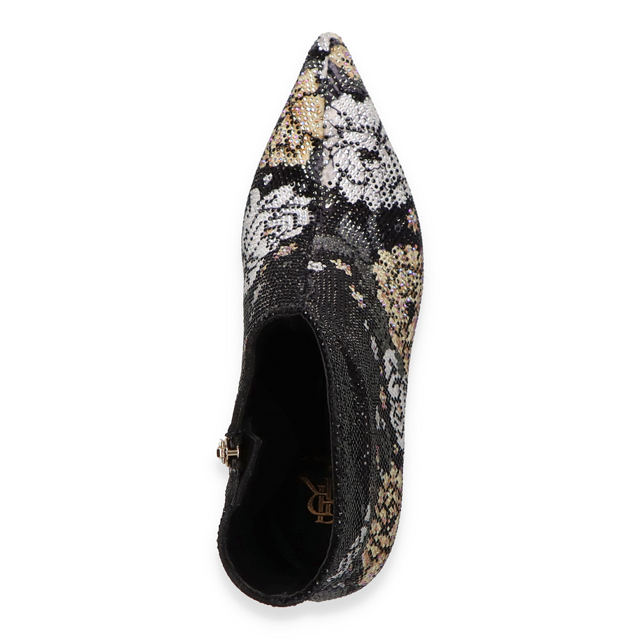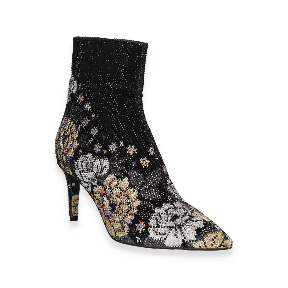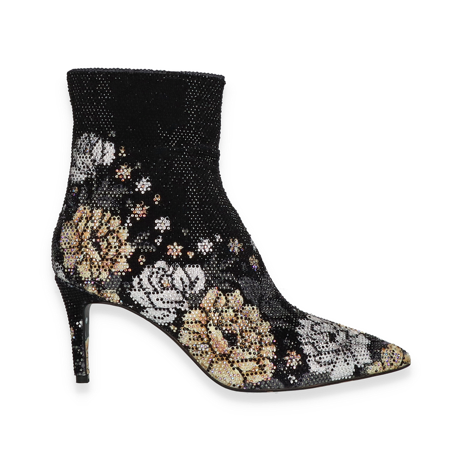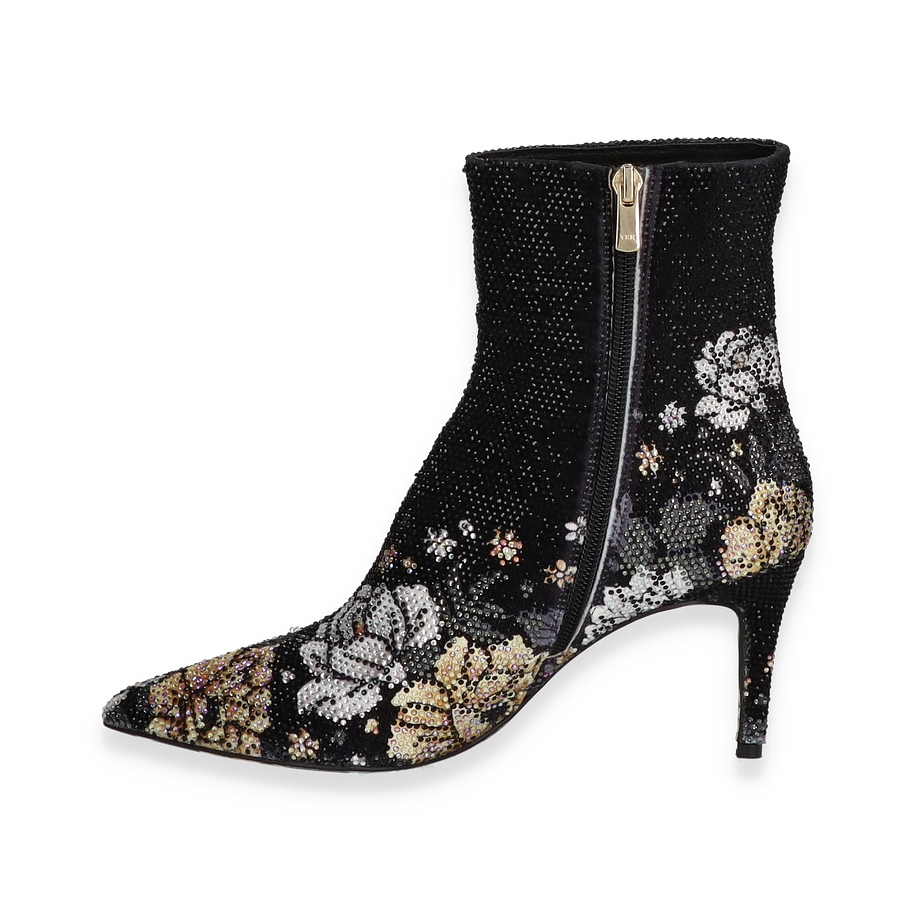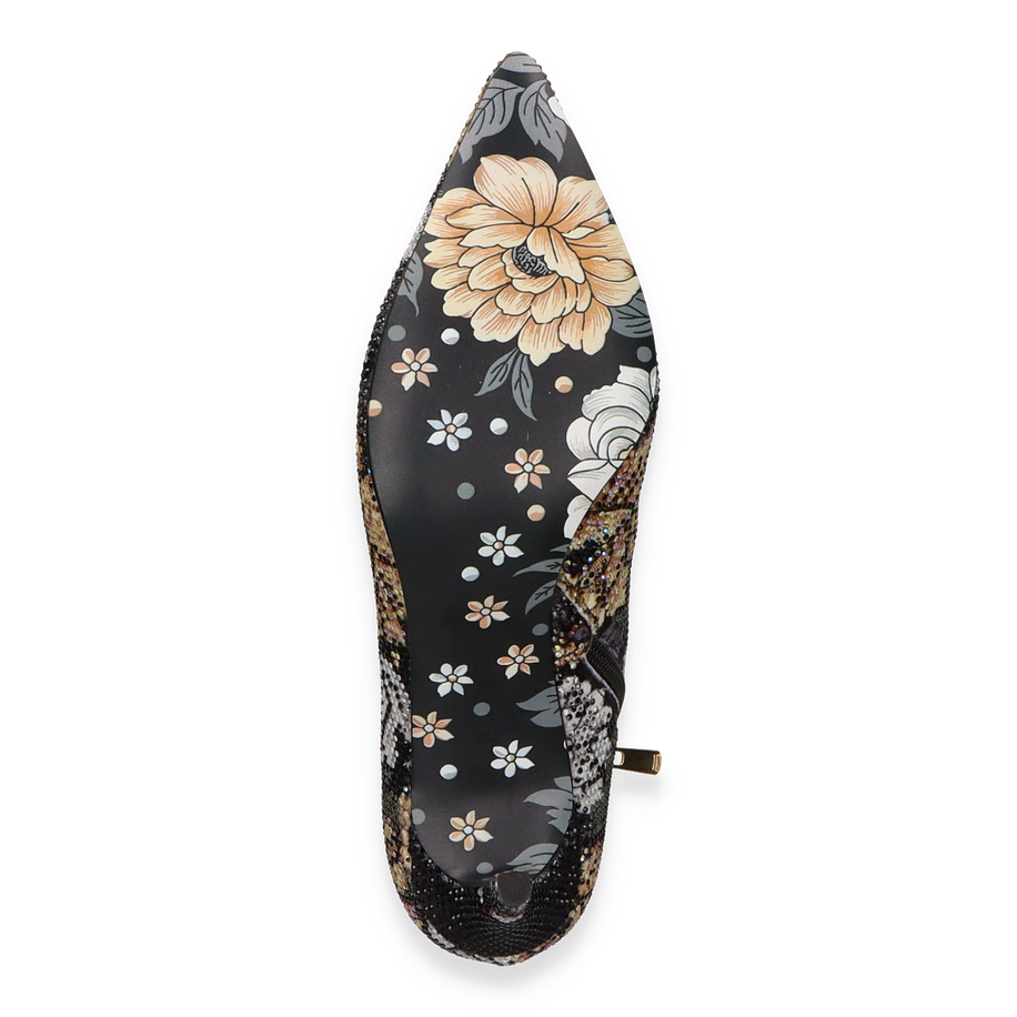 Preis inkl. MwSt.Diese exquisite Stiefelette von Rise für Damen besticht durch ihr auffälliges Design in schwarz/bunt. Der elegante, spitz zulaufende Schnitt wird durch ein florales Muster aus funkelnden Details ergänzt, das dem Schuh einen Hauch von Glamour verleiht. Der seitliche Reißverschluss sorgt für einen einfachen Einstieg und fügt sich nahtlos in das stilvolle Gesamtbild ein. Die bedruckte Sohle setzt einen verspielten Akzent und rundet das modische Erscheinungsbild perfekt ab.