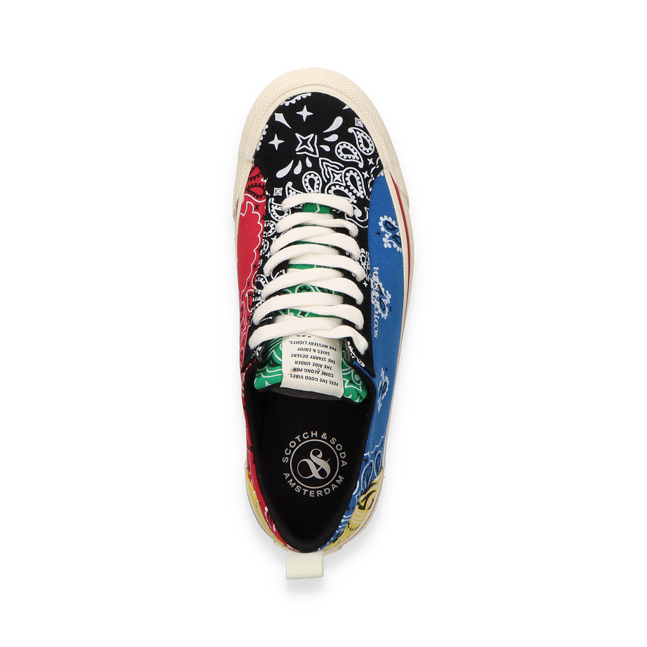 Preis inkl. MwSt.Der Scotch & Soda Sneaker WAGGER für Herren präsentiert sich in einem auffälligen Blau/Bunt-Design, das durch ein lebendiges Patchwork-Muster besticht. Die Kombination aus verschiedenen Farben und Mustern verleiht diesem Schuh einen einzigartigen, urbanen Look, der sowohl lässig als auch stilvoll ist. Die weiße Sohle und die Schnürsenkel setzen einen klaren Kontrast, während das Markenlogo subtil auf der Seite platziert ist. Dieser Sneaker ist ideal für modebewusste Herren, die ein Statement setzen möchten.