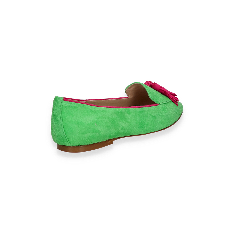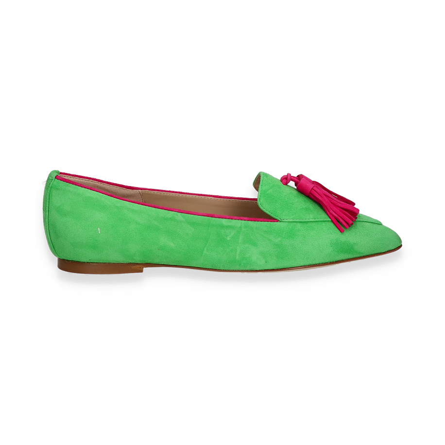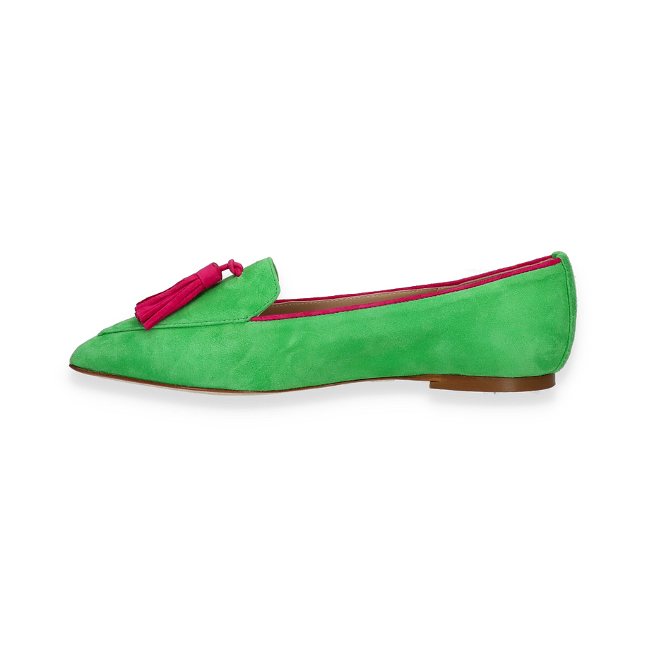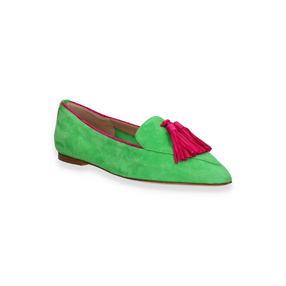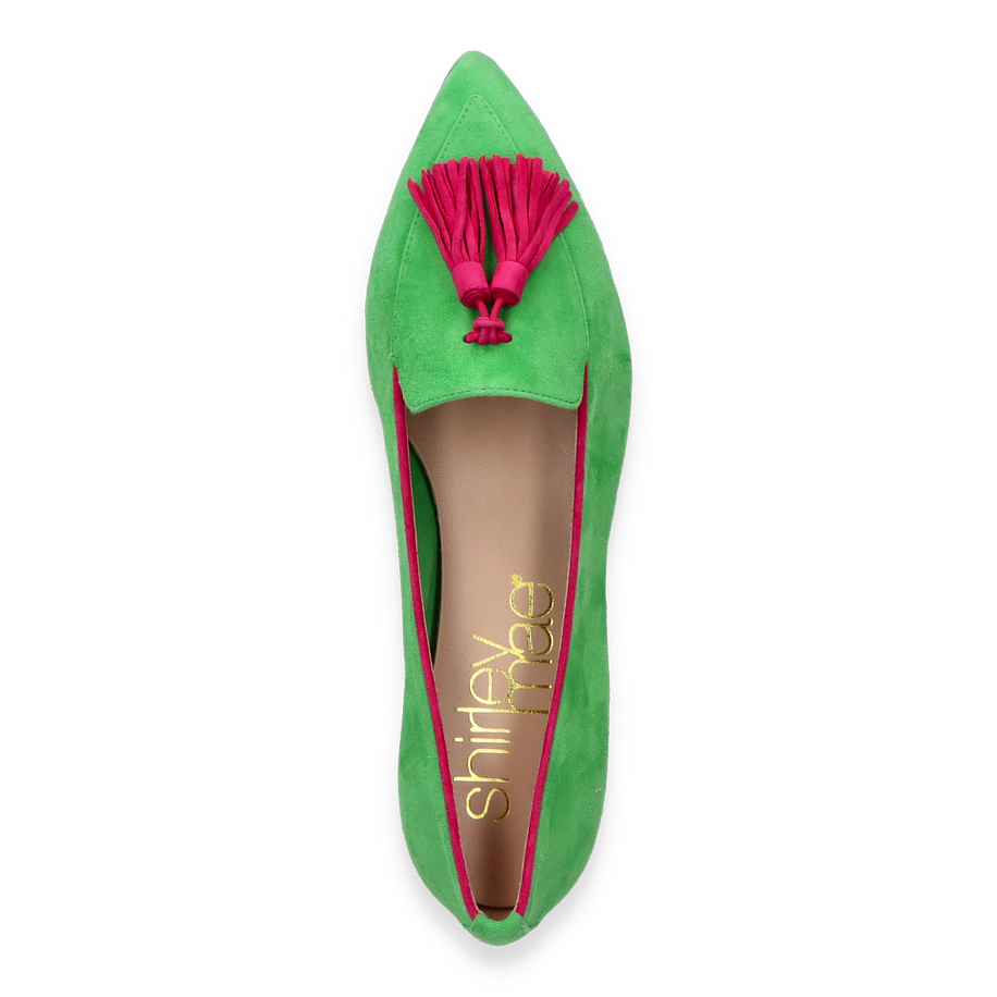 Entdecken Sie den Shirley Mae Slipper für Damen in der auffälligen Farbkombination grün-pink. Dieser Schuh besticht durch sein hochwertiges Leder, das sowohl als Obermaterial, als auch für das Innenfutter, die Innensohle und die Sohle verwendet wurde. Mit einer Absatzhöhe von 1 cm bietet er optimalen Tragekomfort. Ein besonderes Highlight sind die pinken Troddeln, die dem Schuh einen einzigartigen Charme verleihen. Der Shirley Mae Slipper vereint Qualität, Komfort und Design auf höchstem Niveau.