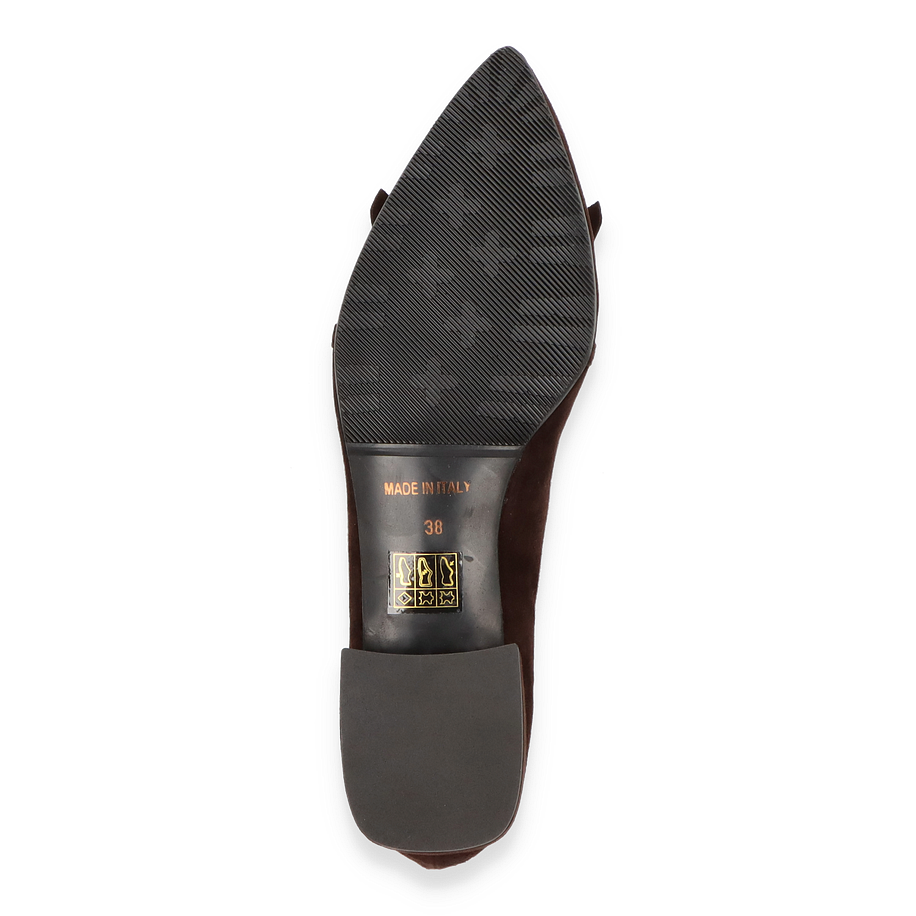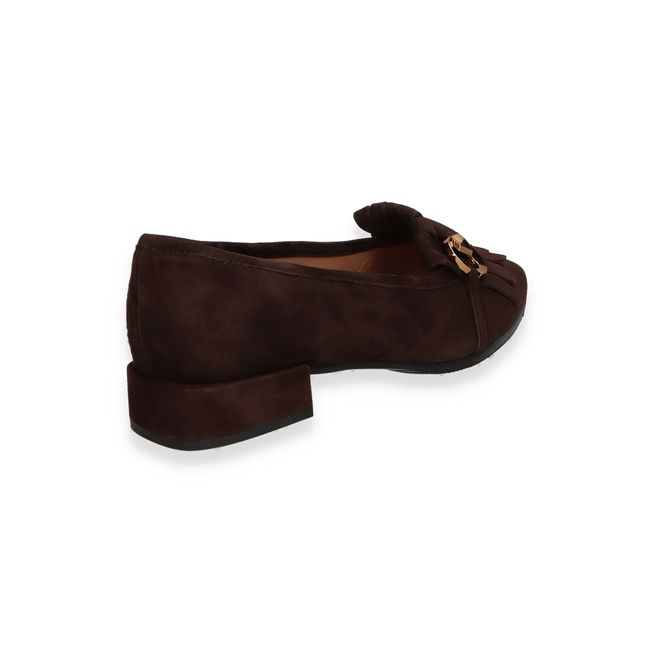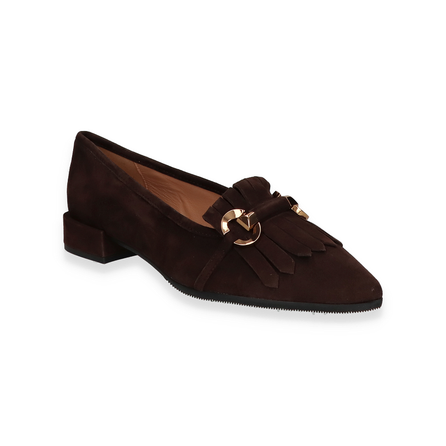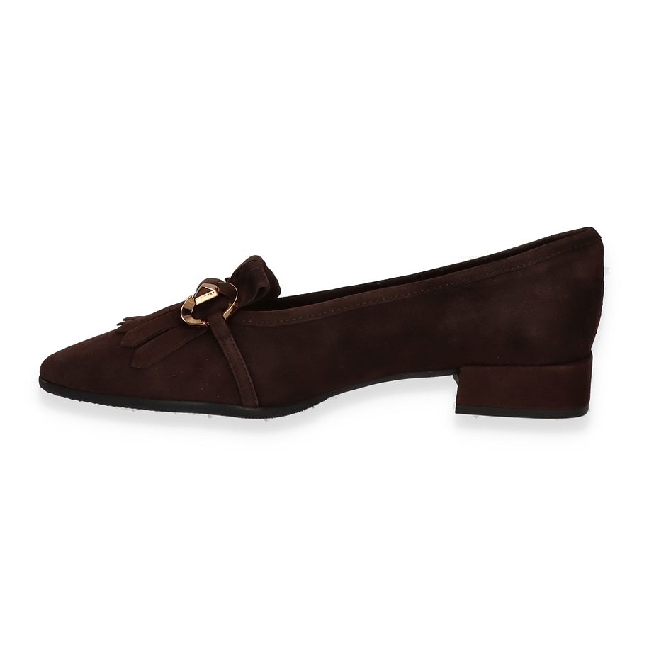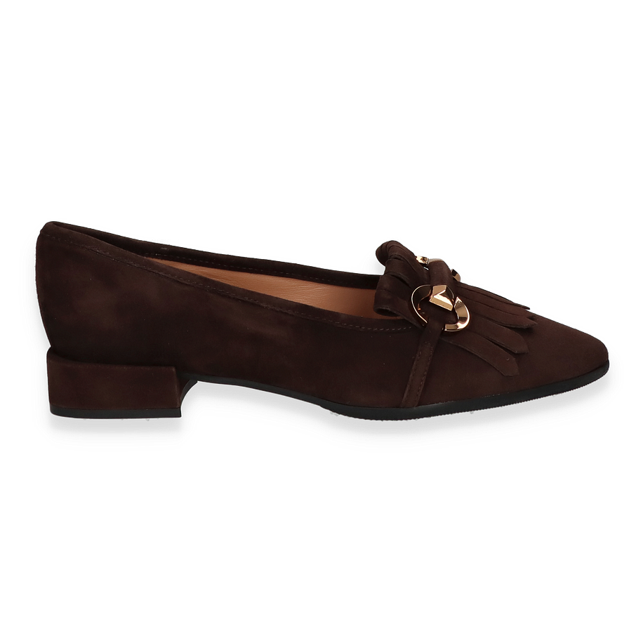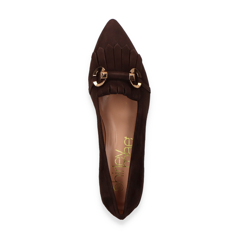 Preis inkl. MwSt.Entdecken Sie den eleganten Slipper von Shirley Mae für Damen in einem tiefen Dunkelbraun, der durch seine raffinierte Gestaltung besticht. Der Schuh präsentiert sich mit einem dezenten Absatz von 3 cm, der sowohl Komfort als auch Stil bietet. Die dekorativen Fransen und goldfarbenen Details auf dem Obermaterial verleihen diesem Modell eine luxuriöse Note, die sich perfekt für formelle Anlässe oder einen anspruchsvollen Alltagslook eignet.