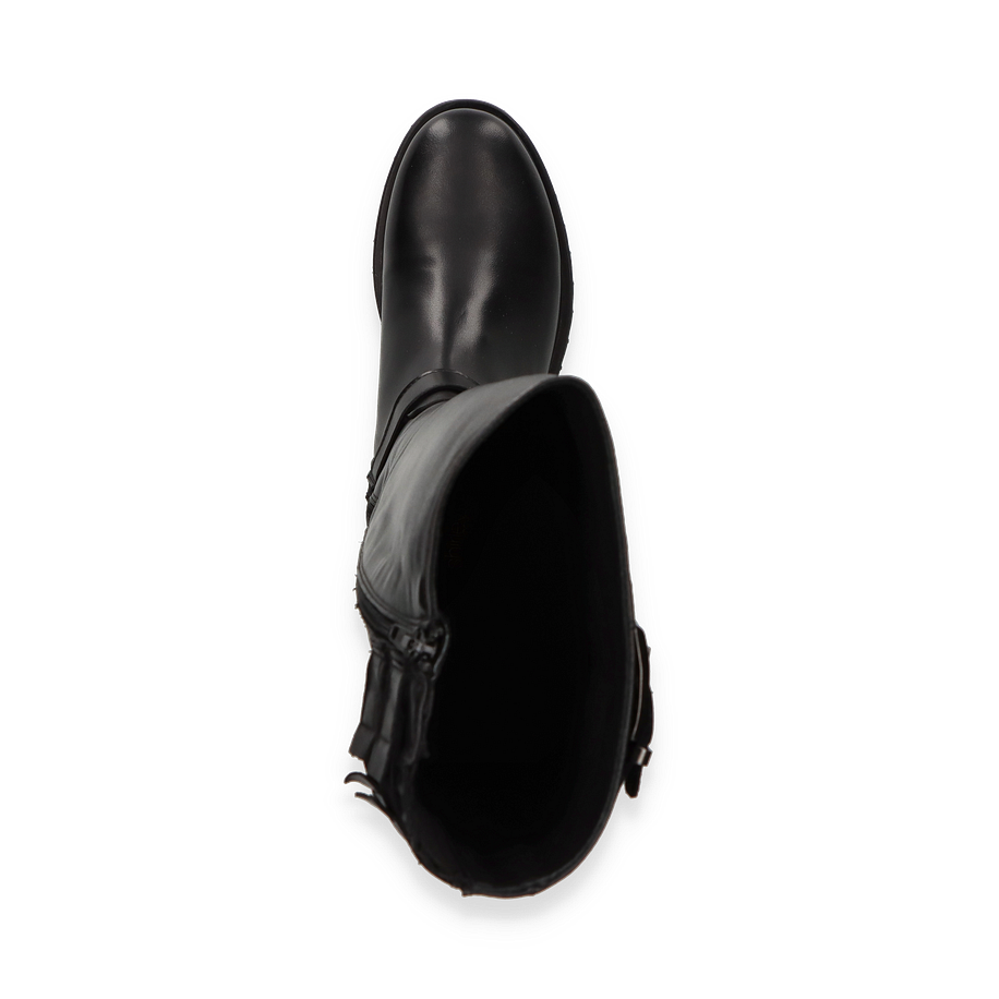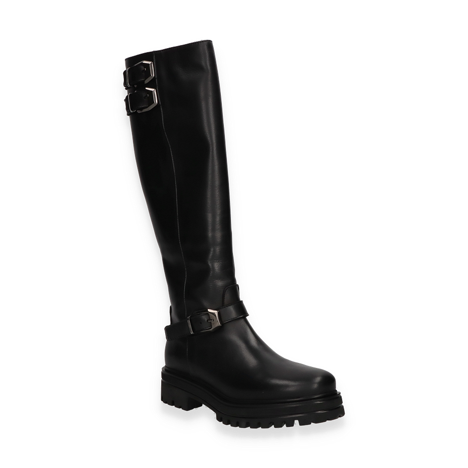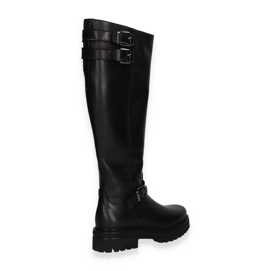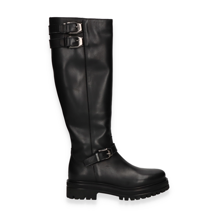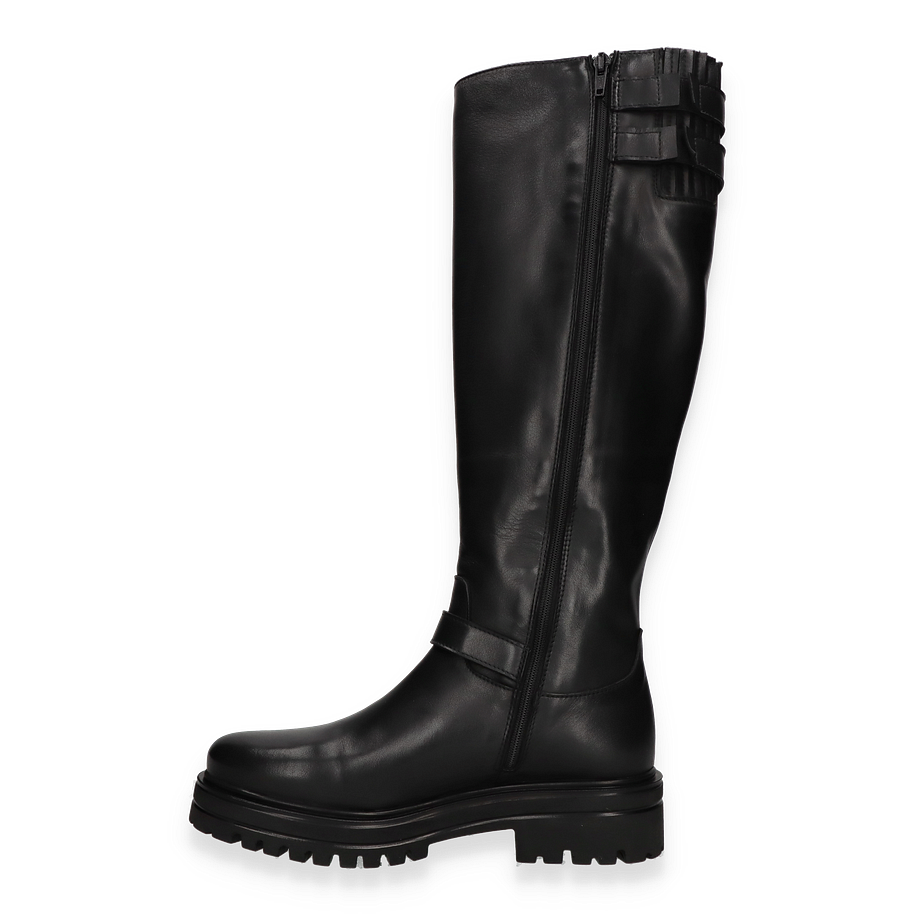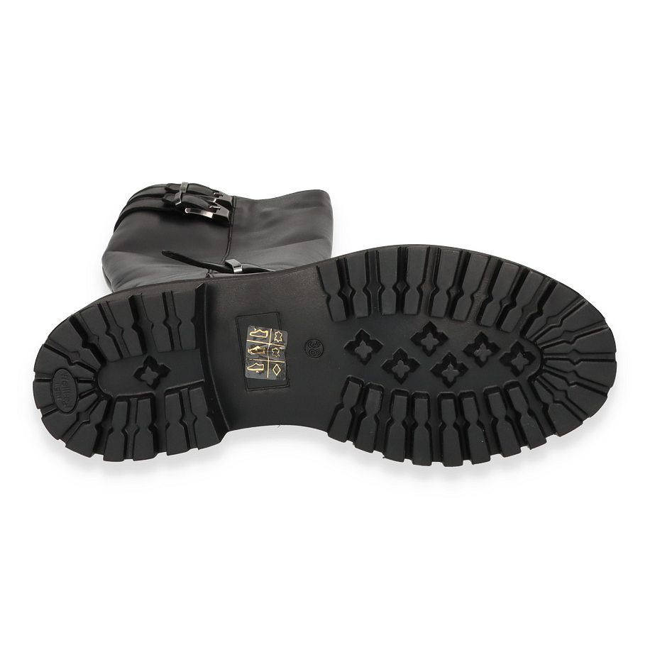 Die eleganten Stiefel von Shirley Mae in klassischem Schwarz verkörpern zeitlose Eleganz und Stil für Damen. Mit einer beeindruckenden Schafthöhe von 42 cm und einer Schaftweite von 30 cm bieten sie eine schmeichelhafte Silhouette. Die robusten Schnallen verleihen dem Design einen Hauch von Raffinesse und sorgen für einen sicheren Sitz. Der 5 cm hohe Absatz sorgt für eine subtile Erhöhung, während die profilierte Gummisohle für optimalen Halt und Stabilität sorgt.