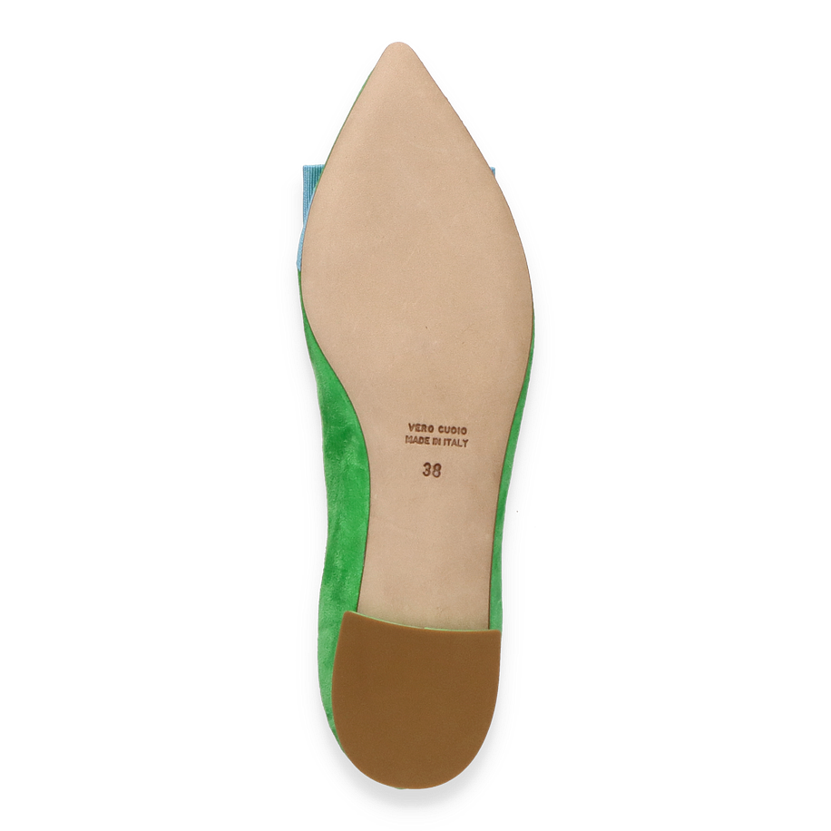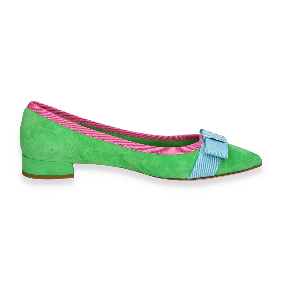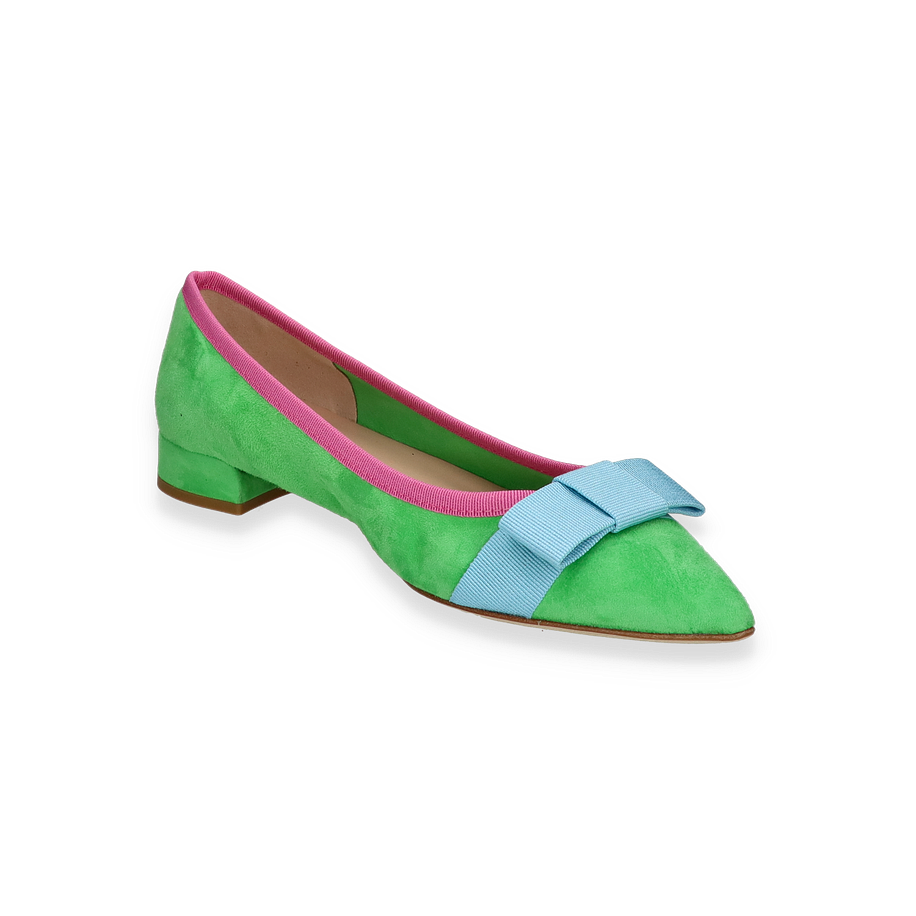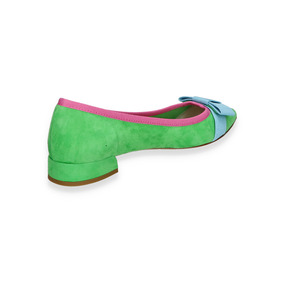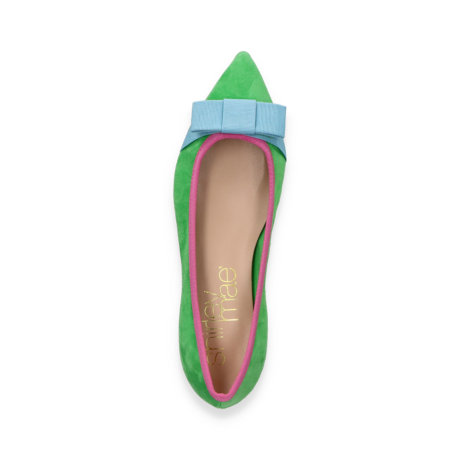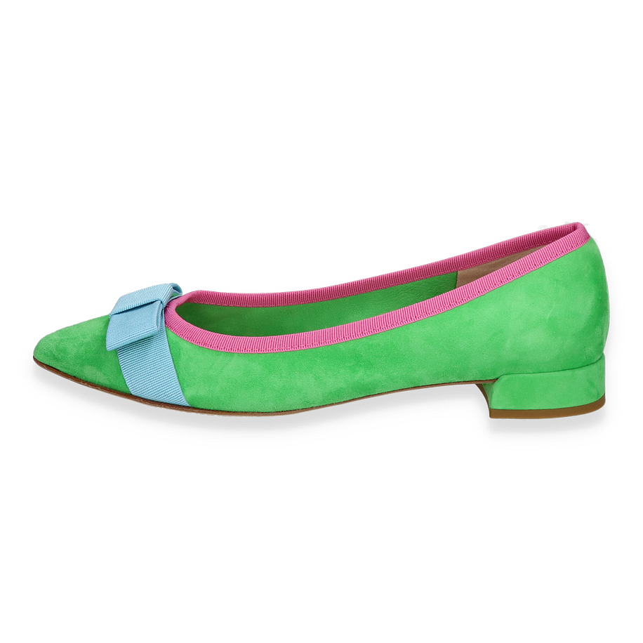 Die Shirley Mae Ballerinas in lebendigem Grün sind ein stilvolles Highlight für Damen. Der elegante Schuh besticht durch seine auffällige Farbkombination aus grünem Obermaterial und einem kontrastierenden blauen Schleifendetail. Der zarte rosa Rand verleiht dem Design eine feminine Note. Mit einem Absatz von 2 cm bieten diese Ballerinas eine subtile Erhöhung, die sowohl Komfort als auch Stil gewährleistet.