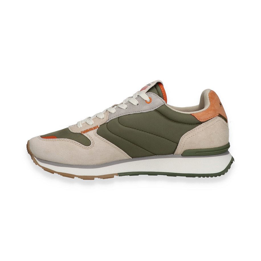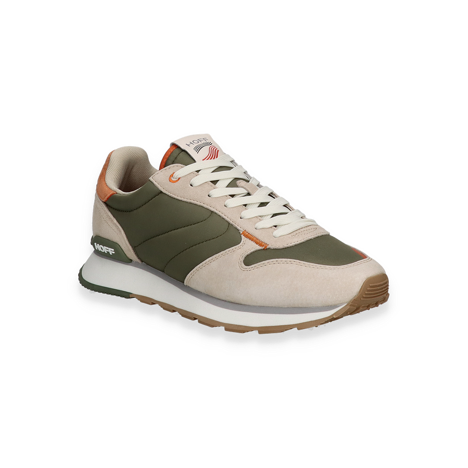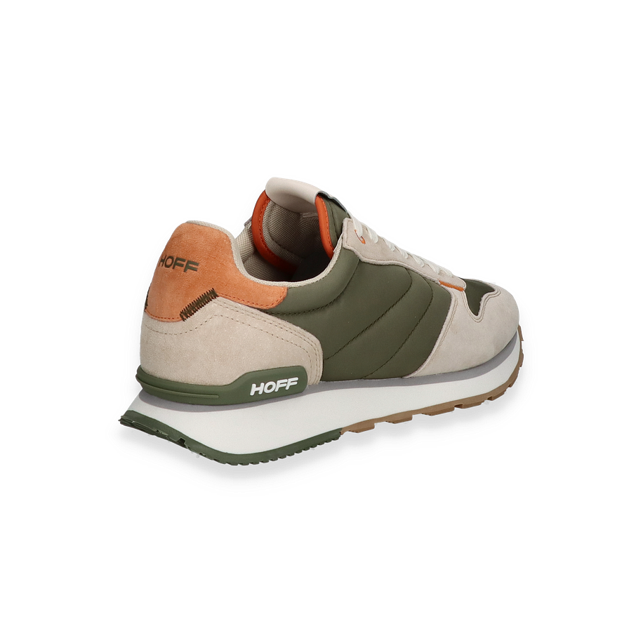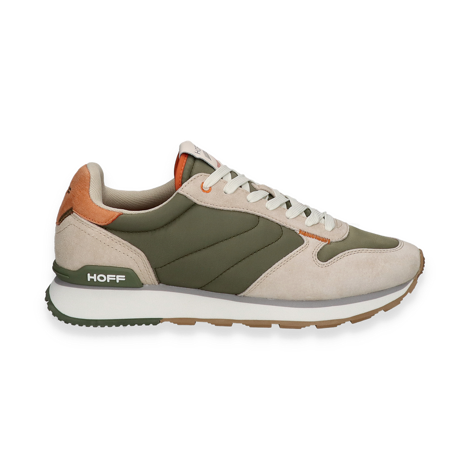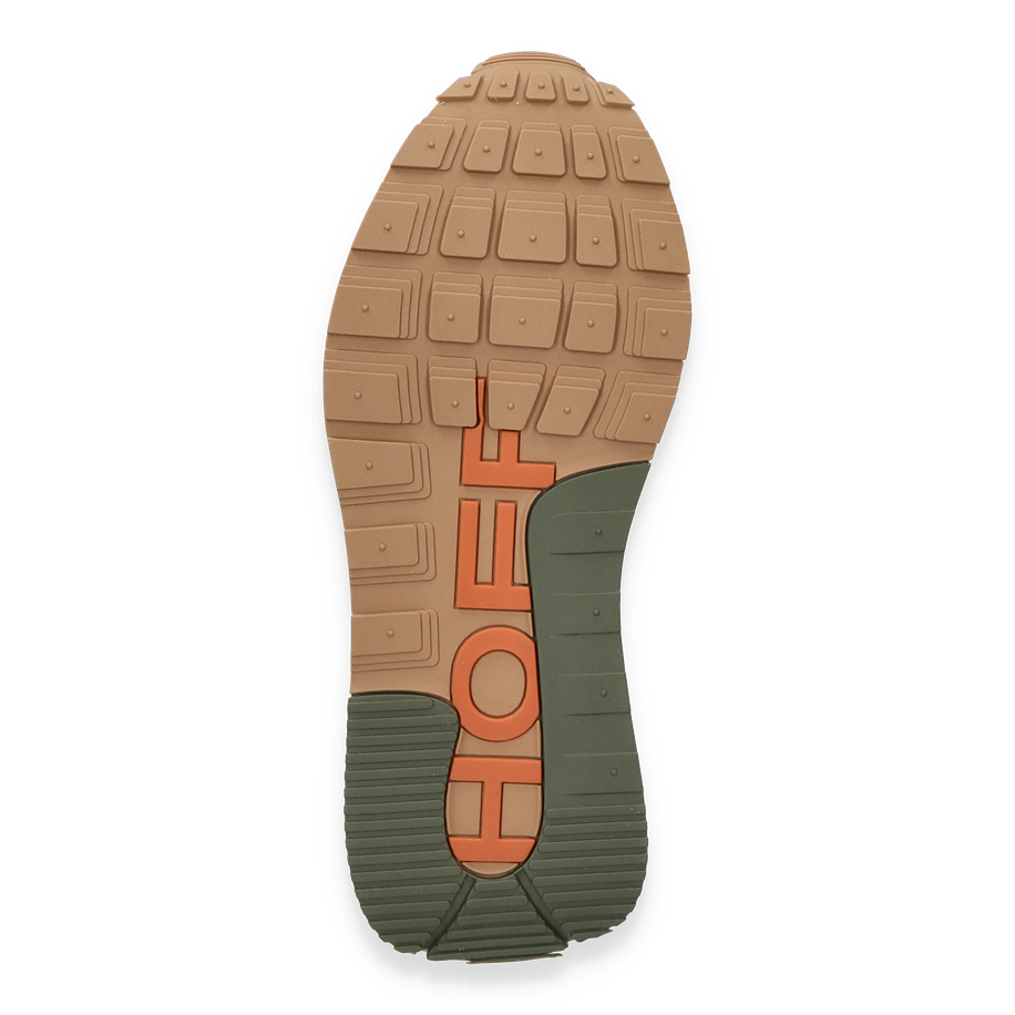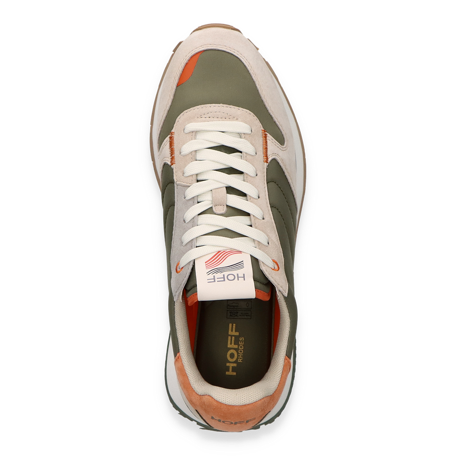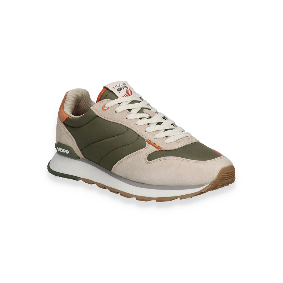 Der RHODES Sneaker von HOFF präsentiert sich in einem stilvollen Design, das olivgrüne und beige Farbtöne harmonisch kombiniert. Der Schuh besticht durch seine hochwertige Verarbeitung und das moderne Erscheinungsbild, das durch subtile orangefarbene Akzente ergänzt wird. Die Kombination aus Leder und Textil im Obermaterial verleiht dem Sneaker nicht nur eine ansprechende Optik, sondern auch eine angenehme Haptik. Die sorgfältig gestalteten Details und die markante Sohle unterstreichen den urbanen Charakter dieses Sneakers für Herren.