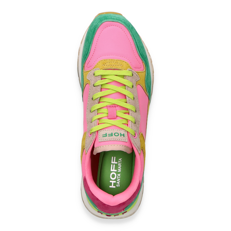 Entdecken Sie den Santa Marta Sneaker von Hoff, speziell entworfen für Damen. Dieser Schuh besticht durch seine farbenfrohe Kombination aus Pink und Grün, die jedem Outfit einen frischen Akzent verleiht. Der 3 cm hohe Absatz verleiht einen Hauch von Eleganz, ohne den Komfort zu beeinträchtigen. Das Obermaterial aus Leder und Textil garantiert Langlebigkeit und Qualität, während das Textilfutter und die Textil-Innensohle für optimalen Komfort sorgen. Die robuste Gummisohle bietet hervorragende Traktion und Haltbarkeit. Der Santa Marta Sneaker ist mehr als nur ein Schuh - er ist ein Stilstatement.