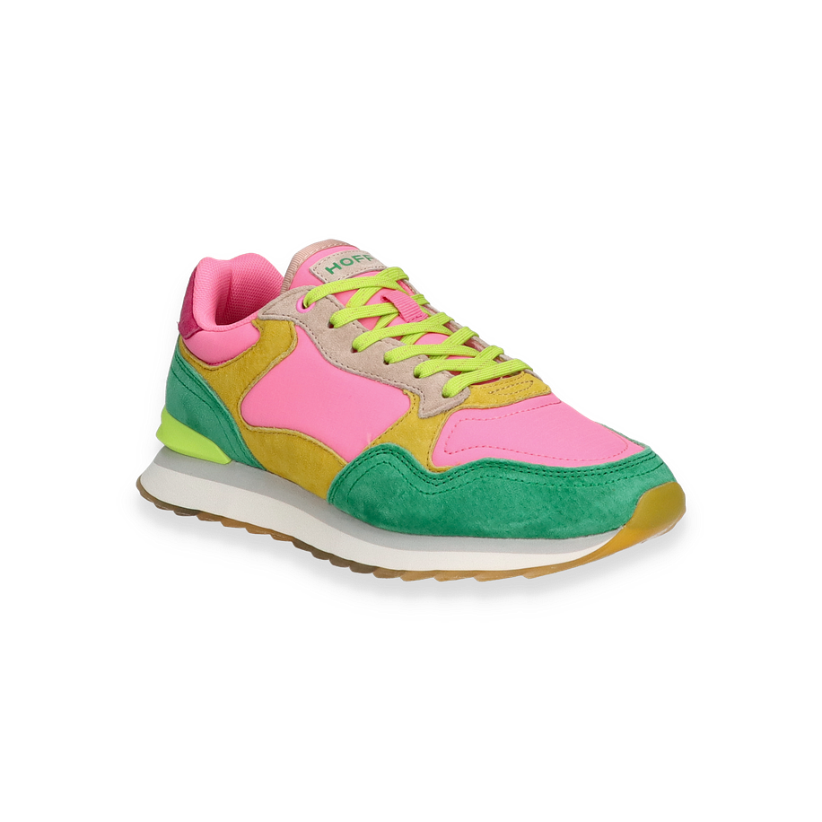 Die Hoff Santa Marta Schnürschuhe für Damen präsentieren sich in einem lebendigen Farbmix aus Pink, Grün und Gelb, der jedem Outfit einen frischen Akzent verleiht. Das Design kombiniert geschickt Leder- und Textilmaterialien im Obermaterial, was nicht nur für eine ansprechende Optik sorgt, sondern auch für Langlebigkeit und Komfort. Die kontrastierenden Farben und die sorgfältig gearbeiteten Details machen diesen Schuh zu einem echten Blickfang.