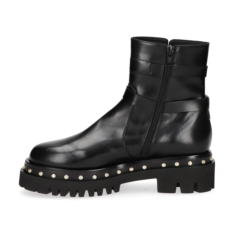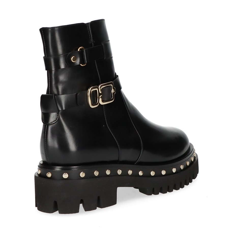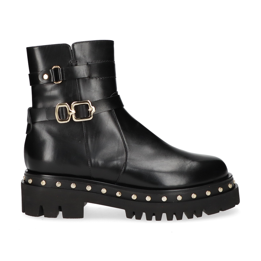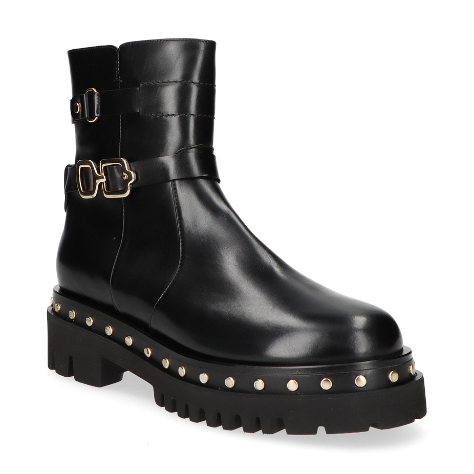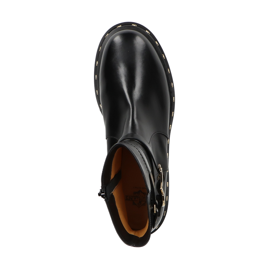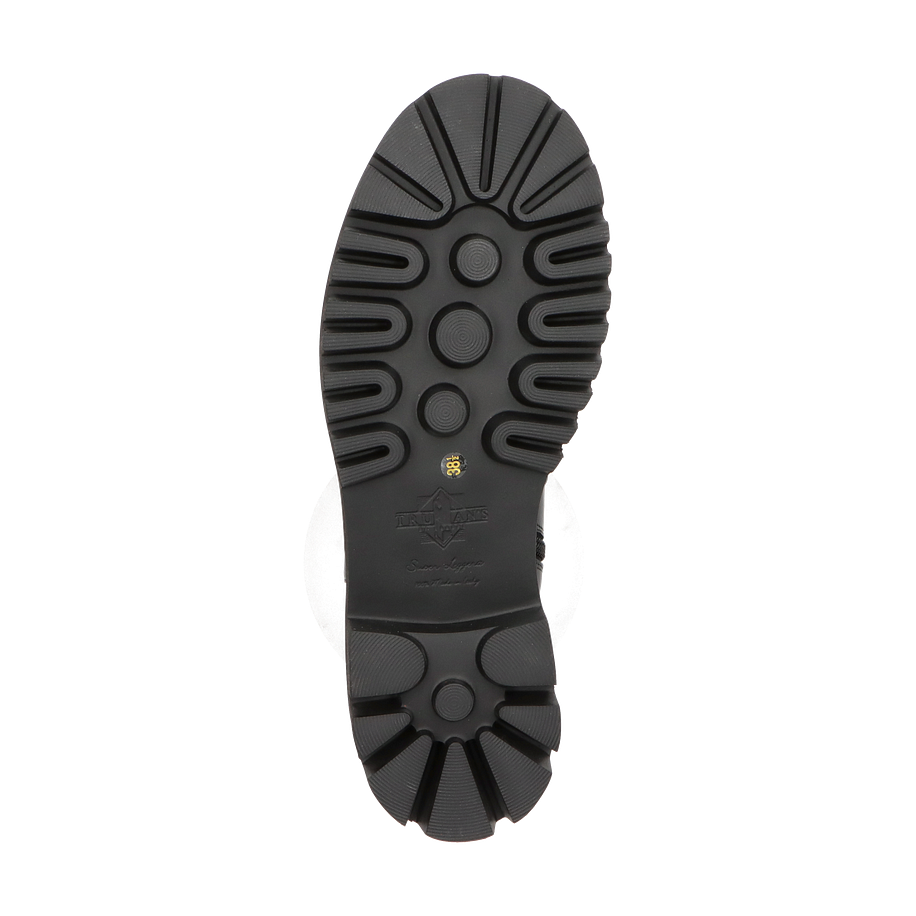 Die Trumans Boots in elegantem Schwarz präsentieren sich als stilvolle Wahl für Damen, die Wert auf Qualität und Design legen. Der robuste Look wird durch die auffälligen Schnallen und die dekorativen Nieten entlang der Sohle unterstrichen. Die glatte Lederoberfläche verleiht den Boots einen luxuriösen Glanz, während der seitliche Reißverschluss für einfaches An- und Ausziehen sorgt. Mit einer markanten Profilsohle bieten diese Boots nicht nur Stil, sondern auch Stabilität und Komfort.