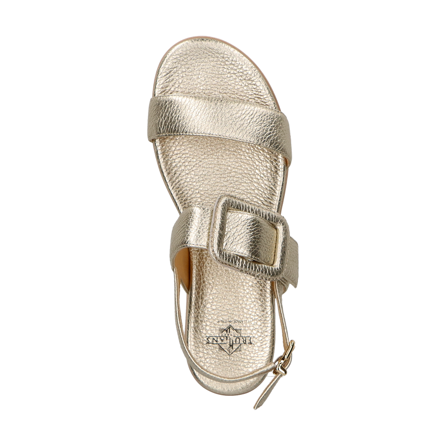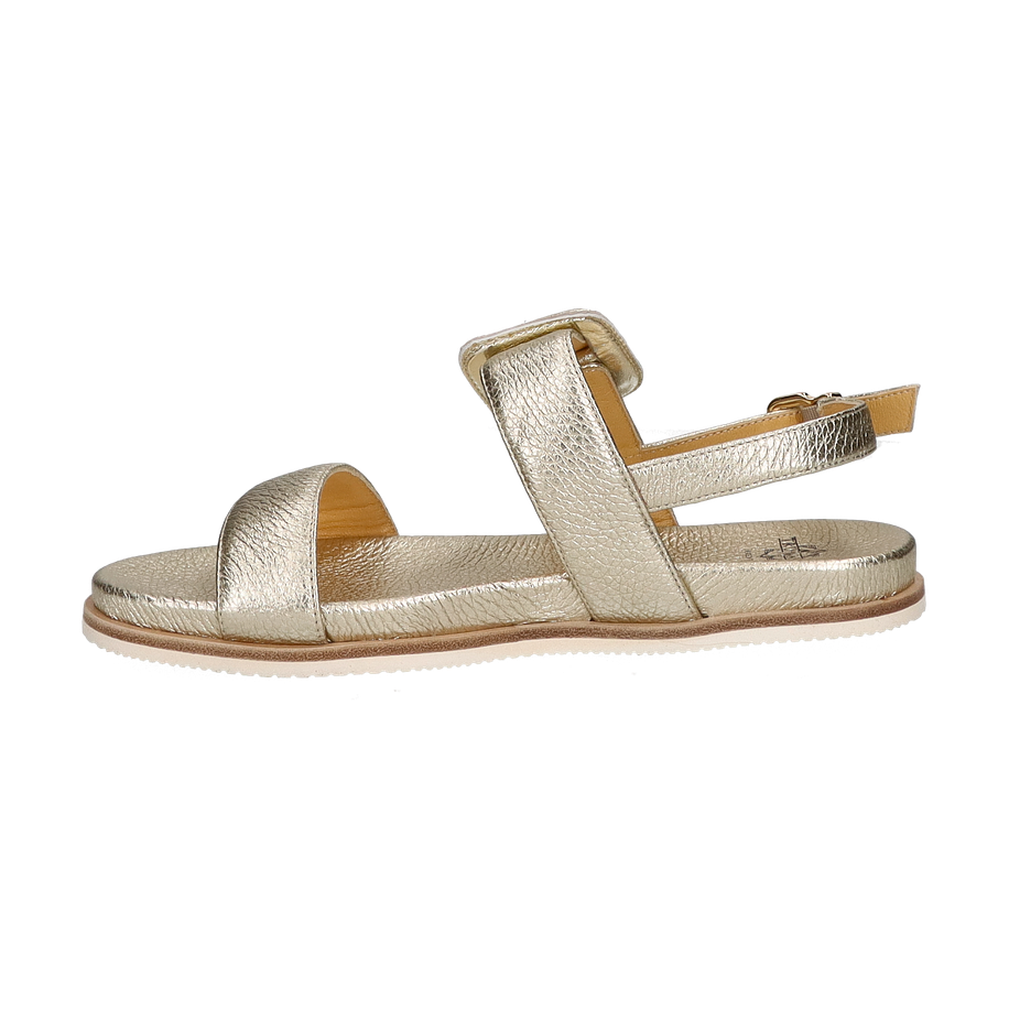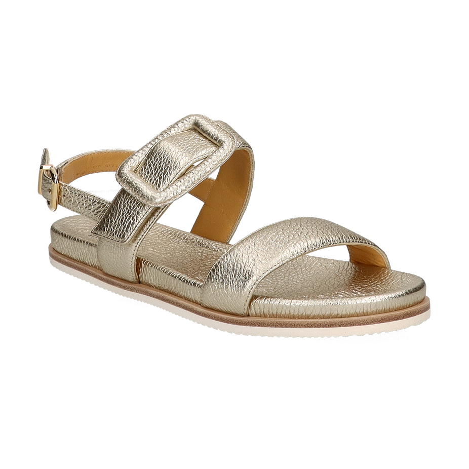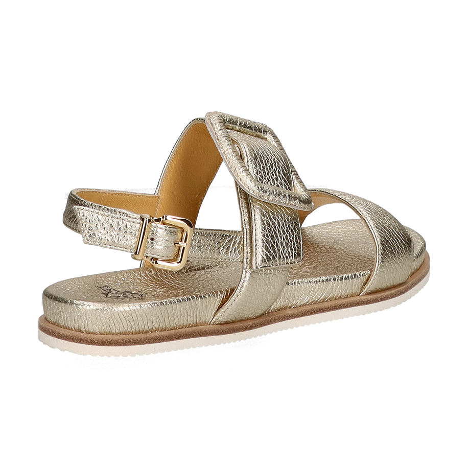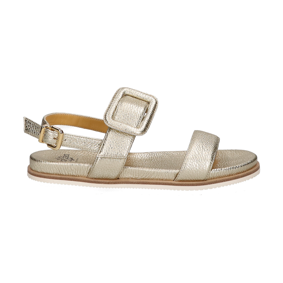 Diese eleganten Sandalen für Damen präsentieren sich in einem luxuriösen Goldton, der jedem Outfit einen Hauch von Glamour verleiht. Die feine Struktur des Leders verleiht den Sandalen nicht nur eine edle Optik, sondern auch eine angenehme Haptik. Der breite Riemen mit einer auffälligen Schnalle sorgt für einen sicheren Sitz und unterstreicht das stilvolle Design. Die flache Sohle bietet Komfort für den ganzen Tag, während der verstellbare Fersenriemen eine individuelle Passform gewährleistet.