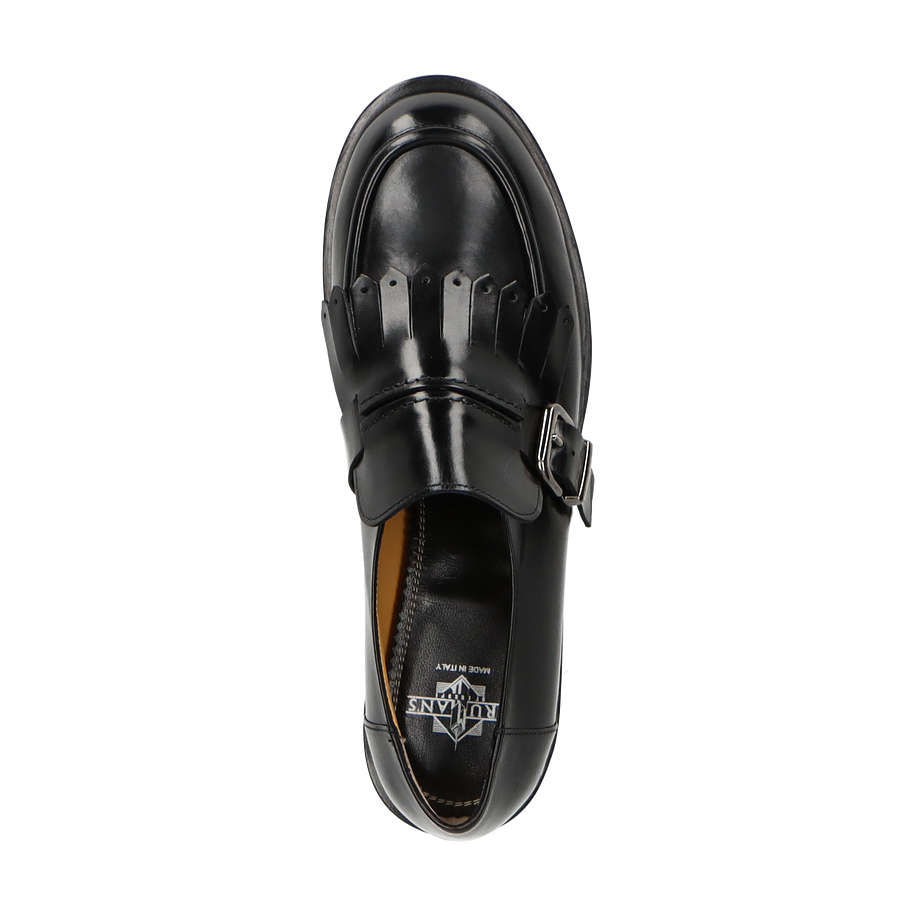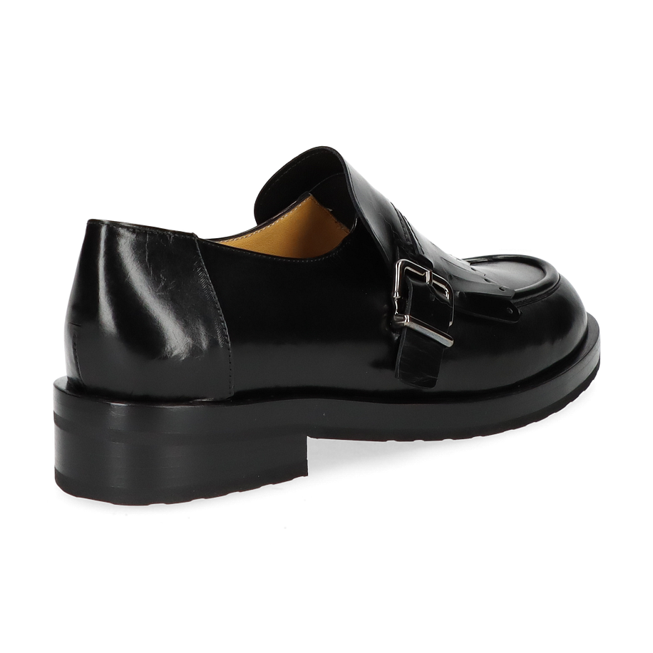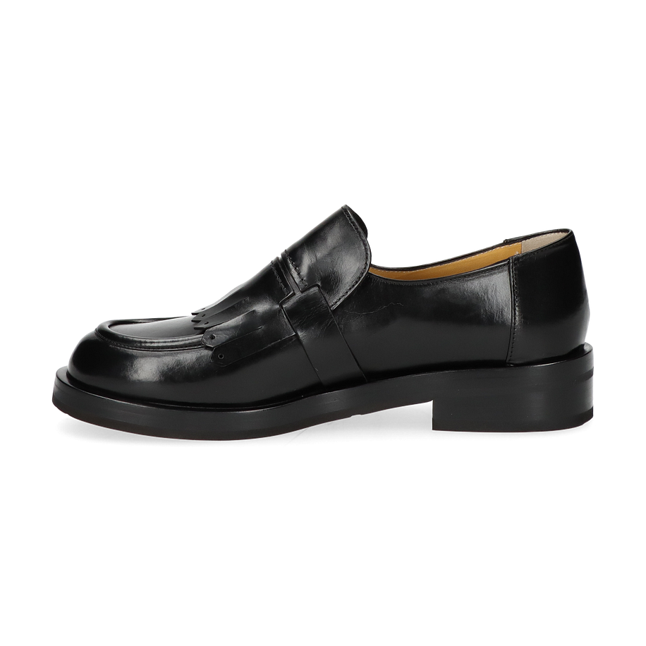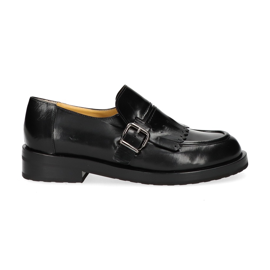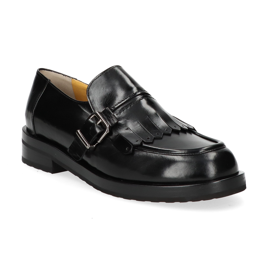 Entdecken Sie die eleganten schwarzen Slipper von Trumans, die für Damen entworfen wurden. Diese Schuhe vereinen klassischen Stil mit modernen Akzenten, wie die dekorative Schnalle und die stilvollen Fransen auf dem Obermaterial. Die glänzende Lederoberfläche verleiht dem Schuh eine luxuriöse Ausstrahlung, während die solide Verarbeitung für Langlebigkeit sorgt. Der dezente Absatz von 3 cm bietet eine angenehme Höhe, die Komfort und Stil perfekt kombiniert.