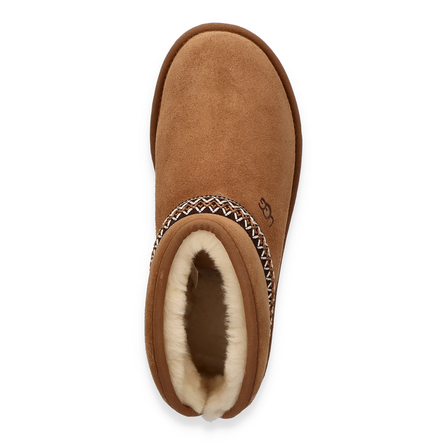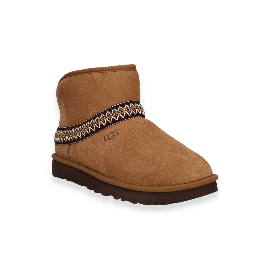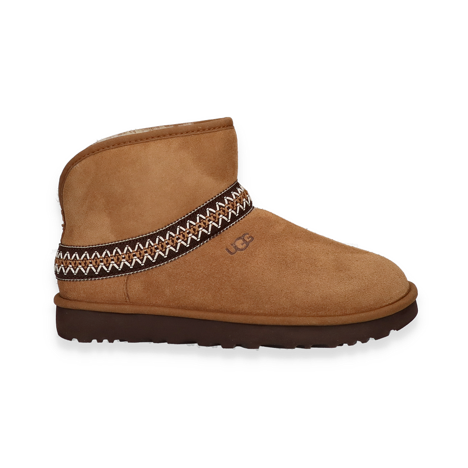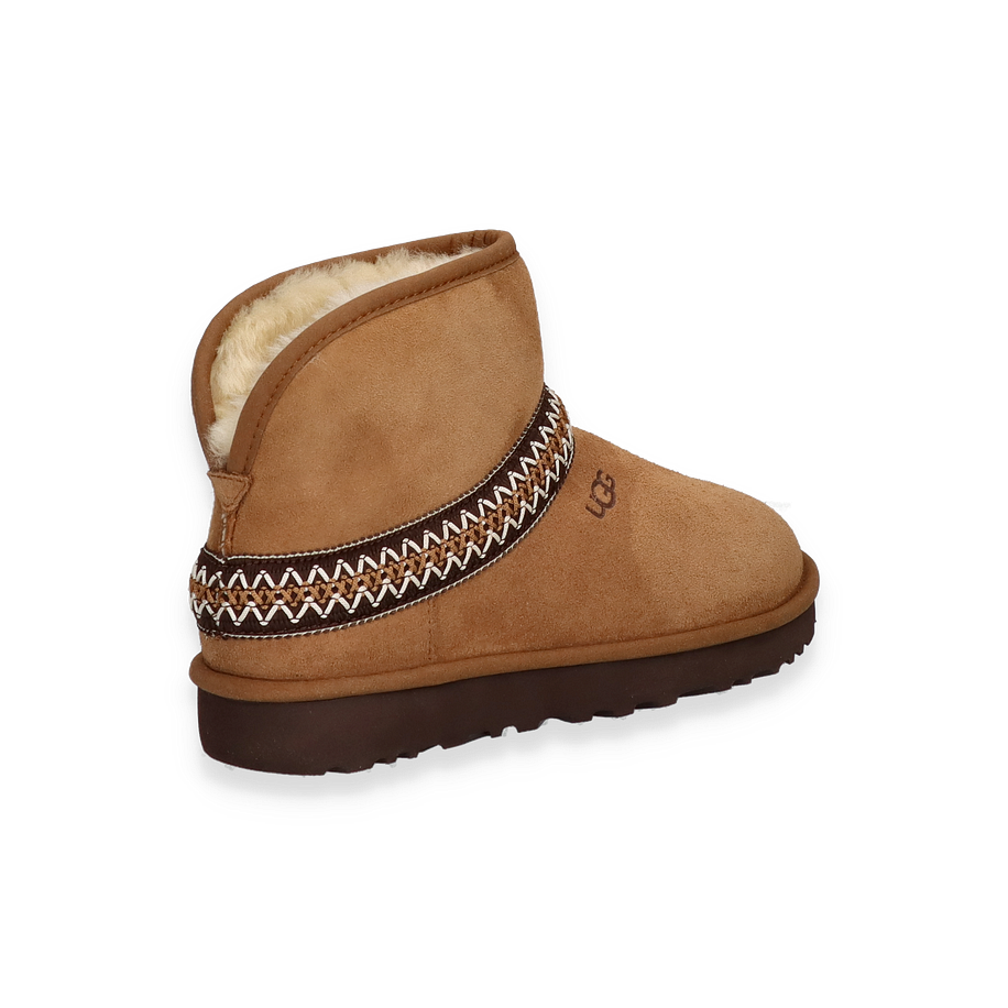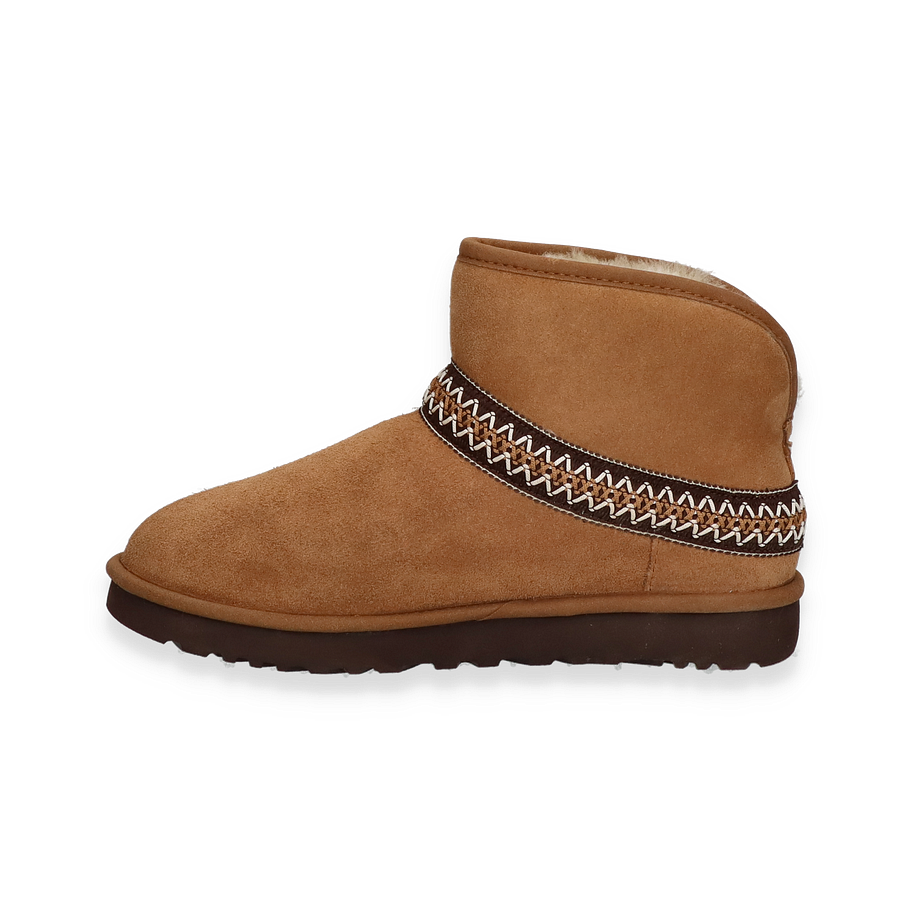 Der UGG CLASSIC MINI CRESCENT in der Farbe Chestnut präsentiert sich als stilvoller Winterstiefel für Damen. Das charakteristische Design wird durch ein elegantes Zickzack-Muster akzentuiert, das den Schaft umgibt und dem Schuh eine besondere Note verleiht. Der warme Farbton und die hochwertige Verarbeitung machen diesen Stiefel zu einem unverzichtbaren Begleiter für die kalte Jahreszeit.