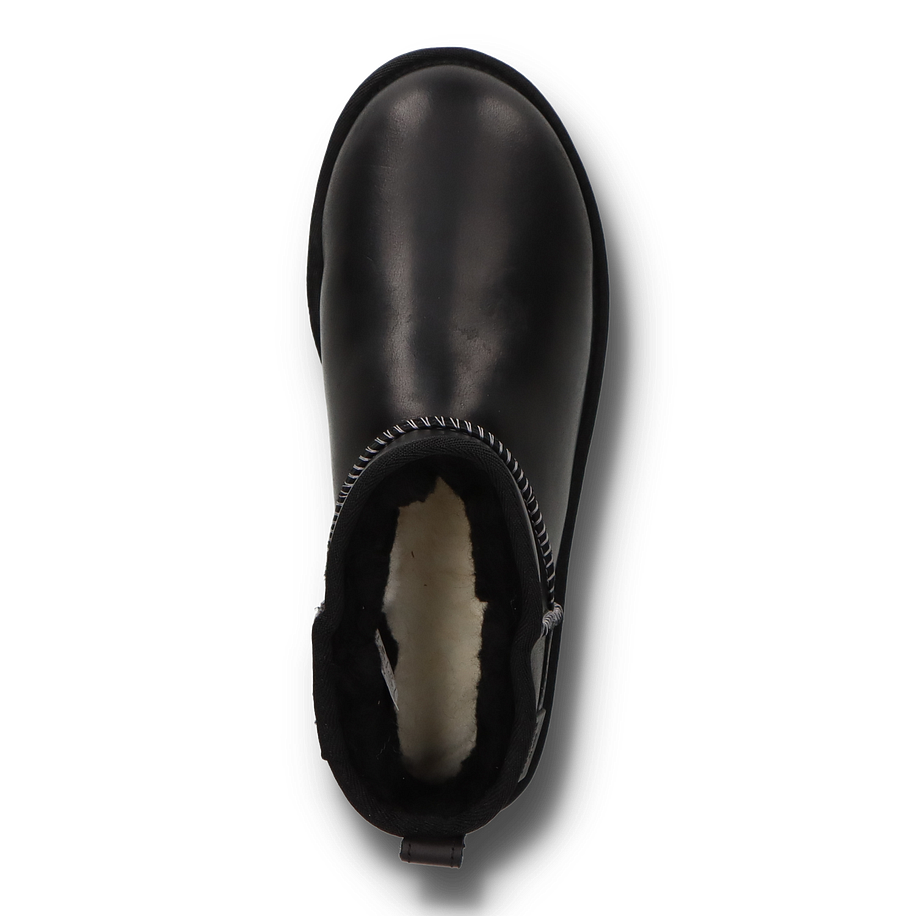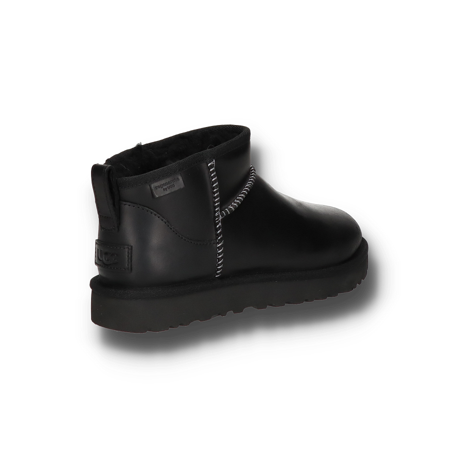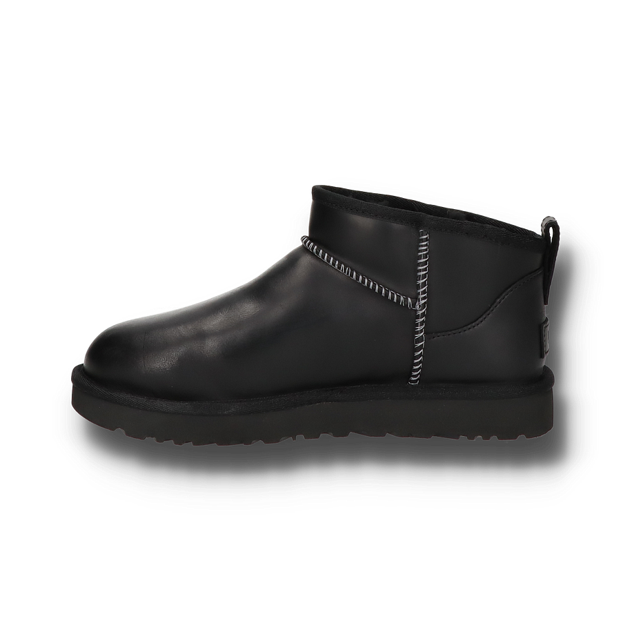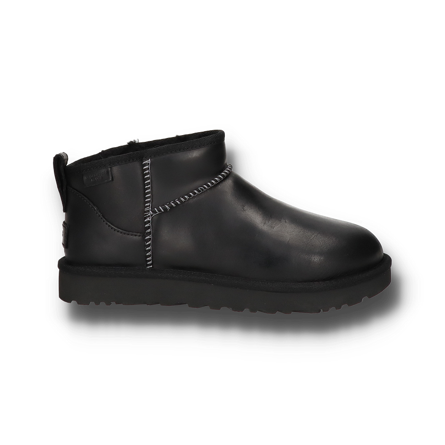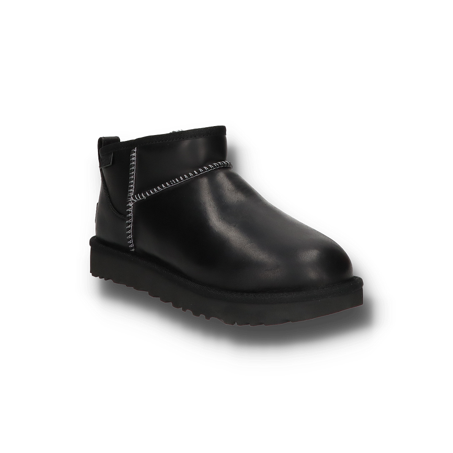 Der CLASSIC ULTRA MINI von UGG in elegantem Schwarz ist ein stilvoller Winterstiefel für Damen, der durch sein minimalistisches Design und die hochwertige Verarbeitung überzeugt. Das Obermaterial aus Leder verleiht dem Schuh eine edle Optik, während die kontrastierenden Nähte einen modernen Akzent setzen. Die kompakte Silhouette und die dezente Plateausohle machen diesen Stiefel zu einem vielseitigen Begleiter für kalte Tage. Dieser Winterstiefel bietet nicht nur Stil, sondern auch Komfort. Das Innenmaterial aus Textil und das Warmfutter sorgen für wohlige Wärme und ein angenehmes Tragegefühl. Die Textil-Innensohle und die Gummisohle bieten zusätzlichen Komfort und Halt. Mit einer Absatzhöhe von 3 cm und einer Plateauhöhe von 2,5 cm bietet der CLASSIC ULTRA MINI die perfekte Balance zwischen Eleganz und Funktionalität. Ideal für den täglichen Gebrauch und lange Winterspaziergänge.